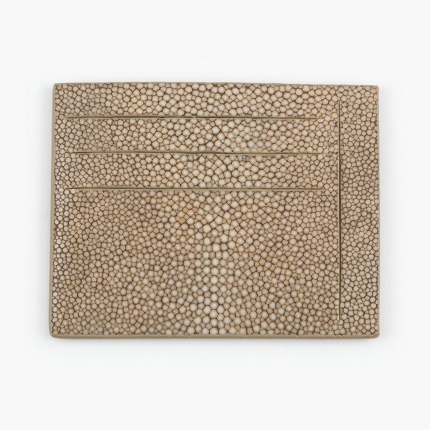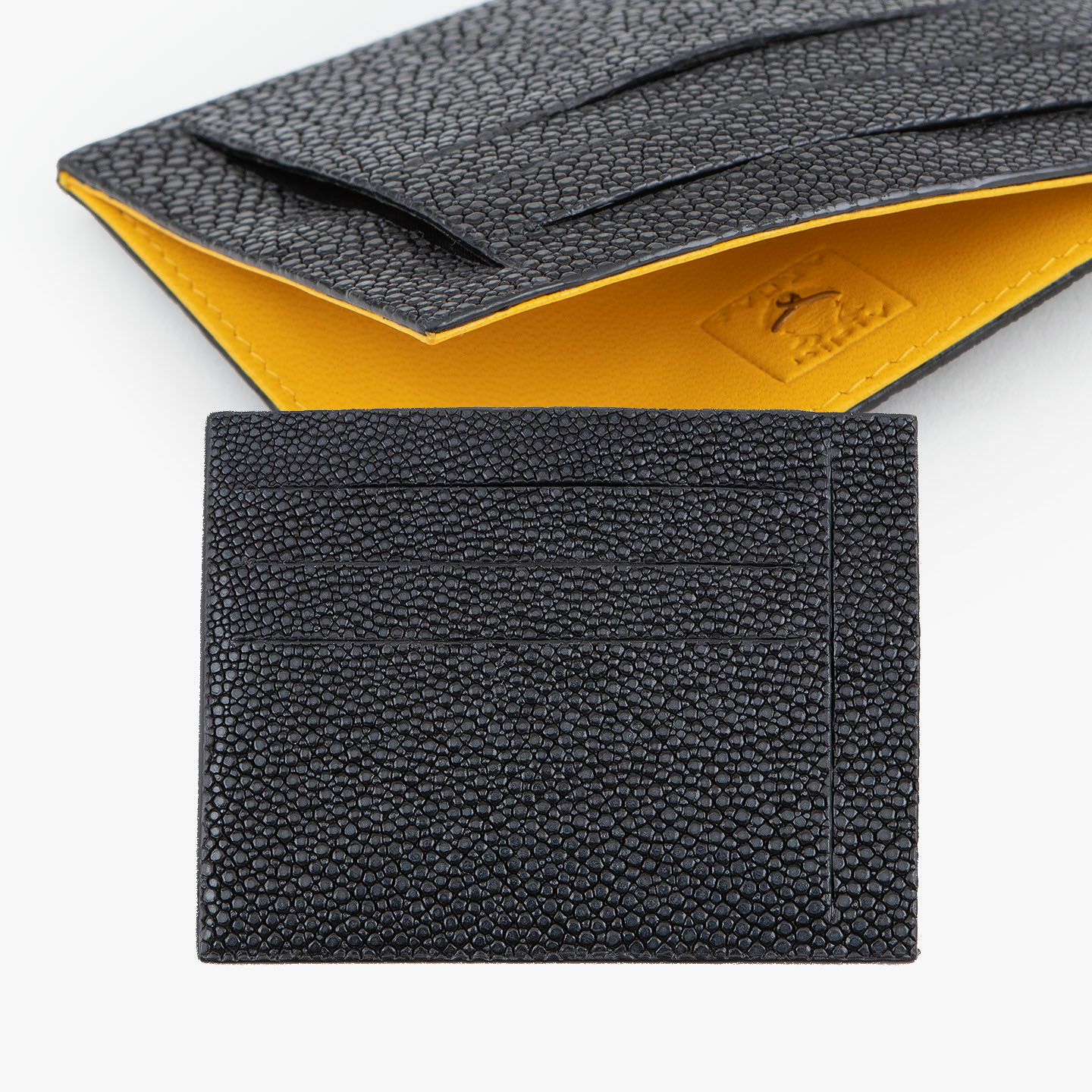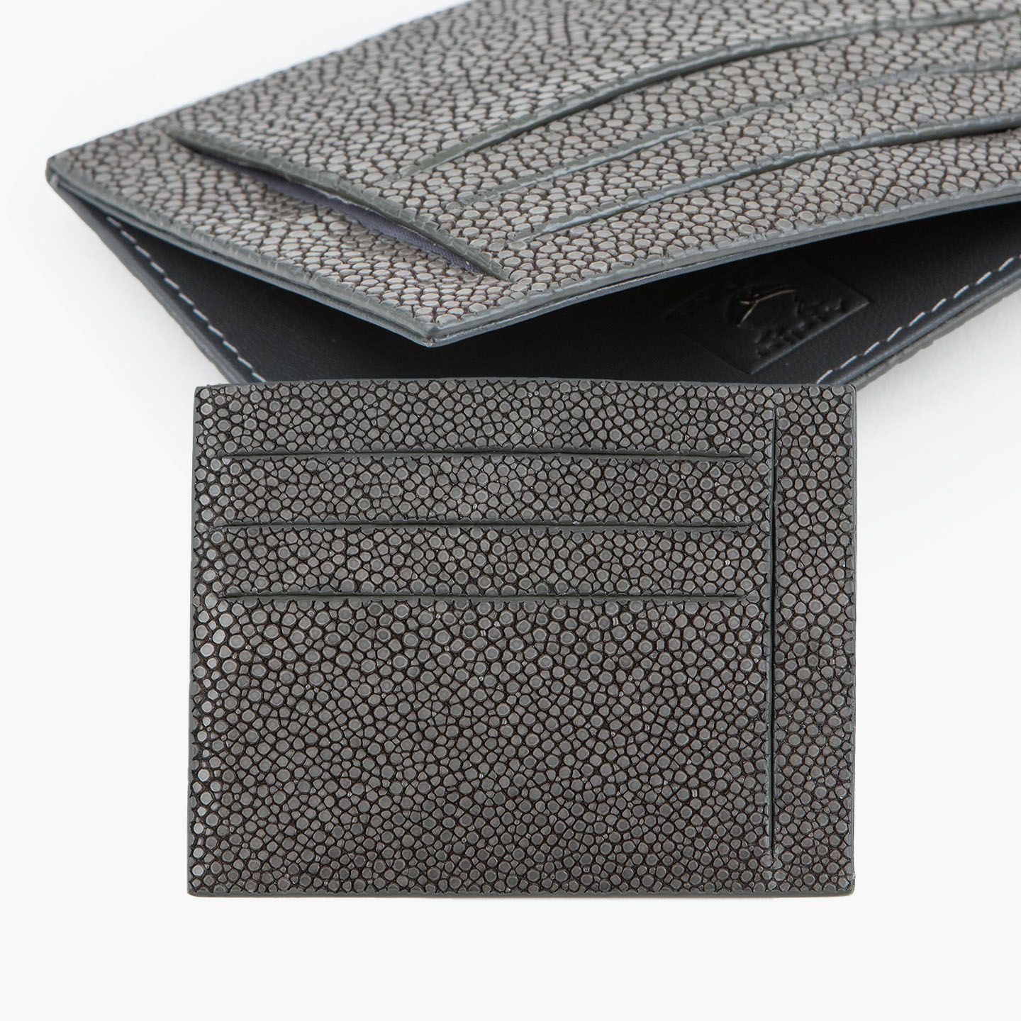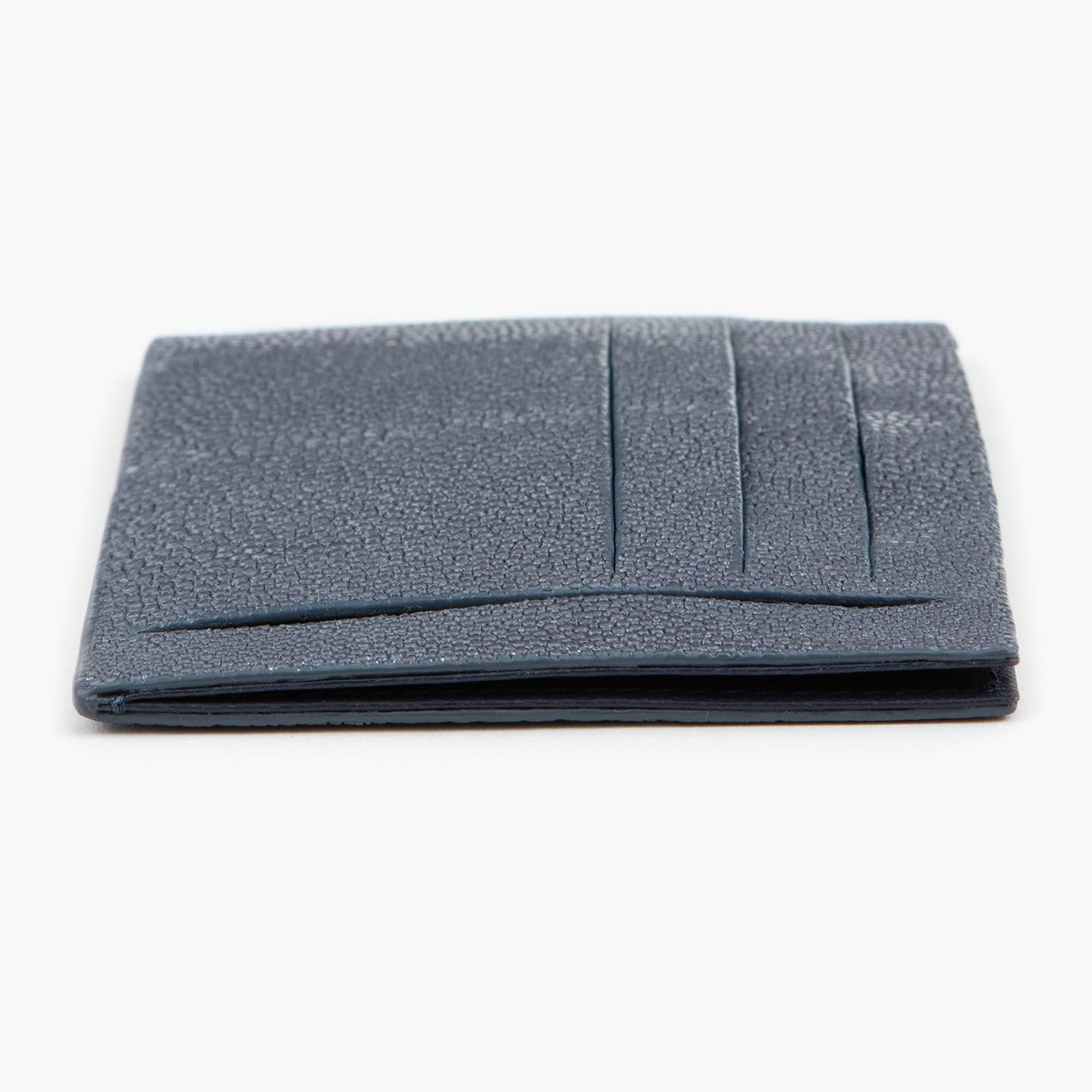 コンセプトに“Cuirs D'ailleurs 〜旅するレザー〜”を掲げ、他の人たちとは違った美学によるクールで洒落た人生の旅へと誘う、ブランド『Atelier AKNAS』のスリット札ばさみ。美しく覆っているガラスビーズを散りばめたような小さな鱗と、地中海の潮風を指先で感じるような冷んやりとした感触が魅力的な「ガルーシャ」を、外装として纏わせ贅沢感を演出。その両サイドに、無縫製の切り込みでフラットに仕立てたカードポケット各3つ(計6つ)・スリット式フリーポケット各1つ(計2つ)を備え、二つ折りの紙幣を簡単に差し込んで10枚ほど収納できる札入れとともに、金具を排したスリム&スマートな使用感をもたらしてくれる。