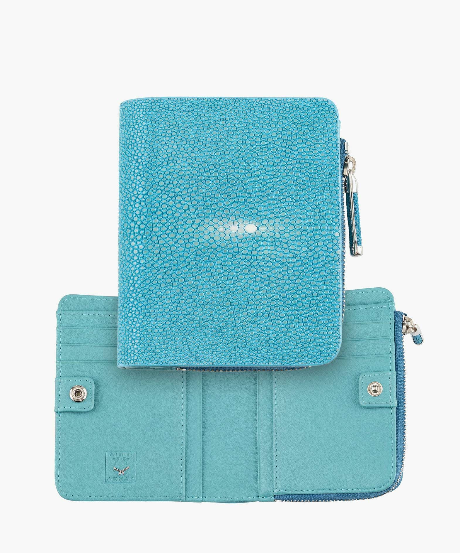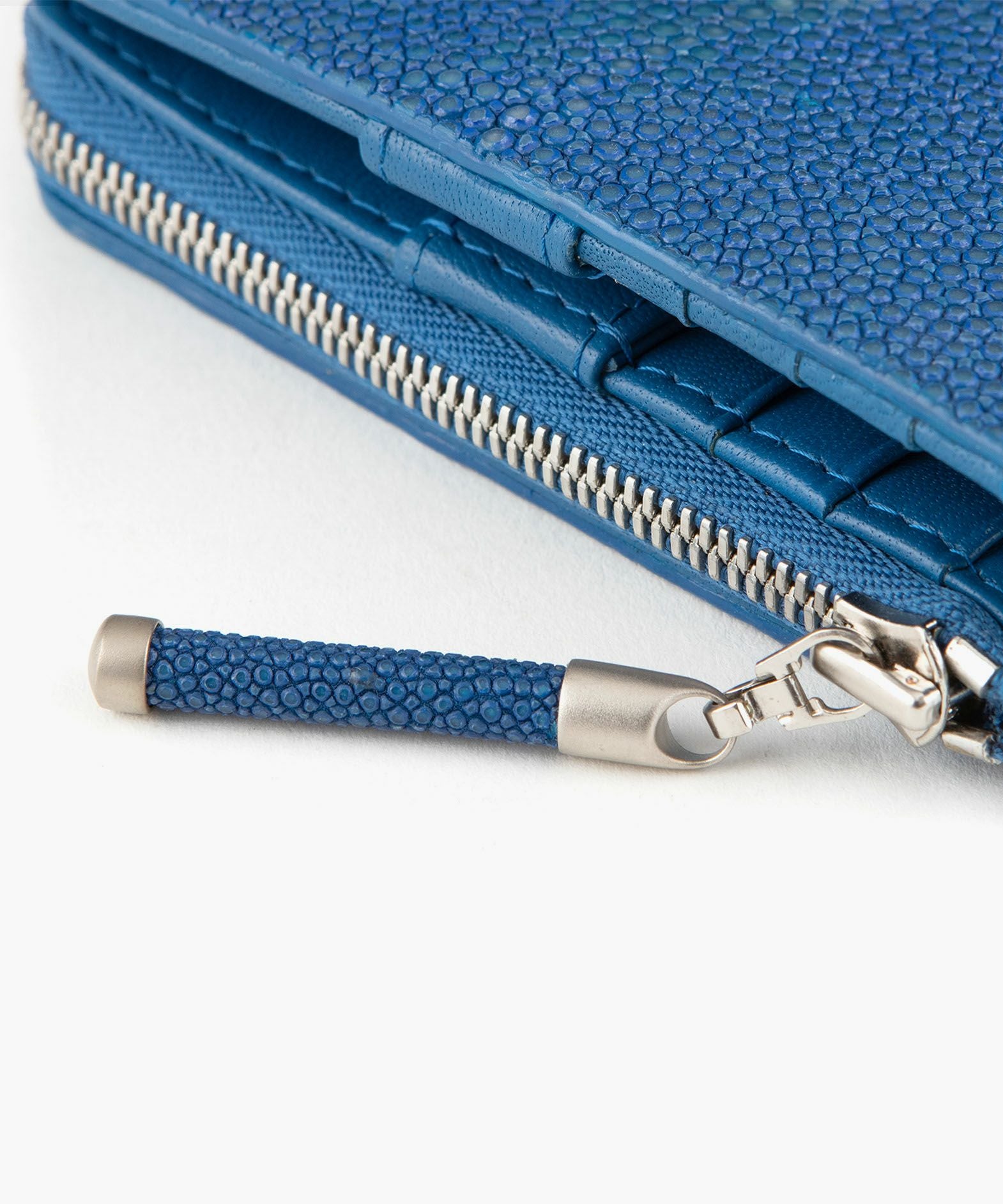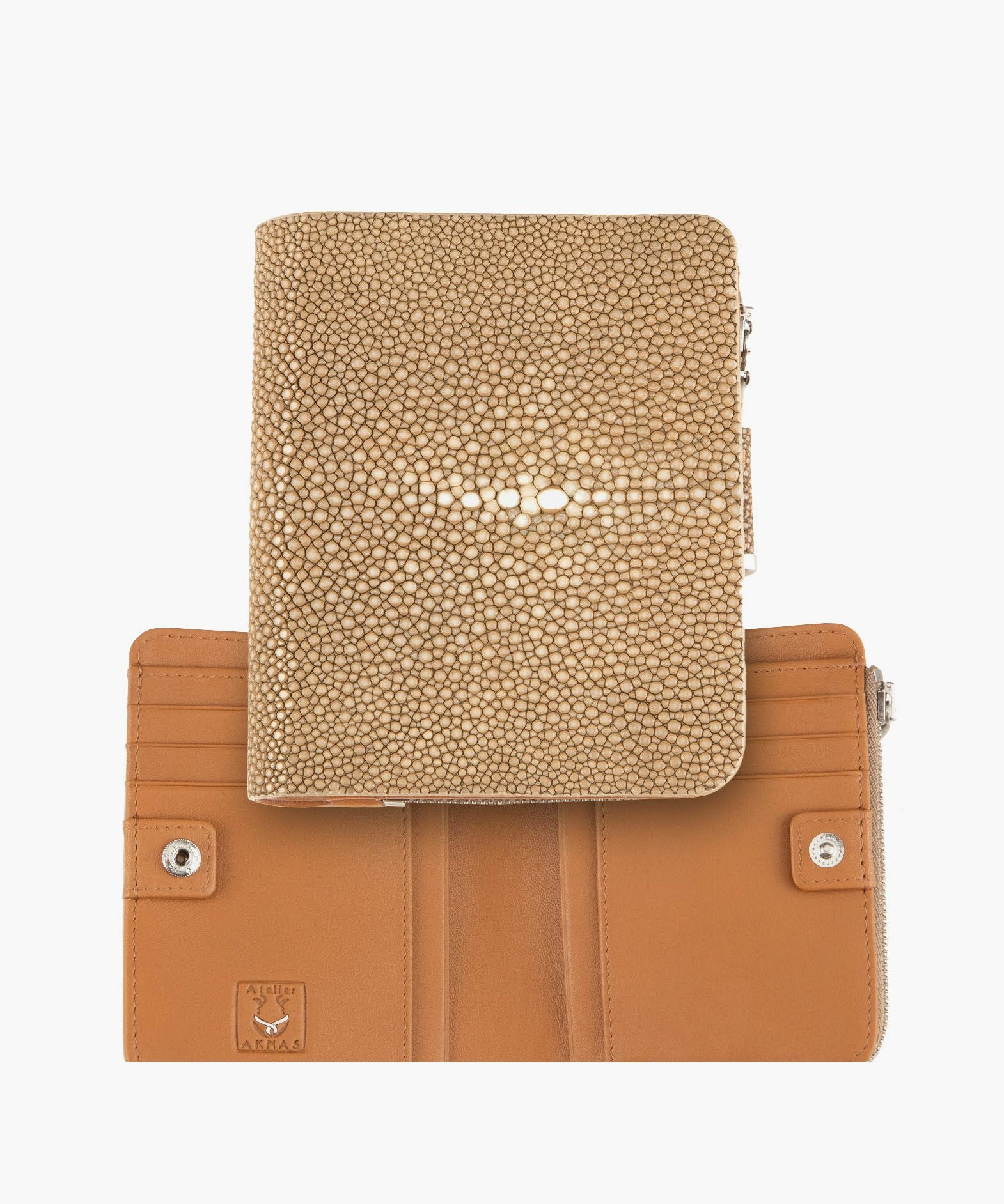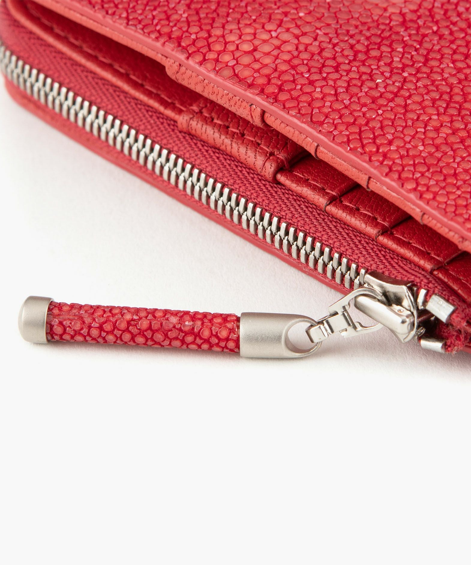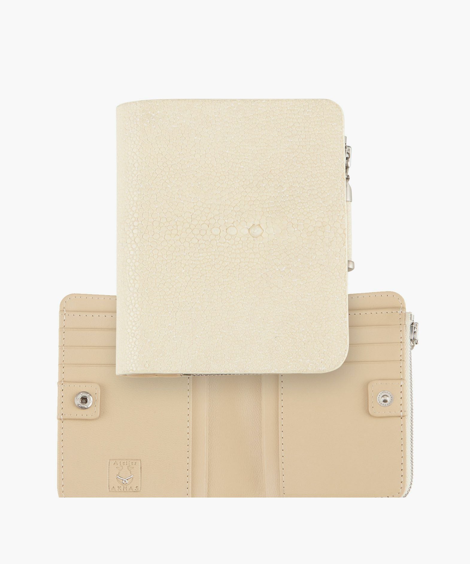 クールで洒落た人生の旅へと誘っていく、“Cuirs D'ailleurs 〜旅するレザー〜”をコンセプトにしている、ブランド『Atelier AKNAS』のミドルウォレット。ジェンダーレスで好まれるラウンドフォルムに、ガラスビーズを散りばめたようなアカエイの小さな鱗が美しい、海の宝石「ガルーシャ」を外装として贅沢に纏わせ、地中海の潮風を指先で感じるような冷んやりとした感触も魅力的。オリジナルの引き手とともにデザインのアクセントにもなっているL字ファスナー式小銭入れのほか、札入れ1つ・フリーポケット4つ・カードポケット6つも備えている充実した収納力で、普段使いにおける機能美へのこだわりも感じさせてくれる。