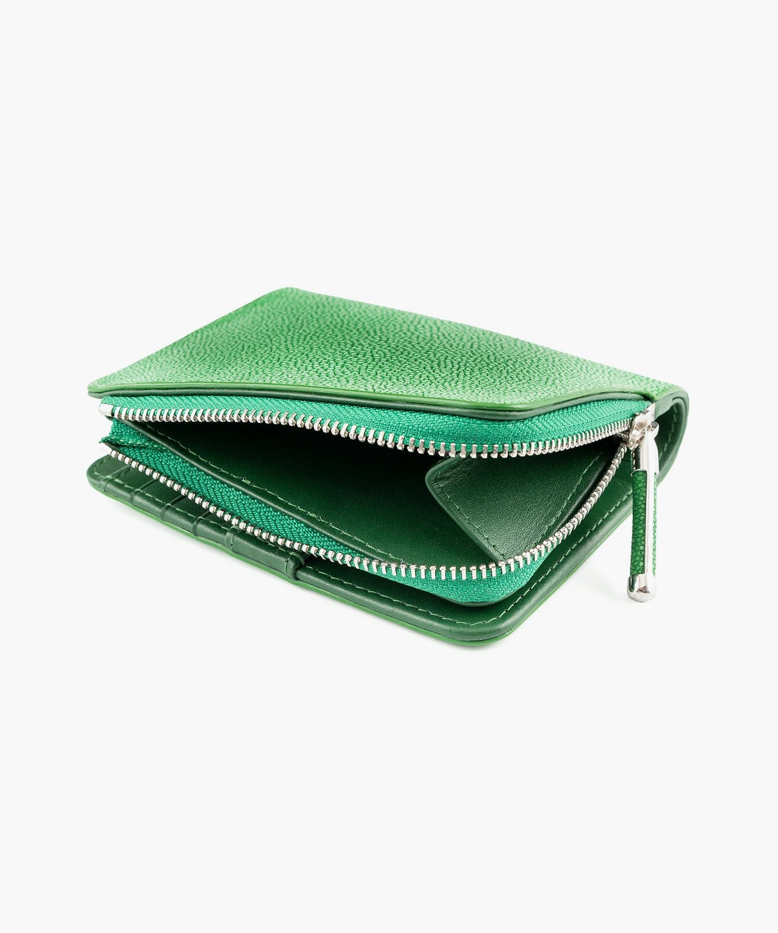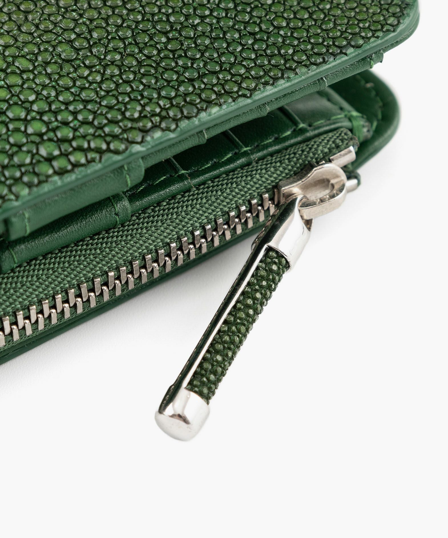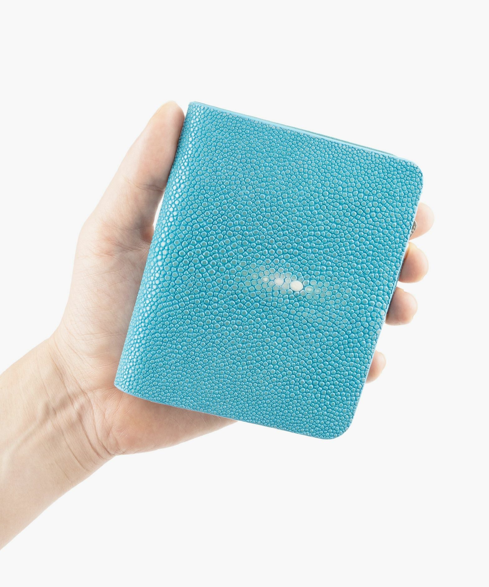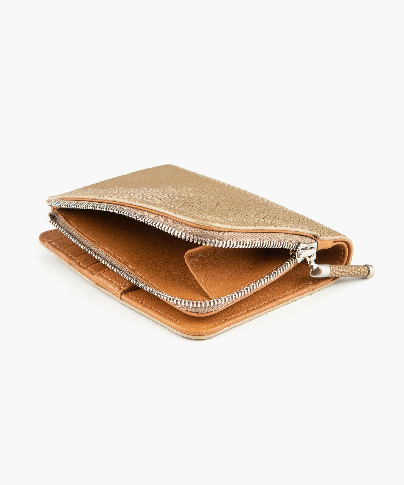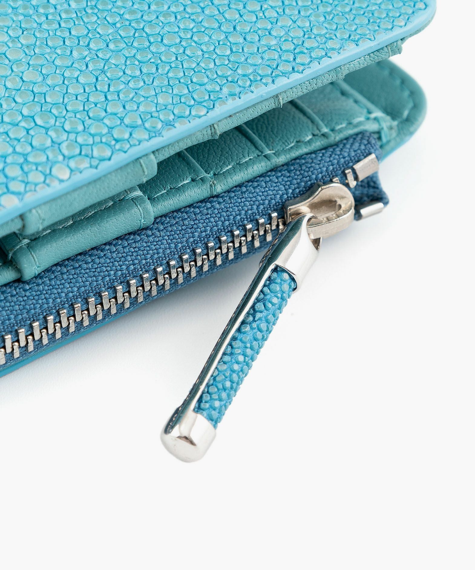 クールで洒落た人生の旅へと誘っていく、“Cuirs D'ailleurs 〜旅するレザー〜”をコンセプトにしている、ブランド『Atelier AKNAS』のミドルウォレット。ジェンダーレスで好まれるラウンドフォルムに、ガラスビーズを散りばめたようなアカエイの小さな鱗が美しい、海の宝石「ガルーシャ」を外装として贅沢に纏わせ、地中海の潮風を指先で感じるような冷んやりとした感触も魅力的。オリジナルの引き手とともにデザインのアクセントにもなっているL字ファスナー式小銭入れのほか、札入れ1つ・フリーポケット4つ・カードポケット6つも備えている充実した収納力で、普段使いにおける機能美へのこだわりも感じさせてくれる。