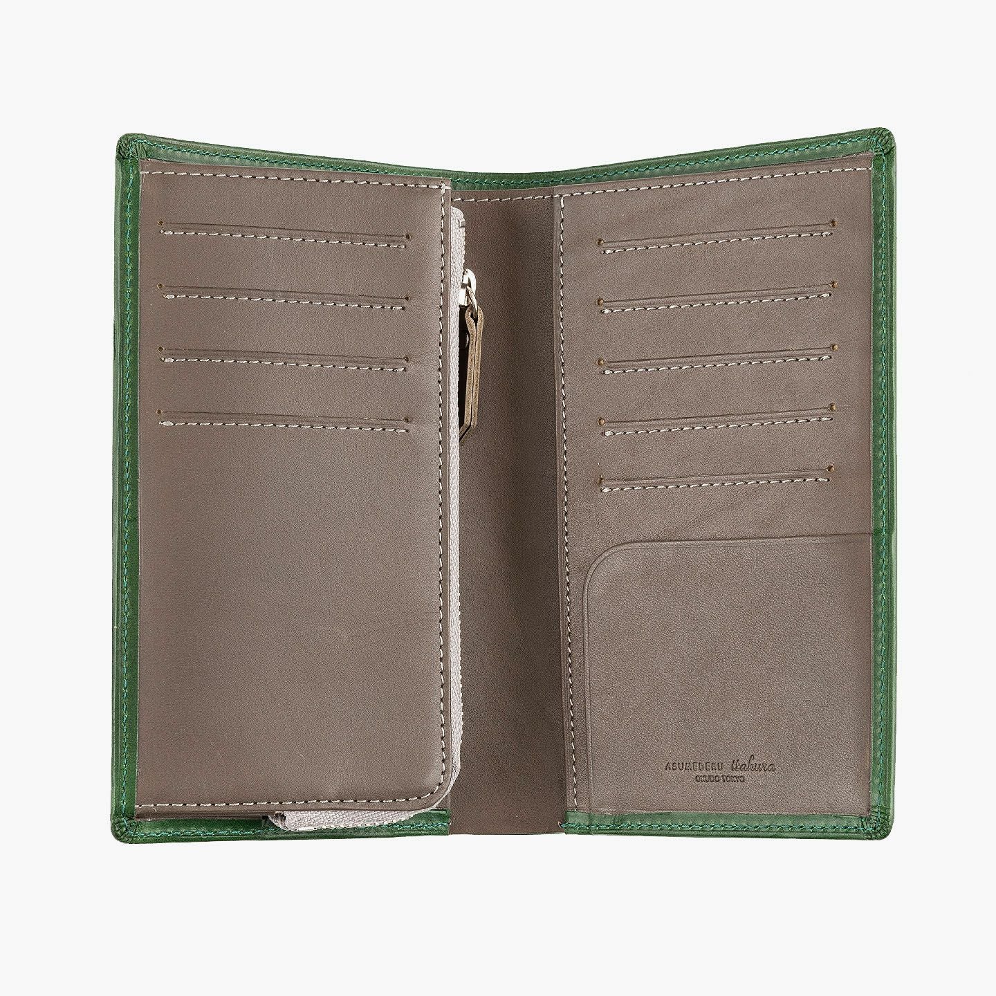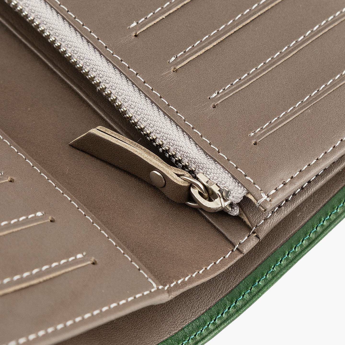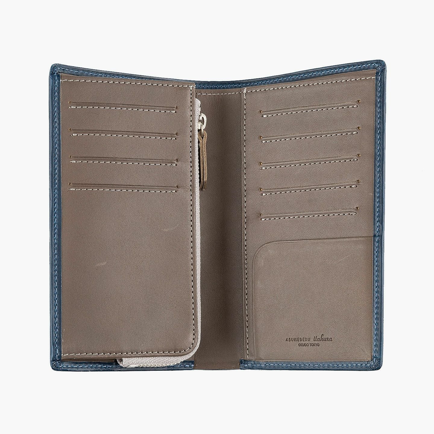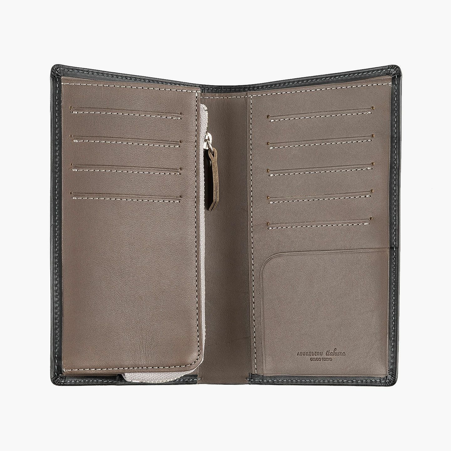 「楽しさ」「楽さ」をコンセプトに、自由で独創的なアイデアを実践し、財布をはじめ革製品の常識を変えていきたいブランド『ASUMEDERU』のミディアムウォレット。パンツのポケットへ絶妙に収まるサイズ感や、手帳や文庫本カバーを想わせるスタイリッシュなデザイン、ICカードの収納に適した切り込みフラップ付きポケットによる外装を、イタリア・ワルビエ社の最高級ヌメ革「ブッテーロ」が、新鮮なツヤ感で引き立てながら魅了。国産牛革「オイルダコタ」のグレーによる内装を、少しL字にさせて使いやすいファスナーポケットが、印象的なステッチラインとともにアクセントになり、感性あふれる大人感を創出してくれる。