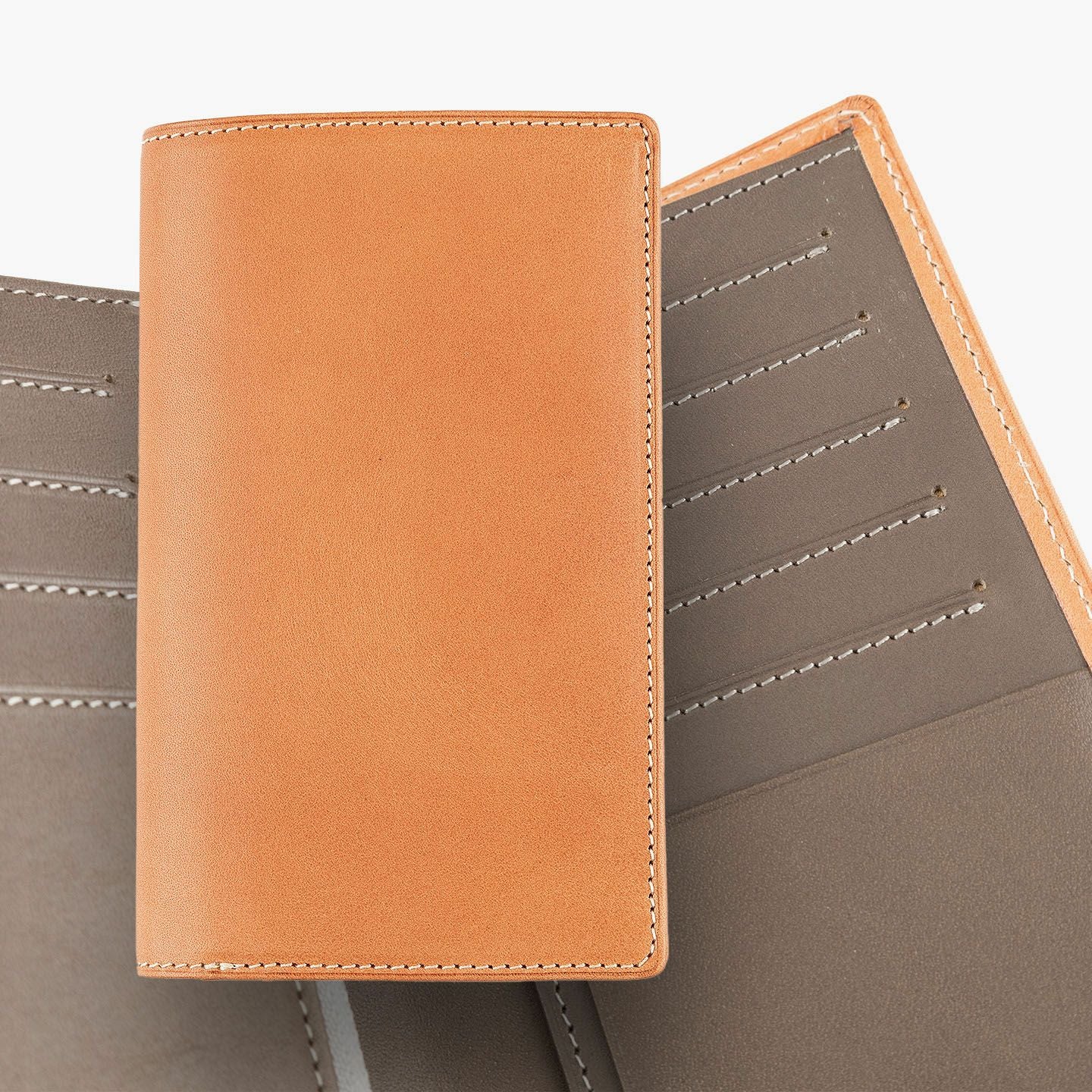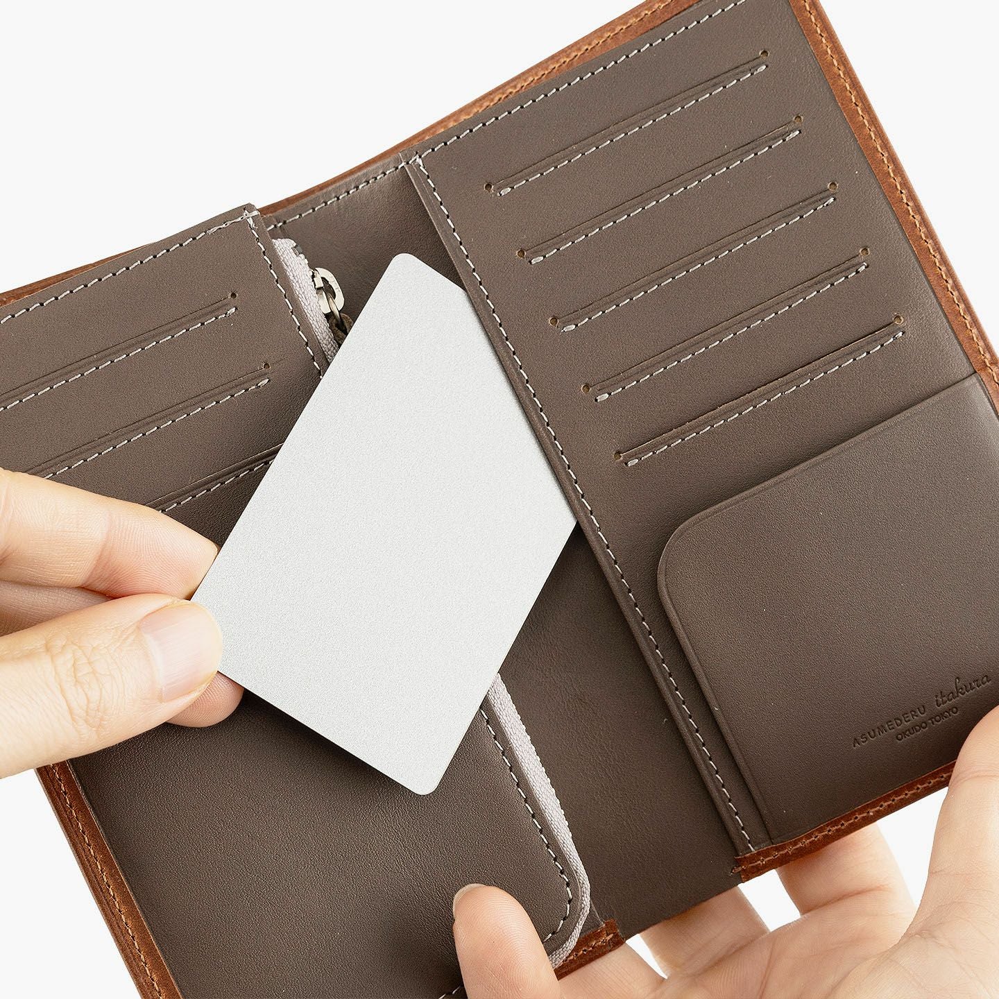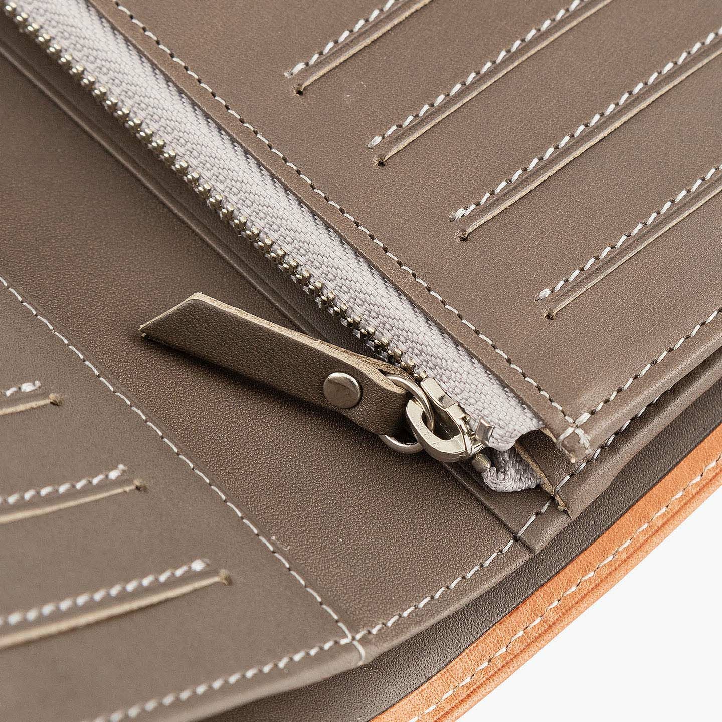 「楽しさ」「楽さ」をコンセプトに、自由で独創的なアイデアを実践し、財布をはじめ革製品の常識を変えていきたいブランド『ASUMEDERU』のミディアムウォレット。パンツのポケットへ絶妙に収まるサイズ感や、手帳や文庫本カバーを想わせるスタイリッシュなデザイン、ICカードの収納に適した切り込みフラップ付きポケットによる外装を、イタリア・ワルビエ社の最高級ヌメ革「ブッテーロ」が、新鮮なツヤ感で引き立てながら魅了。国産牛革「オイルダコタ」のグレーによる内装を、少しL字にさせて使いやすいファスナーポケットが、印象的なステッチラインとともにアクセントになり、感性あふれる大人感を創出してくれる。