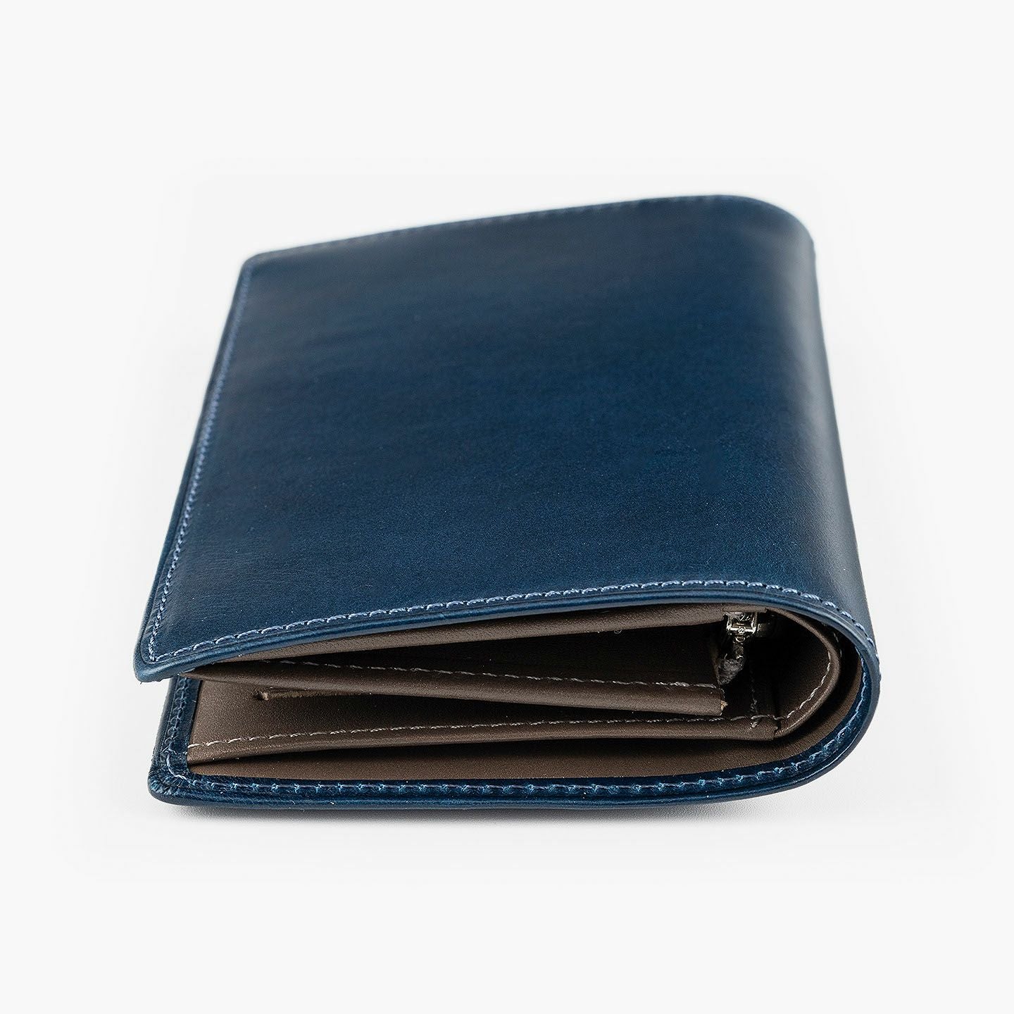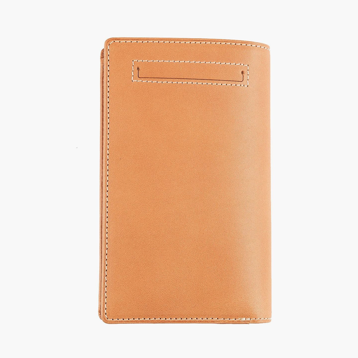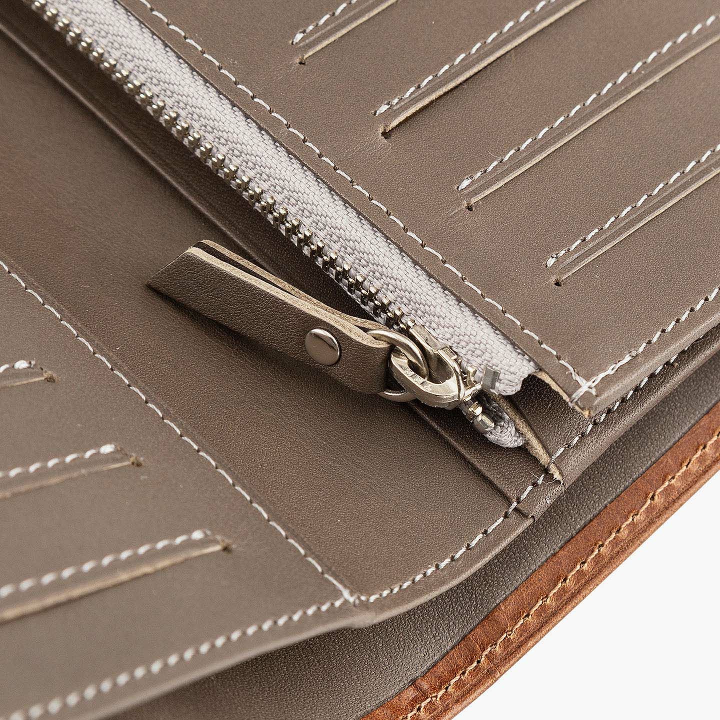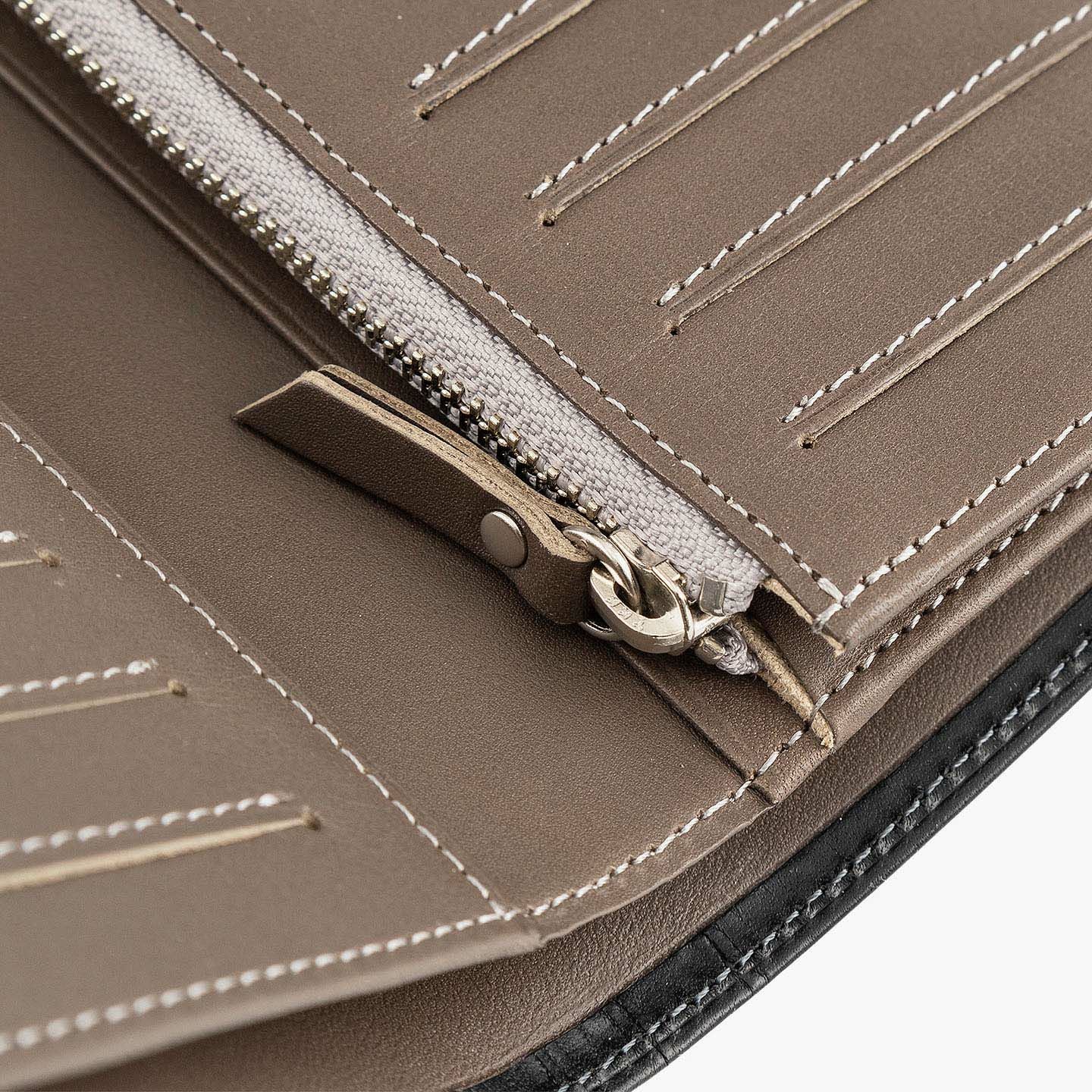 「楽しさ」「楽さ」をコンセプトに、自由で独創的なアイデアを実践し、財布をはじめ革製品の常識を変えていきたいブランド『ASUMEDERU』のミディアムウォレット。パンツのポケットへ絶妙に収まるサイズ感や、手帳や文庫本カバーを想わせるスタイリッシュなデザイン、ICカードの収納に適した切り込みフラップ付きポケットによる外装を、イタリア・ワルビエ社の最高級ヌメ革「ブッテーロ」が、新鮮なツヤ感で引き立てながら魅了。国産牛革「オイルダコタ」のグレーによる内装を、少しL字にさせて使いやすいファスナーポケットが、印象的なステッチラインとともにアクセントになり、感性あふれる大人感を創出してくれる。