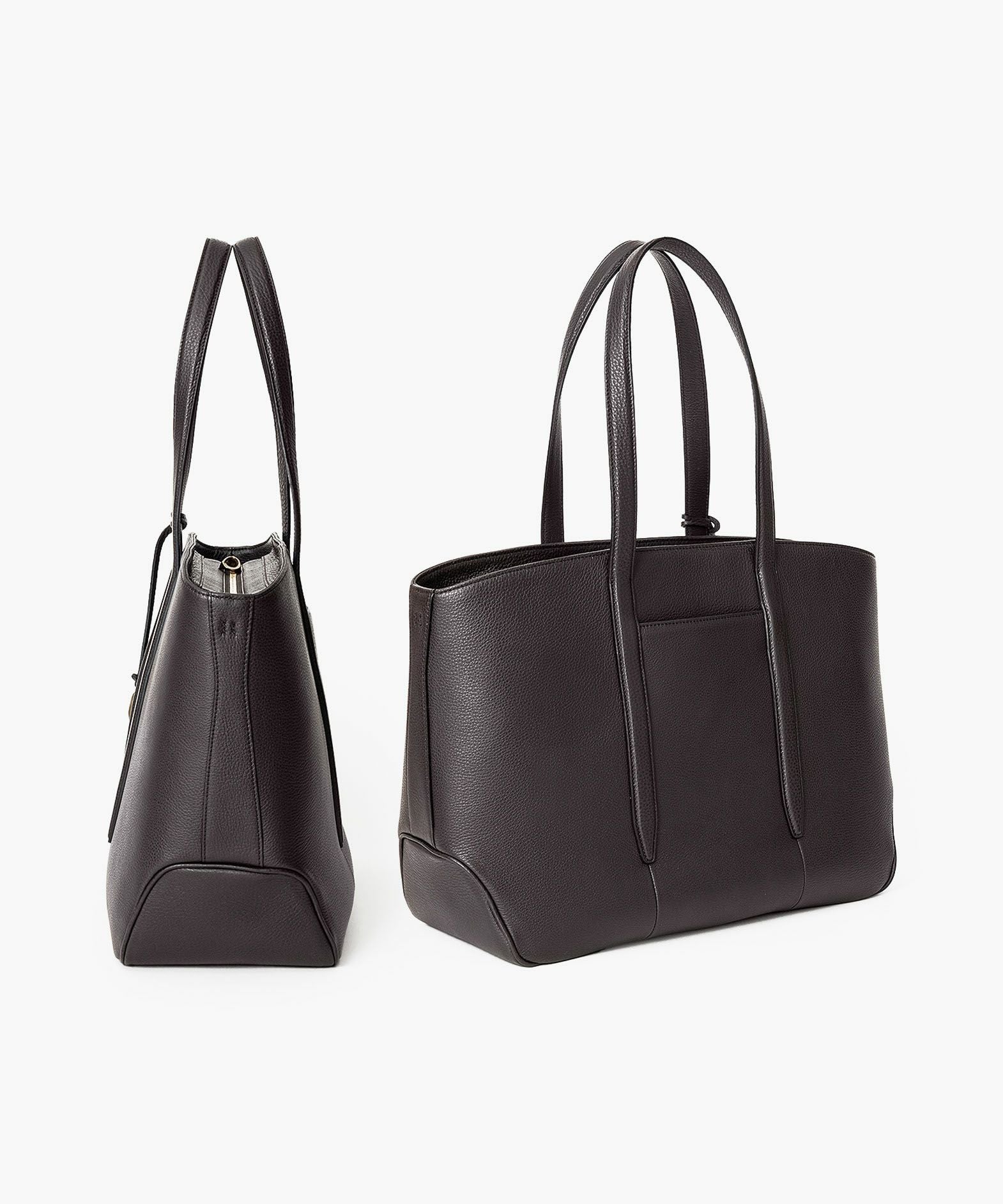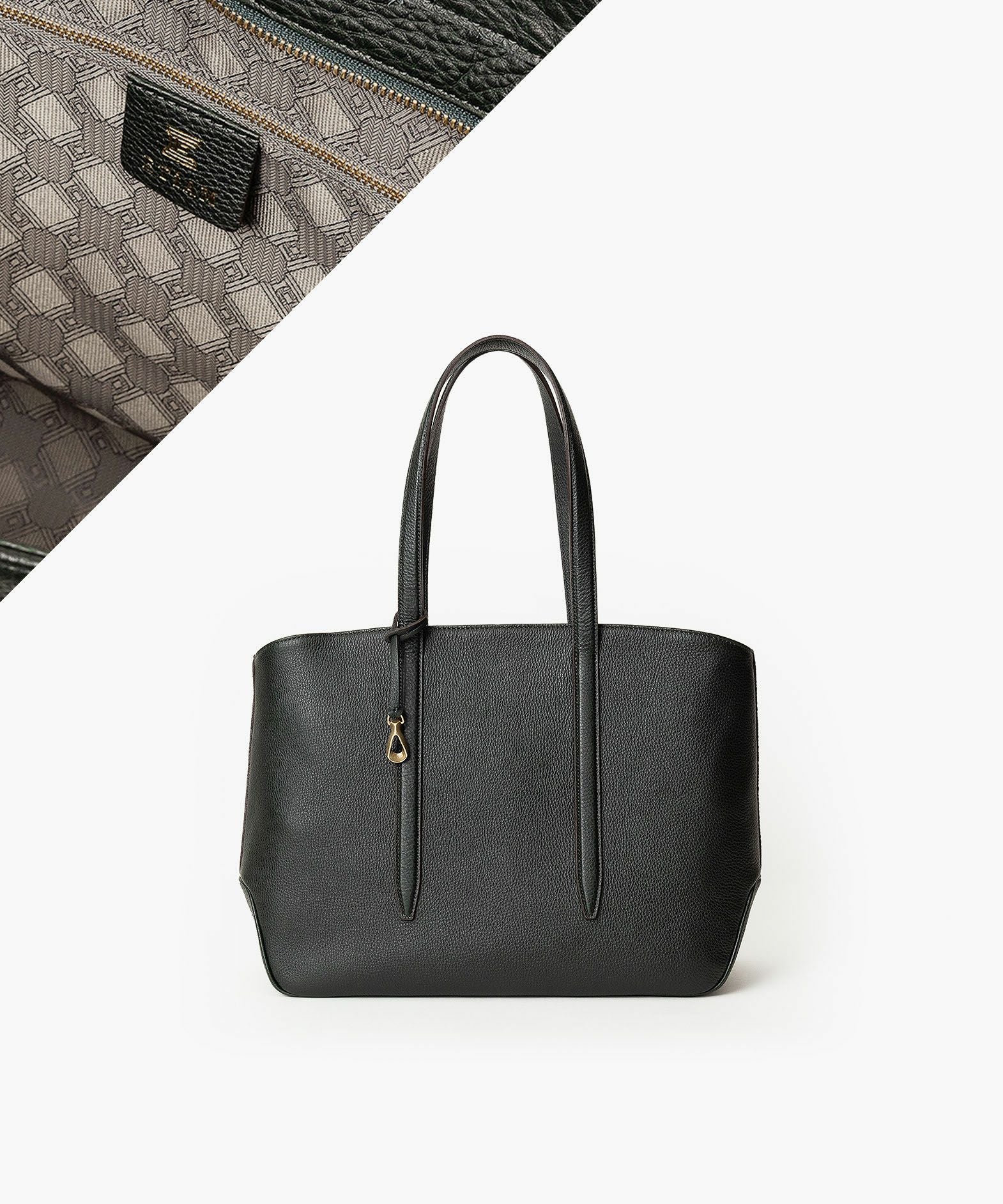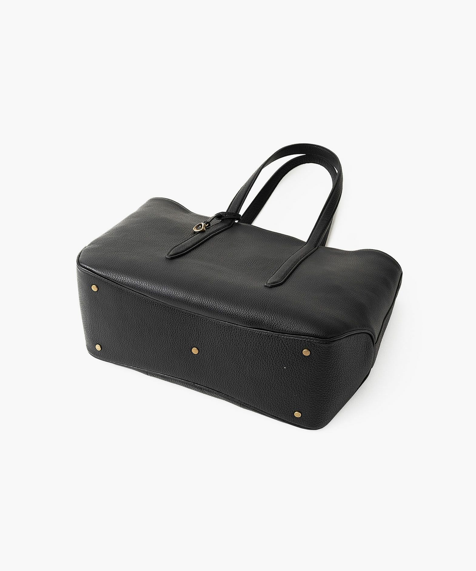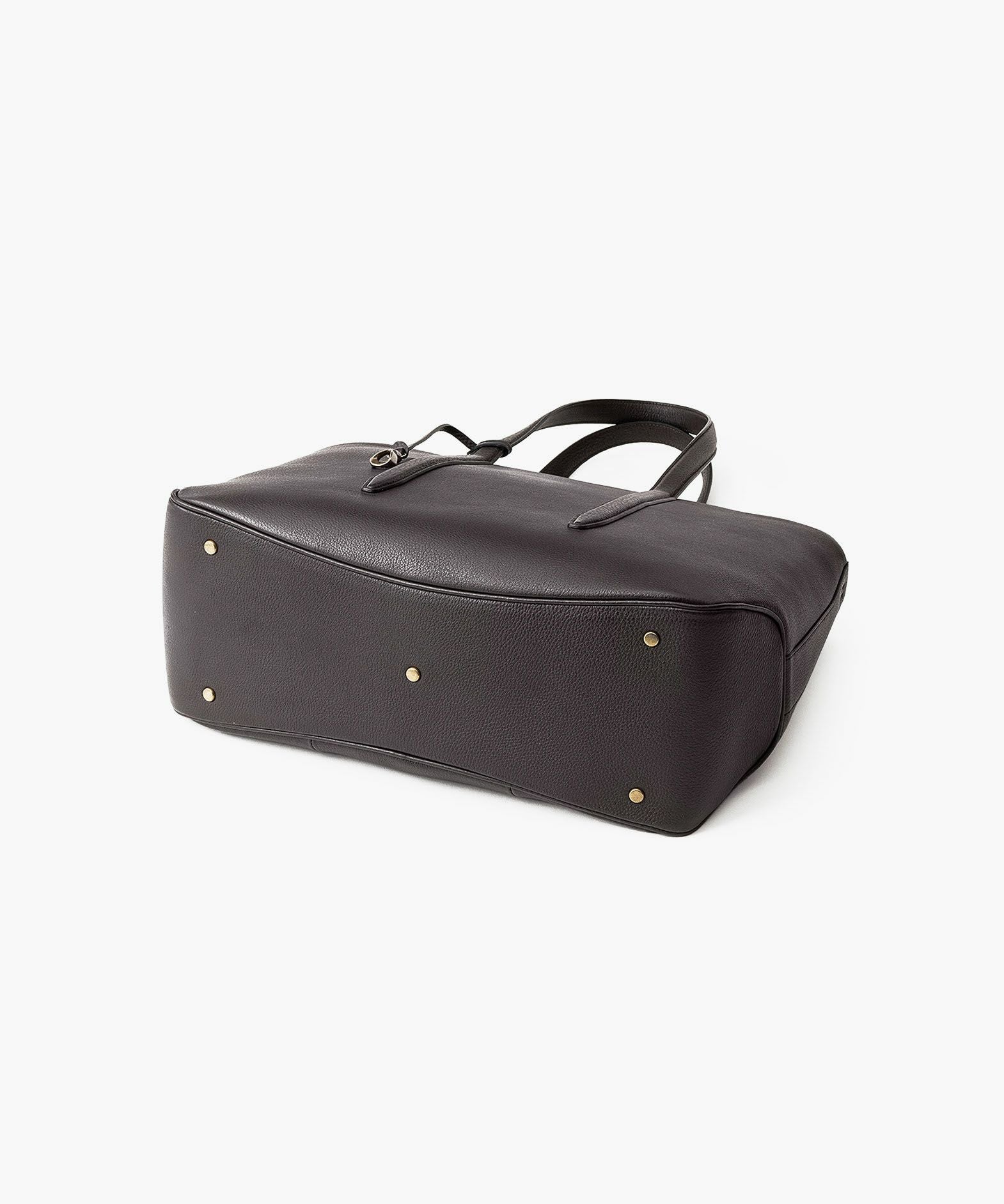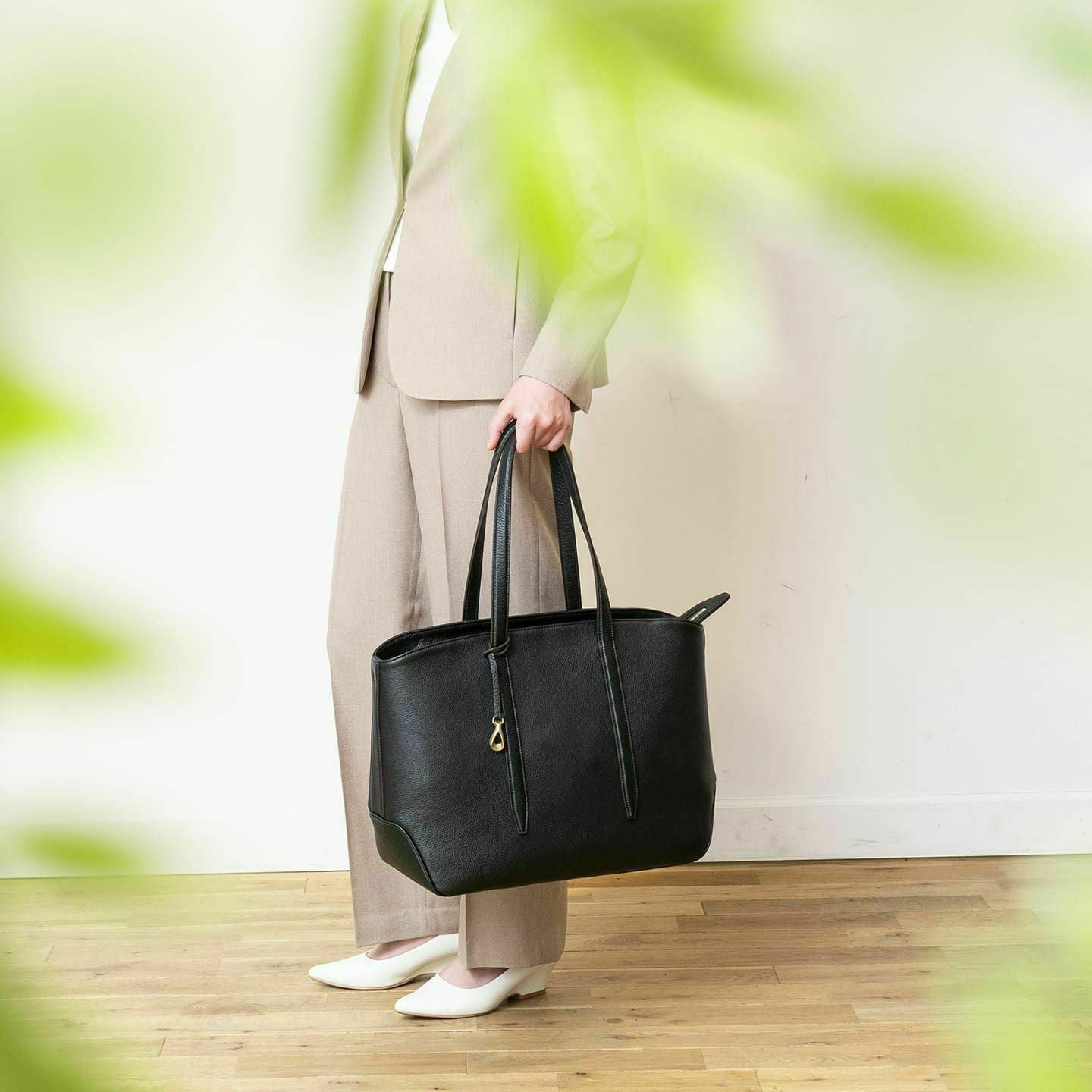 ファスナー開閉式で、B4サイズ・15インチのノートパソコンが収納可能。マチを内側に折り畳んでコンパクトにすることができ、用途に合わせて2通りのシルエット・サイズを楽しめます。また、バッグの上部を、左右のマチに向かって下がっていくラインにすることで、マチを内側に折り畳んでも天ファスナーがぶつからない機能性と、個性的でエレガントな見た目の美しさを両立。さらに、くびれをセンターに施した底マチは、肩掛けするときに体にフィットしてスムーズに持ち歩ける実用性と、独特のライン&フォルムがアクセントになるデザイン性を兼ね備えています。