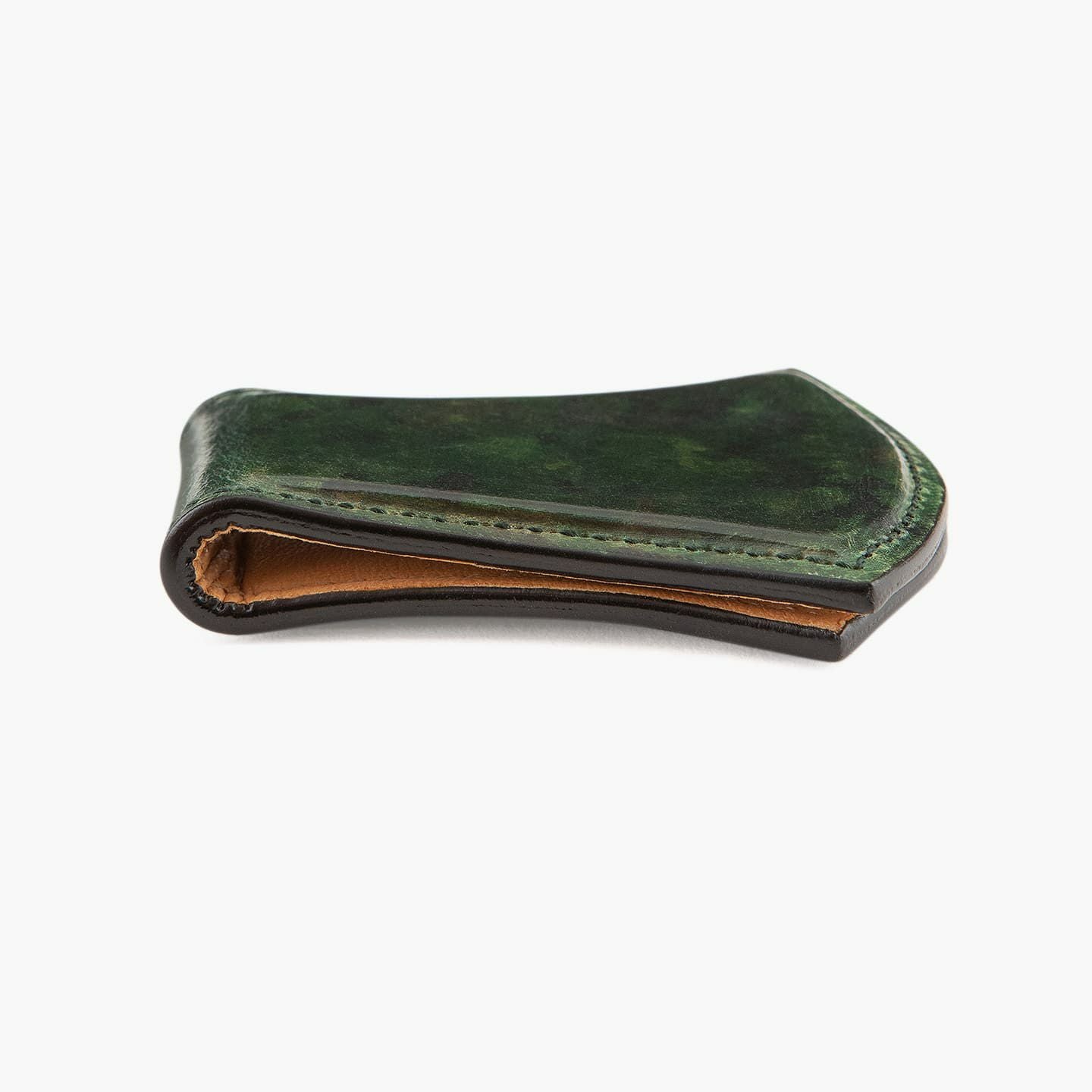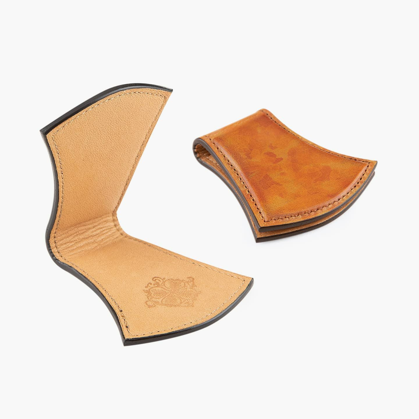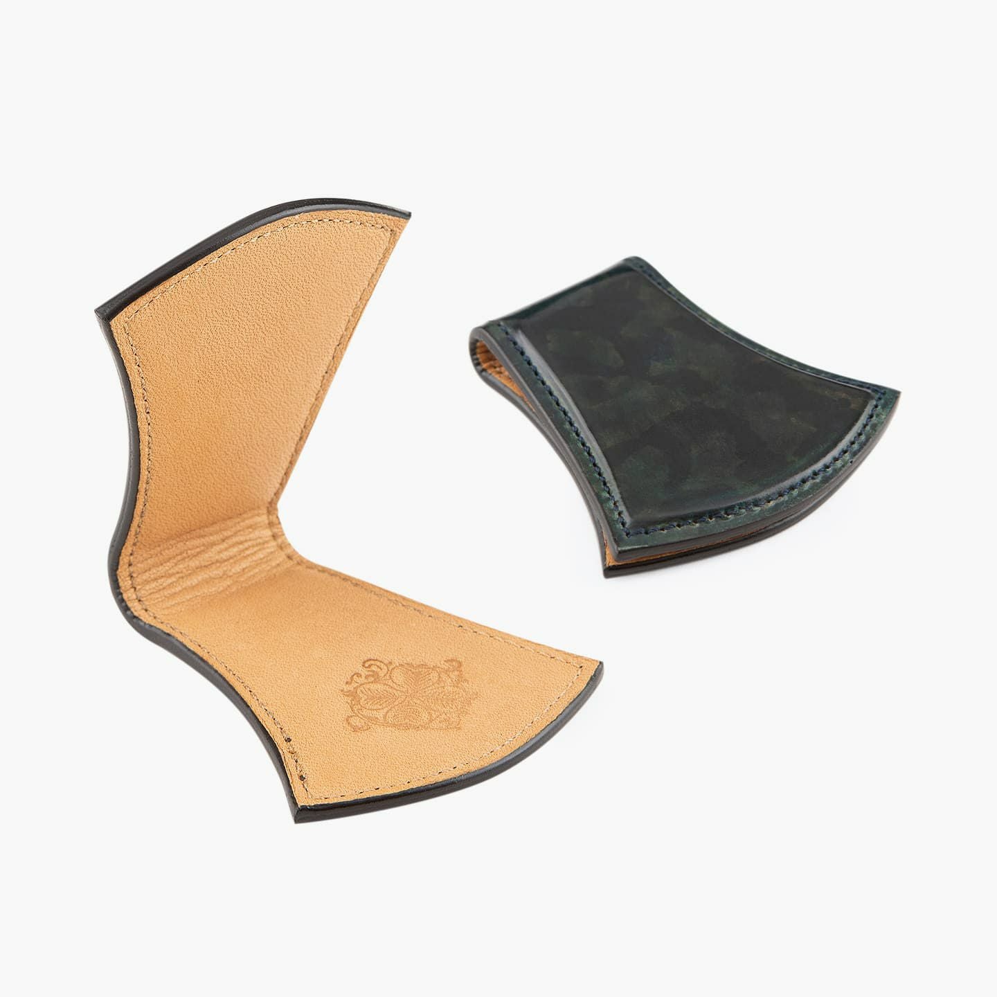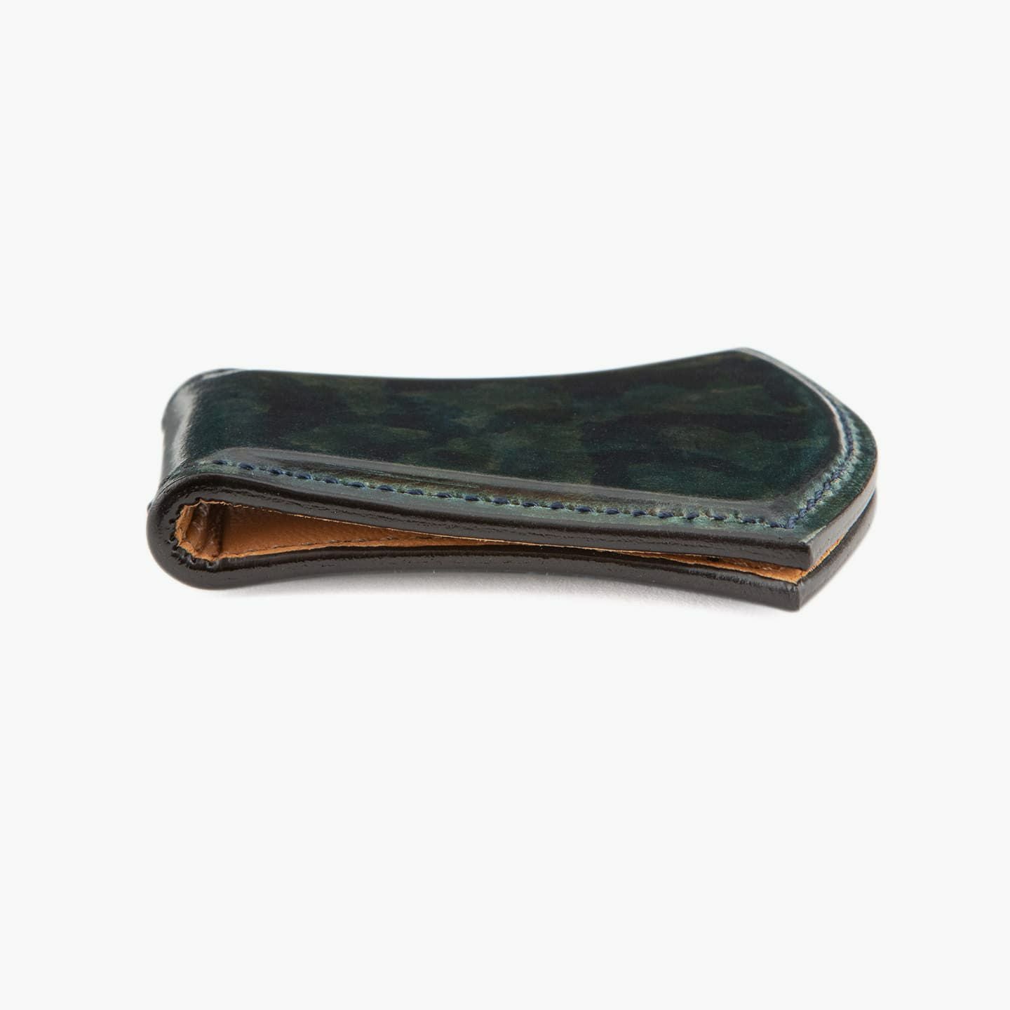 イタリア・フィレンツェの工房で修行していた革小物職人・久内夕夏が、靴職人の夫・久内淳史と手掛けるブランド『il Quadrifoglio』のマネークリップ。縁起が良いと言われている扇形をコンパクトにしたシンプルなデザインで、マグネット仕様で紙幣をクリップして持ち歩く、見た目のスマートな革小物。そして、フィレンチェ仕込みのスポンジで塗装するマーブル染めを纏わせ、キャンディーや宝石のような美しい透明感を漂わせる、小粋なアイテムへ。女性ならではの洒落た感性と、日本人ならではの丁寧なハンドメイドが融合し、素材・染料ともにイタリア製にこだわったイタリアンな味わいとともに、スタイリッシュな佇まいで紙幣を持ち歩く、新たなスタイルを創出させてくれる。