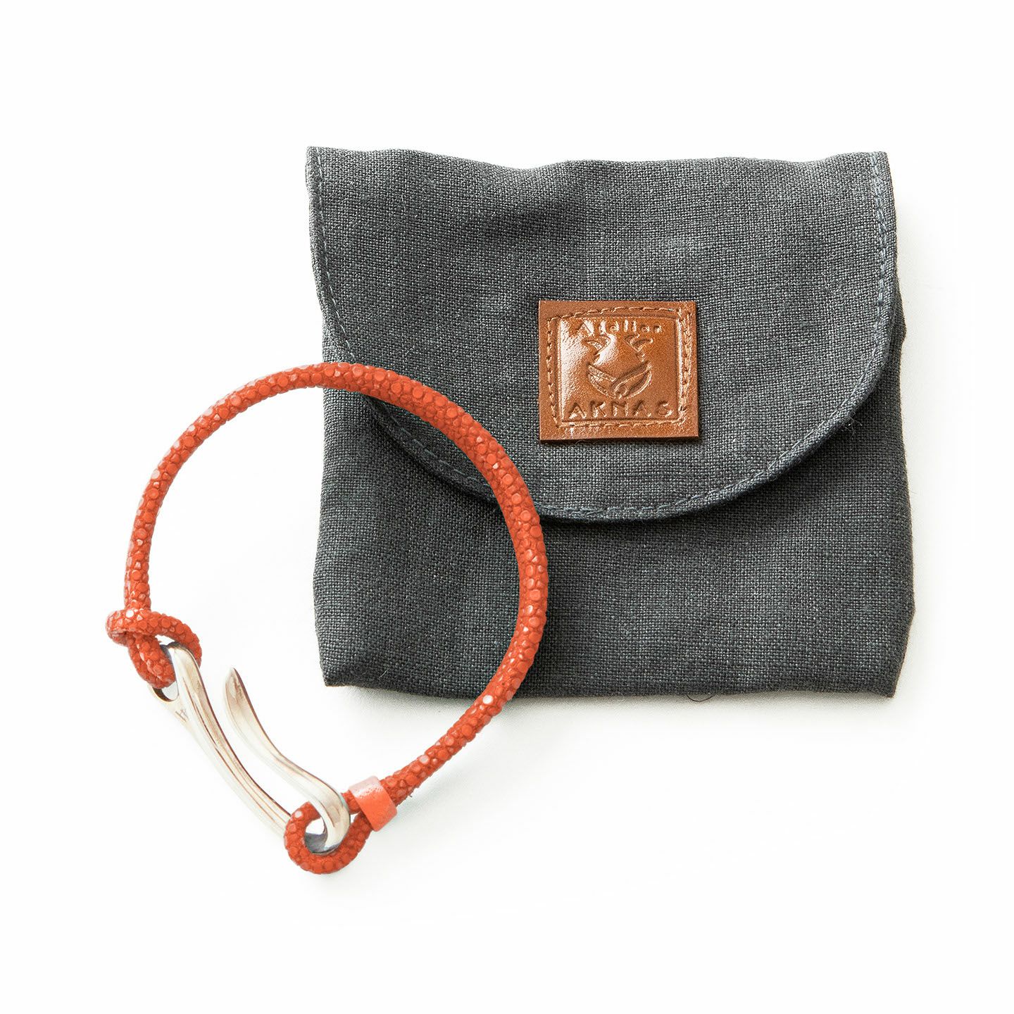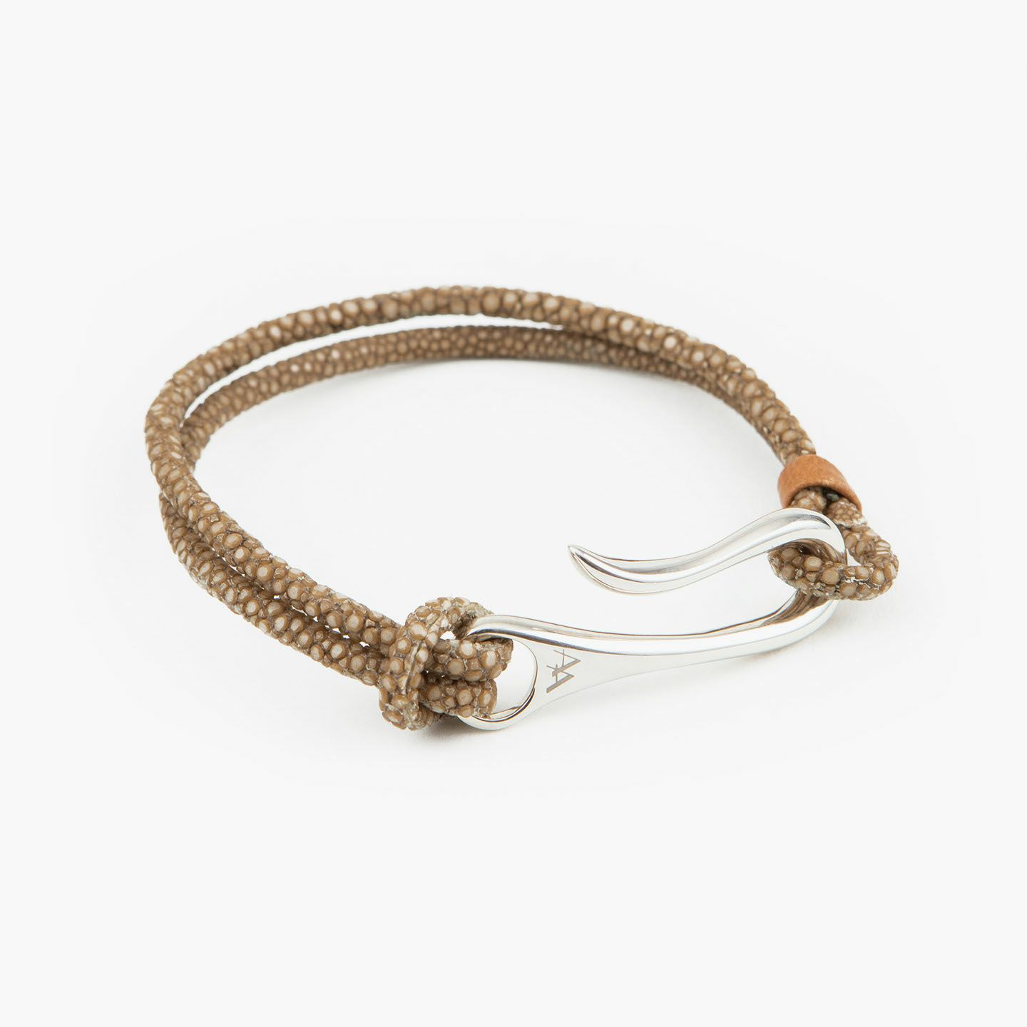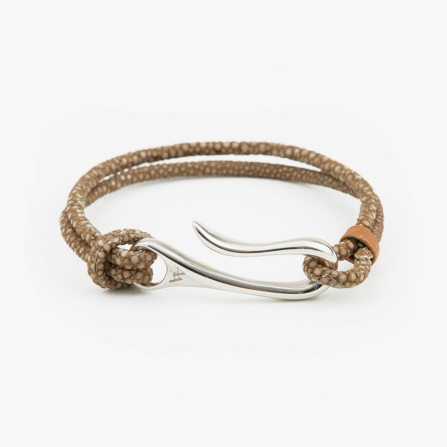 ブランドのコンセプトとして“Cuirs D'ailleurs 〜旅するレザー〜”を掲げ、他の人たちとは違ったクールで洒落た人生の旅へと導く、『Atelier AKNAS』のWロープ ブレスレット。古来より縁起が良いと重宝されて“幸運の魚”とも呼ばれるエイ革「ガルーシャ」を、贅沢にも3mmコードのダブルロープとして採用し、熟練の職人が無垢の「シルバー925」をハンドメイドで加工した、特長的なフック形状でキレイに磨かれた留め具に、そのコードを引っ掛けるだけで装着できる秀逸なアイテム。洗練されて研ぎ澄まされたフックのフォルムが、豪華客船のような美しい佇まいを感じさせ、きらめく海原の優雅な光のエスプリを抱かせてくれる。