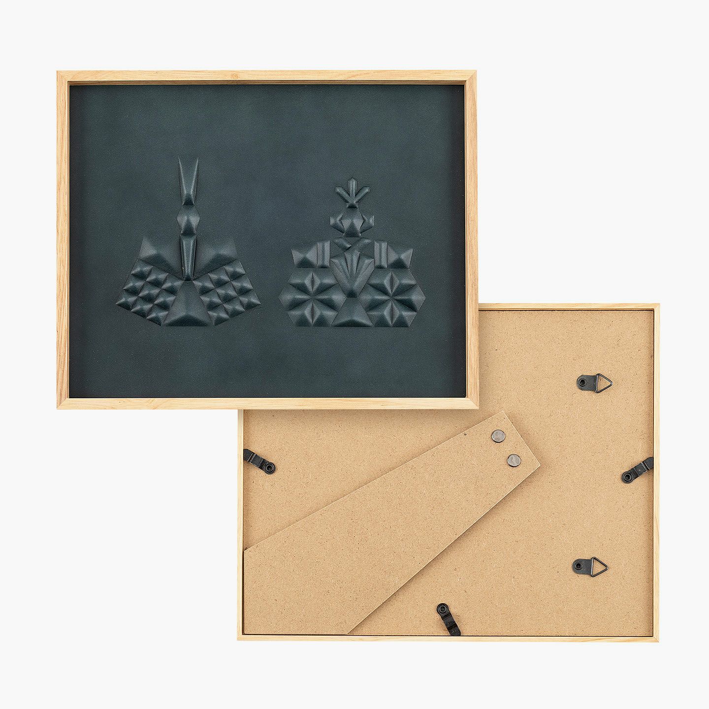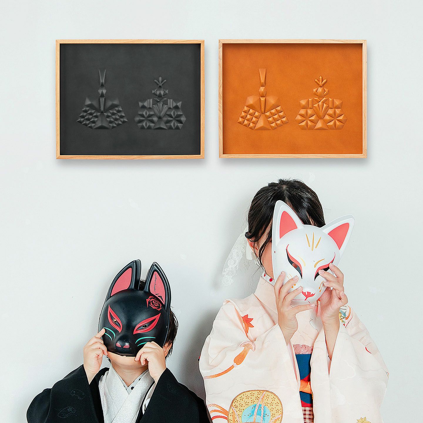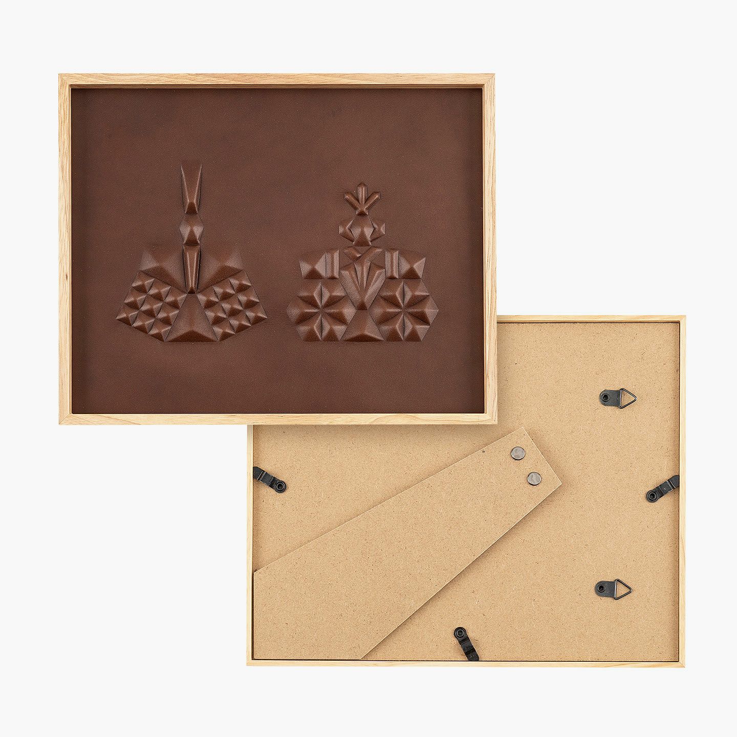 「ひな人形」をモチーフにして日本の伝統を取り入れながら、シンプルモダンなインテリアにもマッチする、高級感あふれる洗練されたデザインのアートパネル“hina”。革を立体的に成型させる伝統技術「革絞り」の製法と、3D切削加工の現代技術による原型を融合させ、手間暇を掛けながらレザーで「ひな人形」を表現。日本最大級の革の生産地・兵庫県たつの市のタンナー職人による「牛ヌメ革」を使い、贅沢な一枚革で魅力的なアートへ。わずか21mm厚の天然木フレームなので、場所を選ばず壁に掛けたり棚に置いたりすることも。オプションで名前・誕生日の刻印も追加でき、出産祝いなどの贈り物としてもセンスを響かせられる。