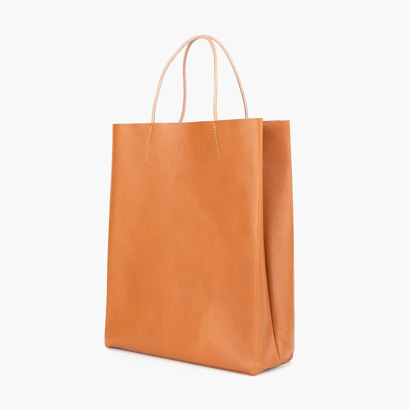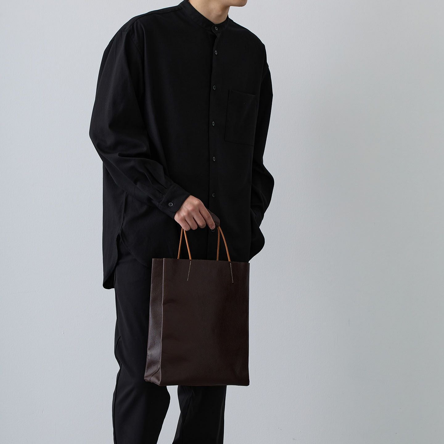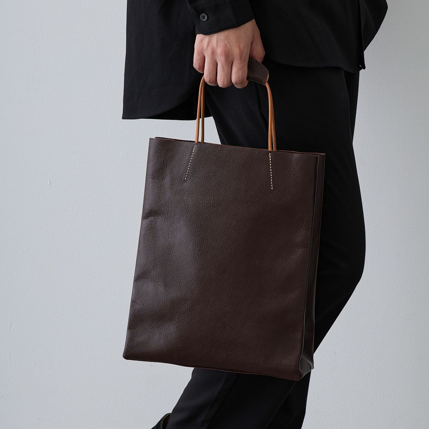 ブランド名に幸福とデザインへの想いを込めた『Ad maiora! Designare』の、革職人・熊谷美津昭の代表作のひとつでもある、シンプルな「革袋(A4)」。『Mens Leather Store』の別注アイテムとして、サイズをひとまわり大きくして、A4収納のバッグでありながら、見た目のイメージを超える収納力を実現。販売開始から10年以上の時を経て、細かな改良を繰り返して進化させながら、紙袋をそのままモチーフにした、さりげなく飽きのこないシンプルなデザインが、カジュアル&フォーマルのスタイルを選ばず、大人の小粋さを引き立ててくれる。