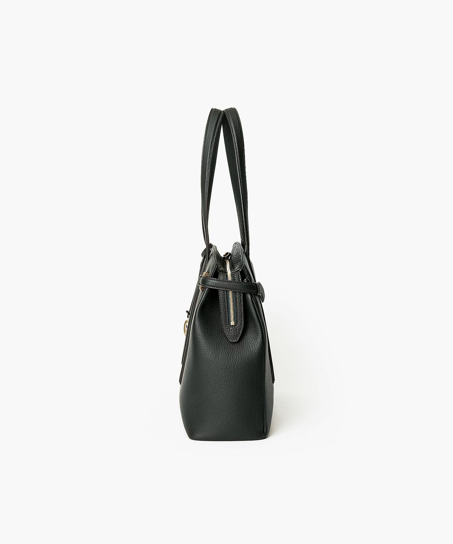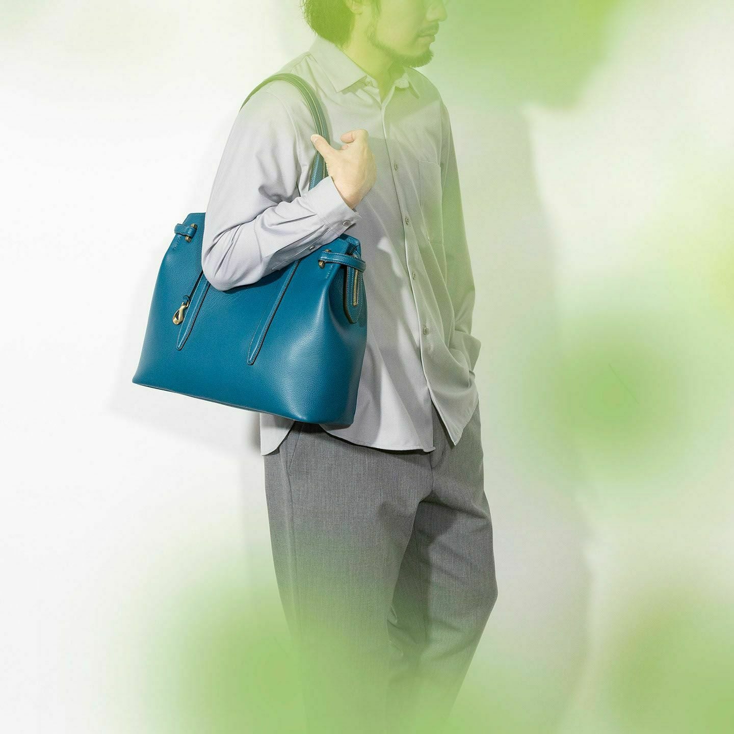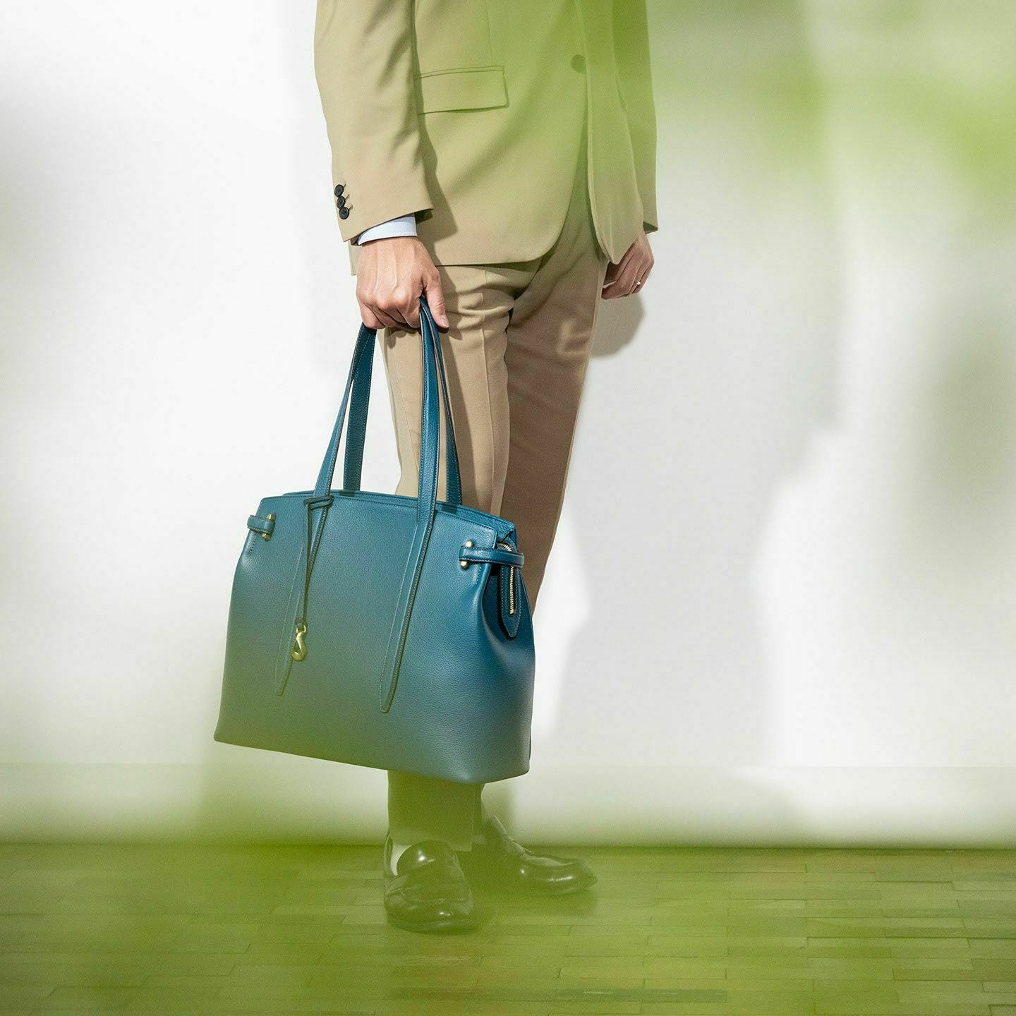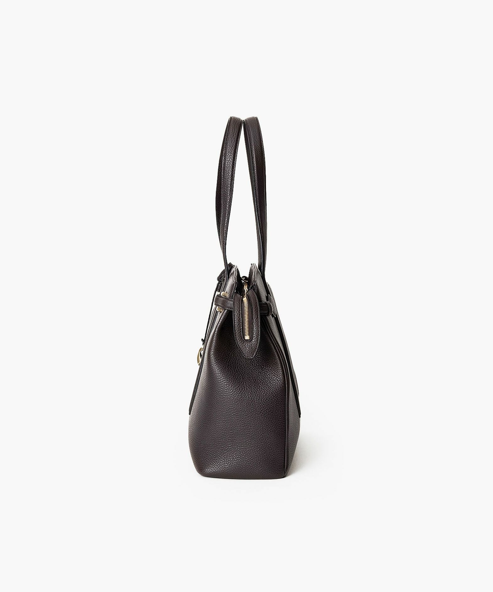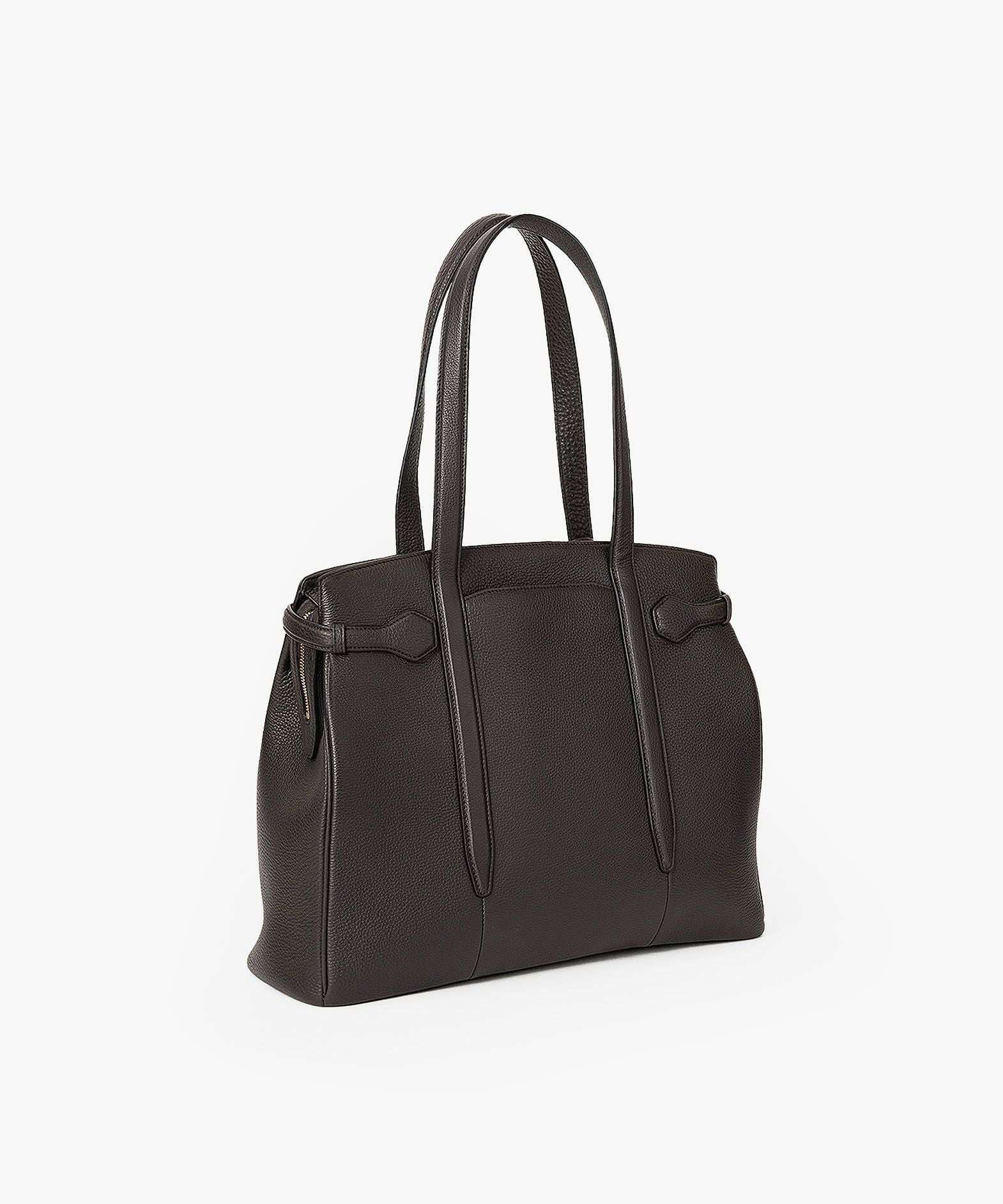 13インチのノートPCを入れられ、電車の座席・車の助手席・肩掛け時などでもかさばらない、ゆとりある使い心地のサイドベルトトート“Afford”。シボ感が魅力的な「シュリンクレザー」による、フロントとマチをシームレスで繋いでいる柔らかなカーブが、リラックス感のあるソフトな印象へ。デザインの象徴になっているサイドベルトは、両サイドのオリジナル真鍮金具を起点に、背面のマグネット留めへと、マチの上部を流れるシャープな横ラインが魅力的。YKK最高品質のエクセラWファスナーを開けてマチを開くと、マグネットが自然に外れて出し入れしやすい使い心地も魅力。緩やかなカーブのボディが、余裕のある気分ももたらしてくれる。