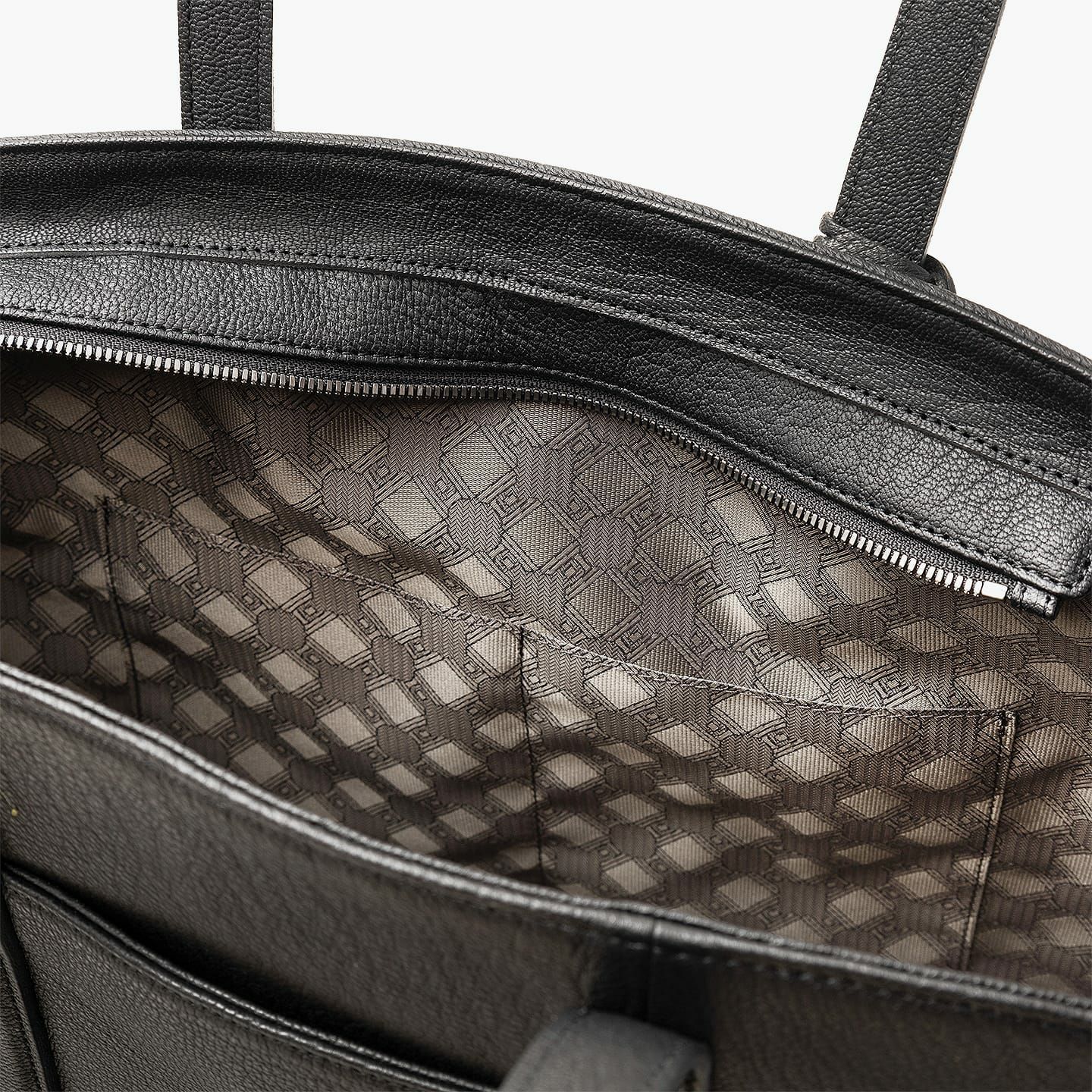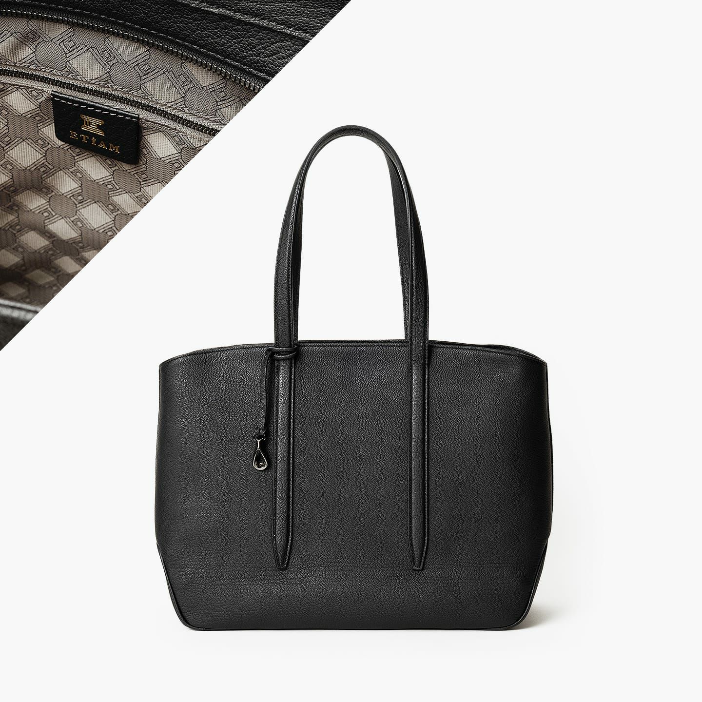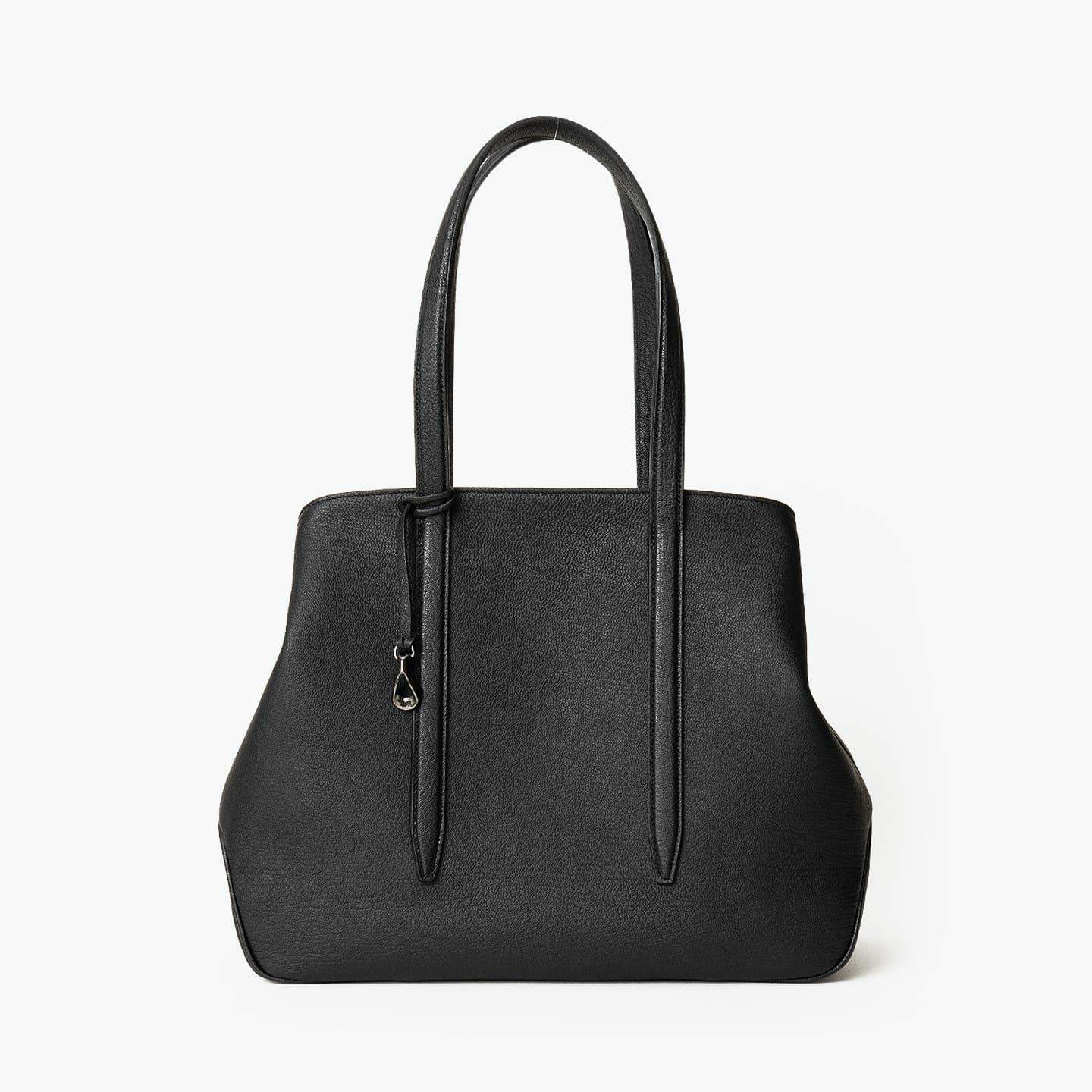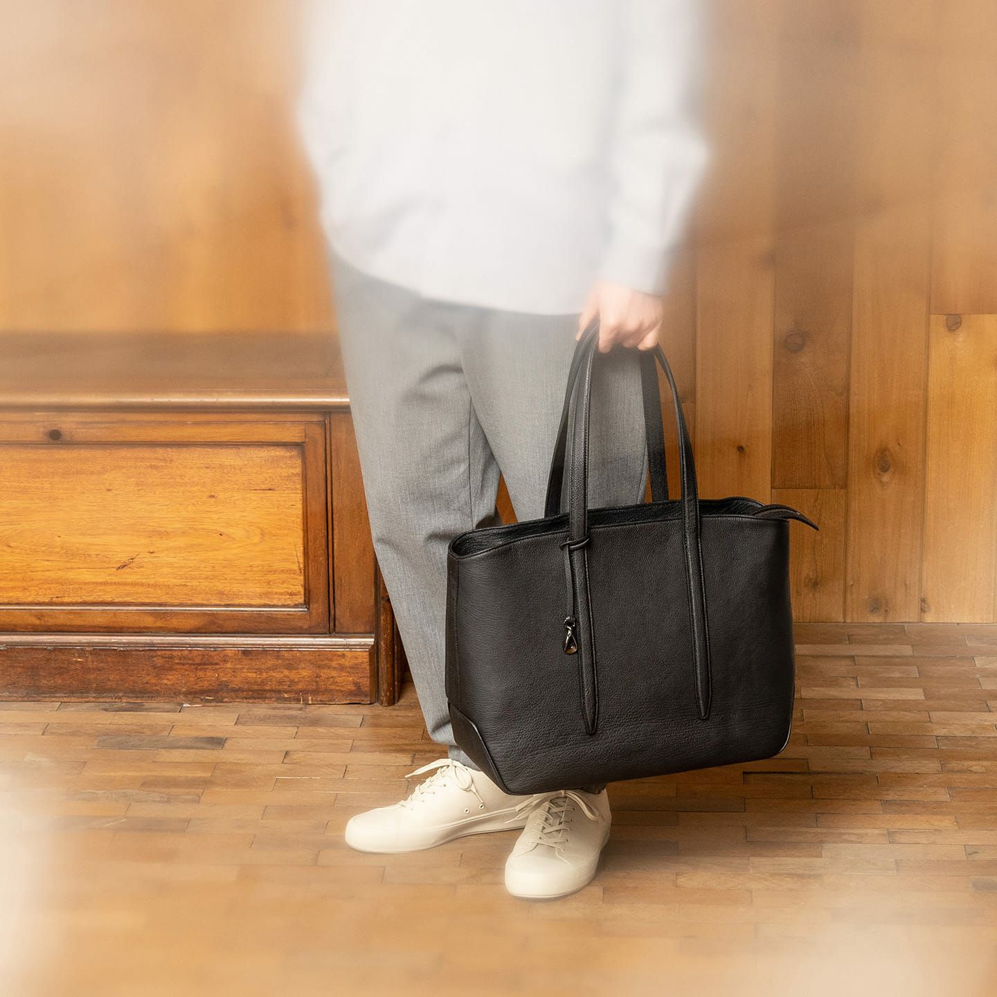 B4サイズ・15インチのノートパソコンを収納できる、ファスナー開閉式の設計。内装マチに設けたベルトを使うことで、マチを内側に折り畳んでコンパクトにでき、2通りのシルエット・サイズを楽しみながら、用途に合わせて柔軟に収納・携帯できます。また、左右のマチに向かって下がっていく上部のラインは、マチを内側に折っても天ファスナーを邪魔しない機能性と、個性的なシルエットへと導くデザイン性を両立。さらに、底マチのセンターには、肩掛けするときに体にフィットしてスムーズに持ち歩けるように、くびれを施しているフォルムにした実用性も併せ持たせています。