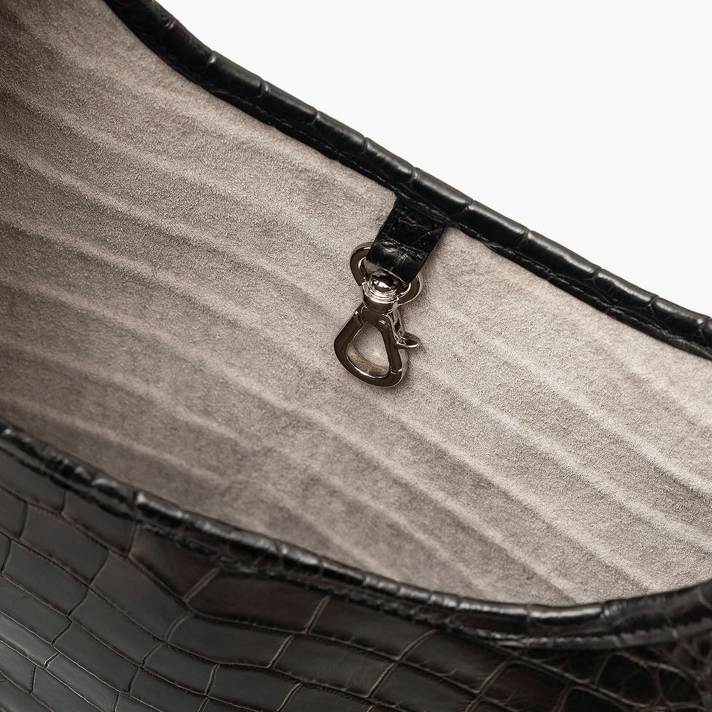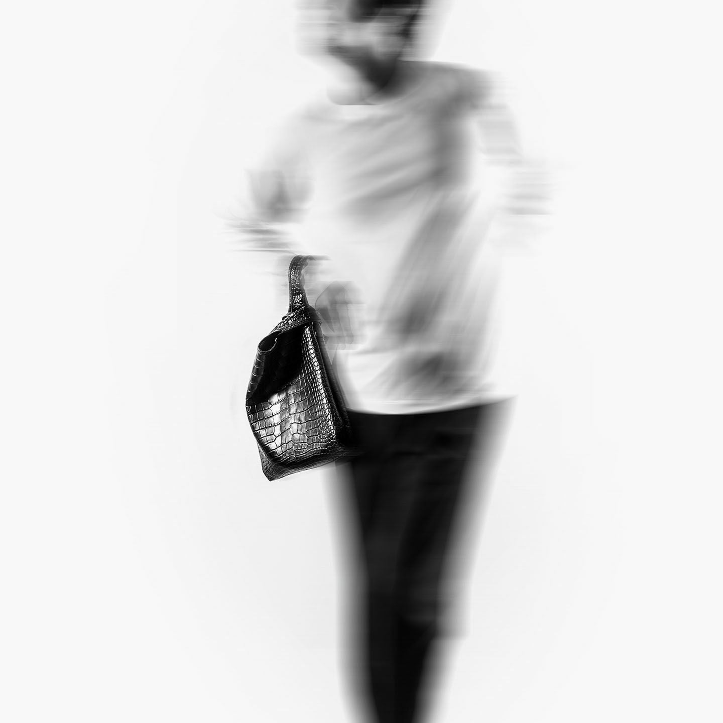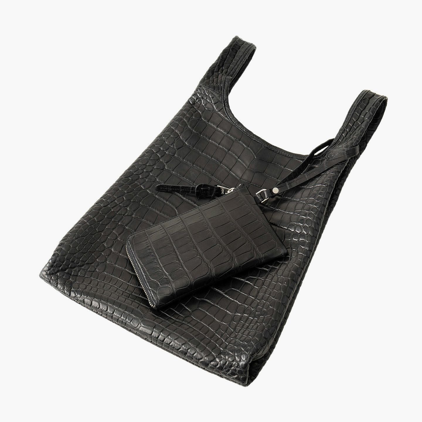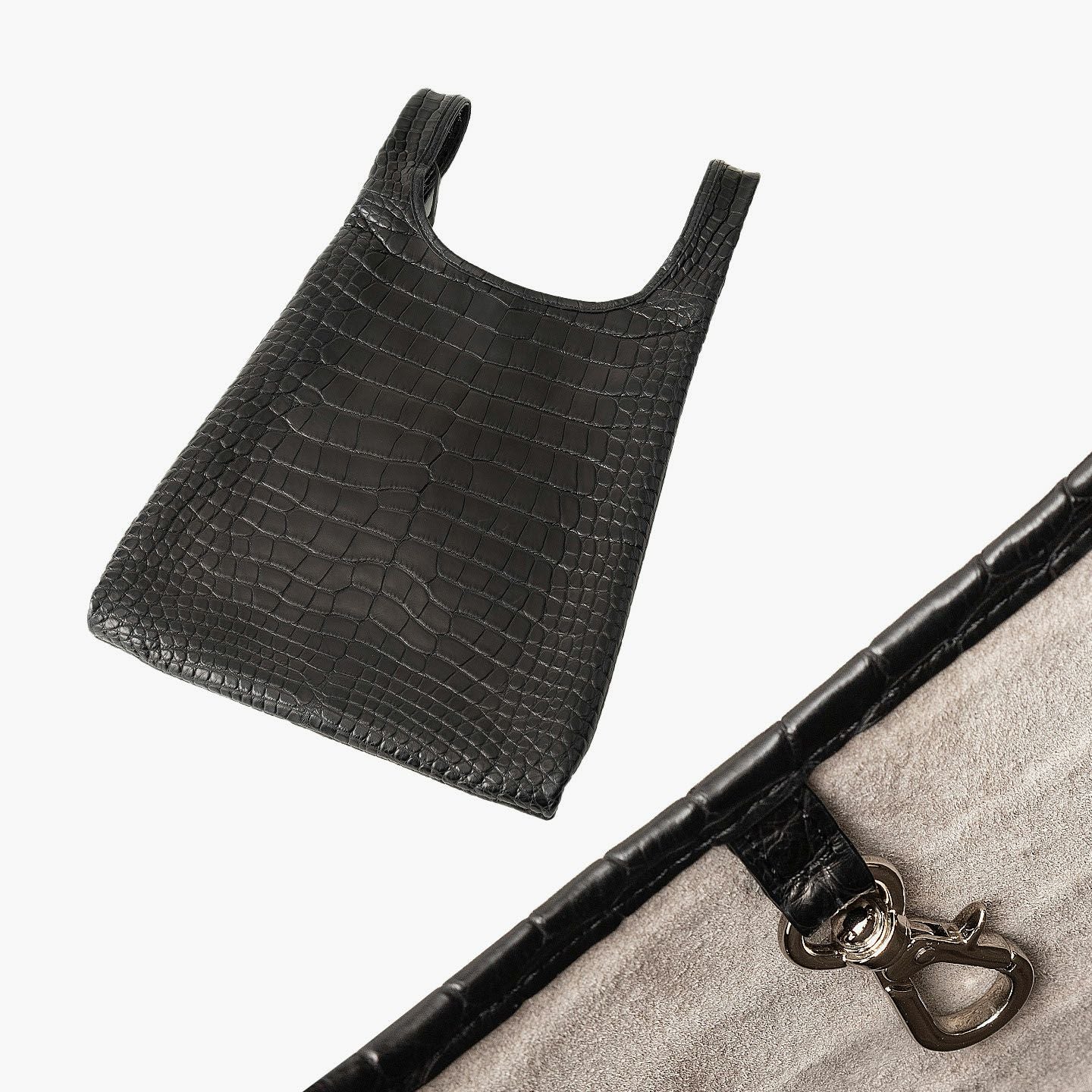 エキゾチックレザー専業ブランド『LE’SAC』による、希少価値の高い最高級の革と、熟練の職人による最高峰の仕立て・加工が、大人のステータスを高めてくれるマルシェバッグ“COLOGY-S”。レジ袋・エコバックをモチーフにしたデザインを、最高級素材であるワニ革「アリゲーター」2枚を贅沢に使用して表現し、美しく上質な斑模様とともに、唯一無二の極上感を創出。使うほどに味わい深いBlackへと光沢感を纏う魅力が、スマートフォン・鍵などを入れてバッグに収納できる同素材の付属ジップポーチとともに、内装の「ピッグスエード」とのモノトーンのコントラストにより引き立てられながら、大人のモード感を響かせてくれる。