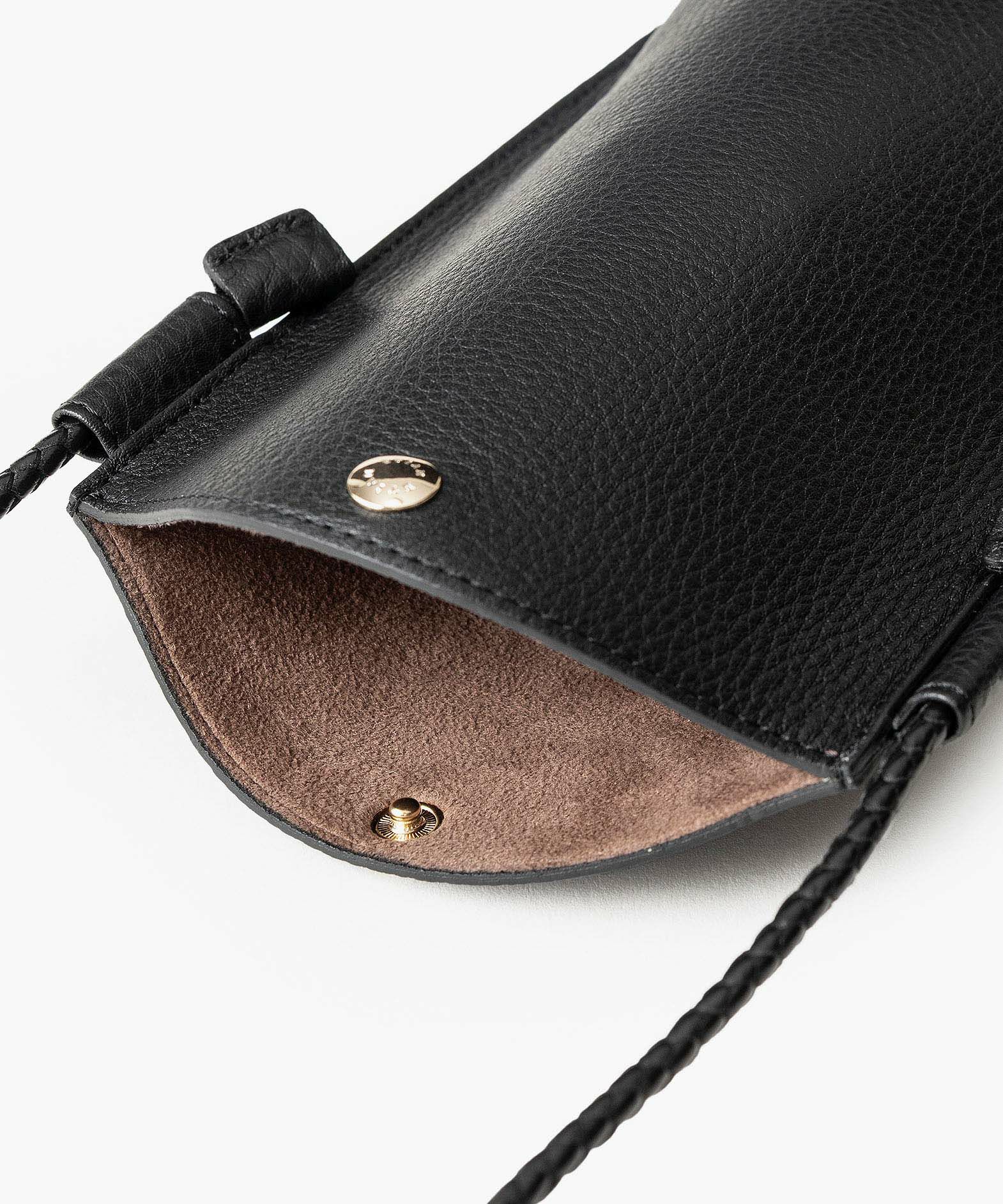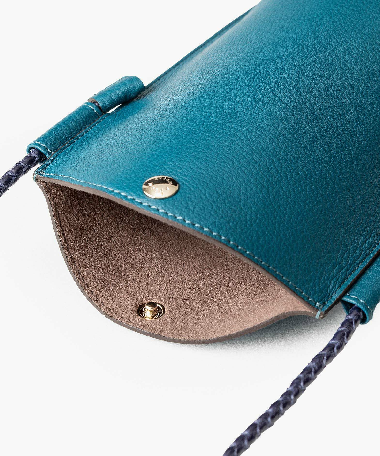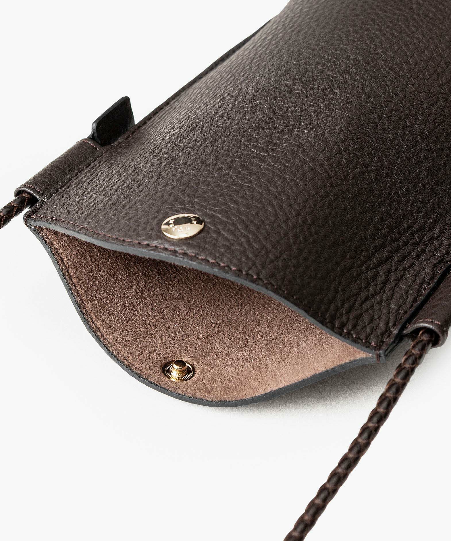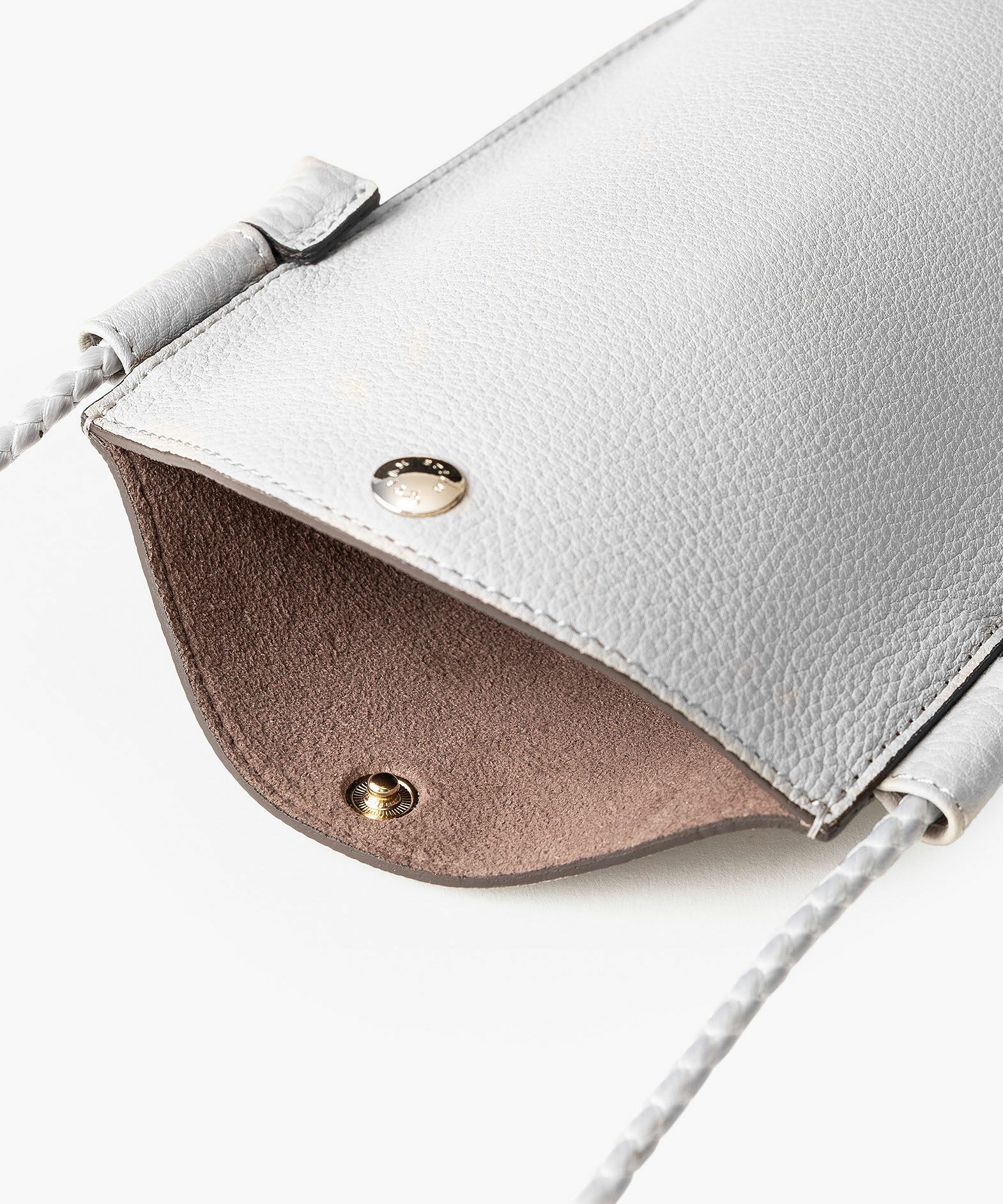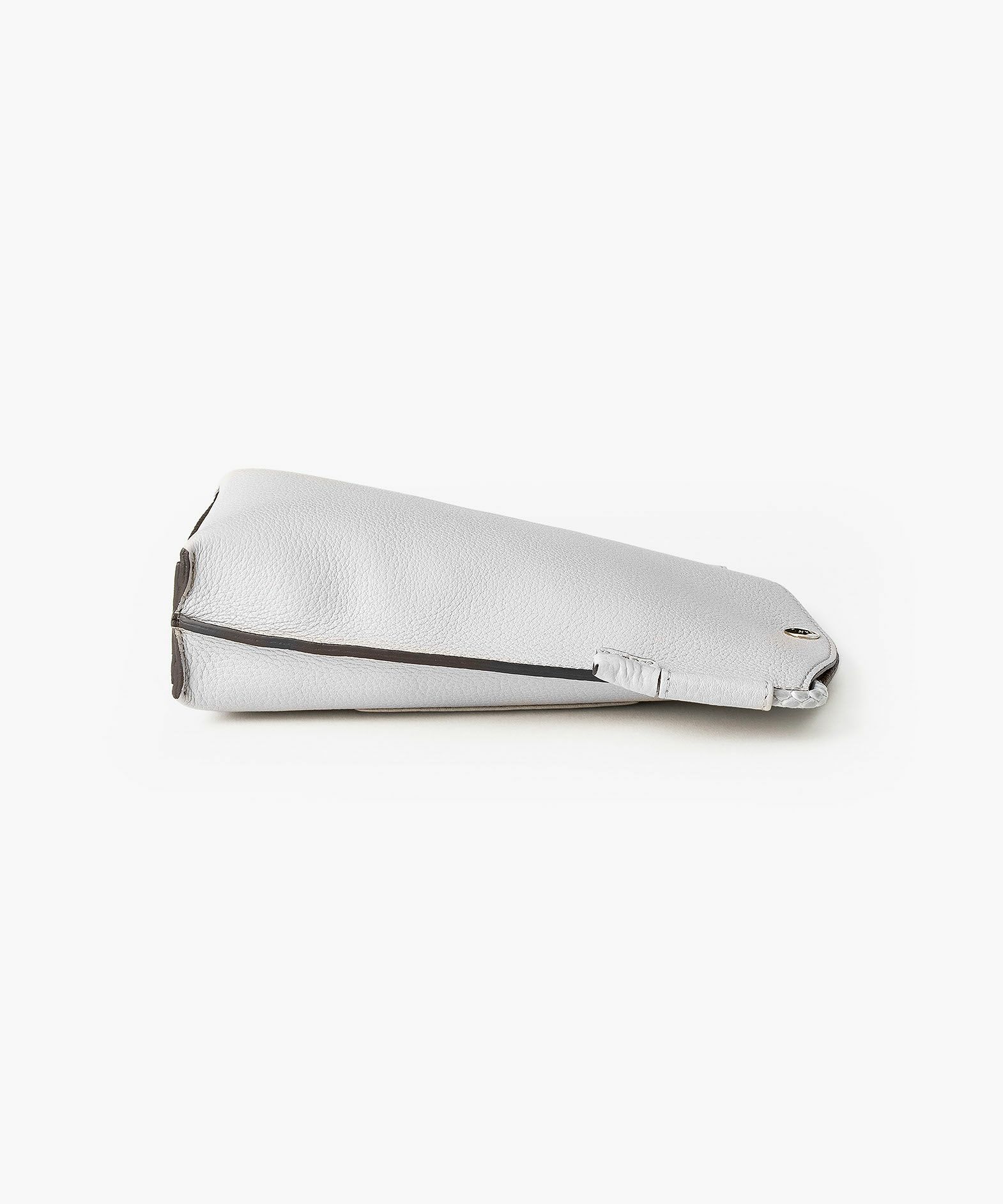 貝のような円形状のデザインとともに、スマートフォンなどを軽やかに携えられる、モバイルショルダーバッグ“Shell”。シボ感が美しい外装の「シュリンクレザー」は、前面・底面・背面に繋ぎ目がない一枚仕立てで、洗練されたエレガントな印象へ。上部の横幅を広くして下部をコンパクトすることで、収納物を見渡しやすく出し入れしやすい快適さを実現。メインポケットには、スマートフォン2台をはじめ、スマホ1台・ミニ財布・フラグメントケース・名刺入れ・パスケース・文房具などを、フレキシブルに組み合わせた収納が可能。内装にはポリエステル製スエードを採用し、スマホ画面などにもキズを付けずに、やさしく携帯できる機能性も。背面のカードポケットには、クレジットカード・交通系ICカード・名刺などを入れられて便利。程よいサイズ感のポケットをプラスするように、さまざまなシーンへ連れて行ける。