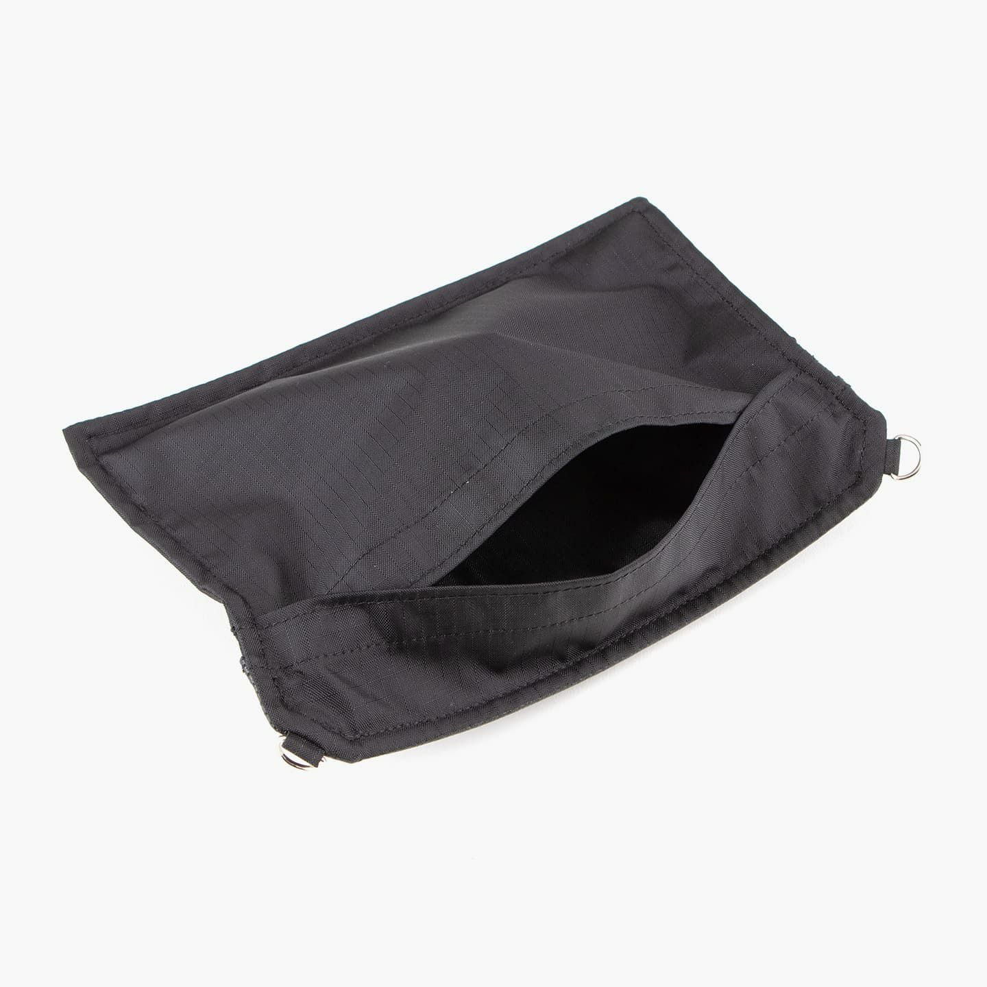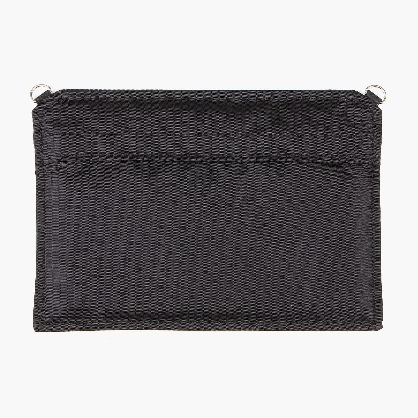 素材には、一般的なナイロンよりも軽量な糸を使用して専門的に織られた「パラシュートクロス」を採用。強度と耐摩擦性に優れ、伸びにくく、軽くて薄いのが魅力です。また、生地のナイロンストリップ(格子柄)から空気が抜けるように織られているので、通気性に優れ、ムレにくいのも特長。これにより、過度な防水加工をしなくても、撥水加工を施すだけで、通常用途での使用も安心。さらに、背面ポケットにカブセを設けることで、ファスナーやホックなどがなくても、収納物が落ちない構造になっています。