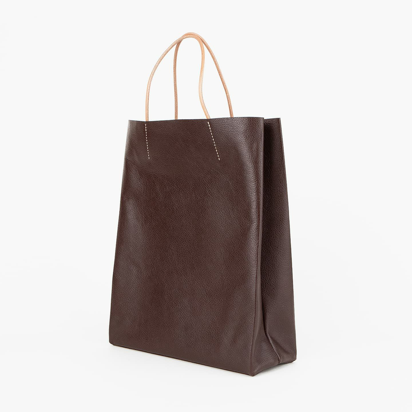 ブランド名に幸福とデザインへの想いを込めた『Ad maiora! Designare』の、革職人・熊谷美津昭の代表作のひとつでもある、シンプルな「革袋(A4)」。『Mens Leather Store』の別注アイテムとして、サイズをひとまわり大きくして、A4収納のバッグでありながら、見た目のイメージを超える収納力を実現。販売開始から10年以上の時を経て、細かな改良を繰り返して進化させながら、紙袋をそのままモチーフにした、さりげなく飽きのこないシンプルなデザインが、カジュアル&フォーマルのスタイルを選ばず、大人の小粋さを引き立ててくれる。