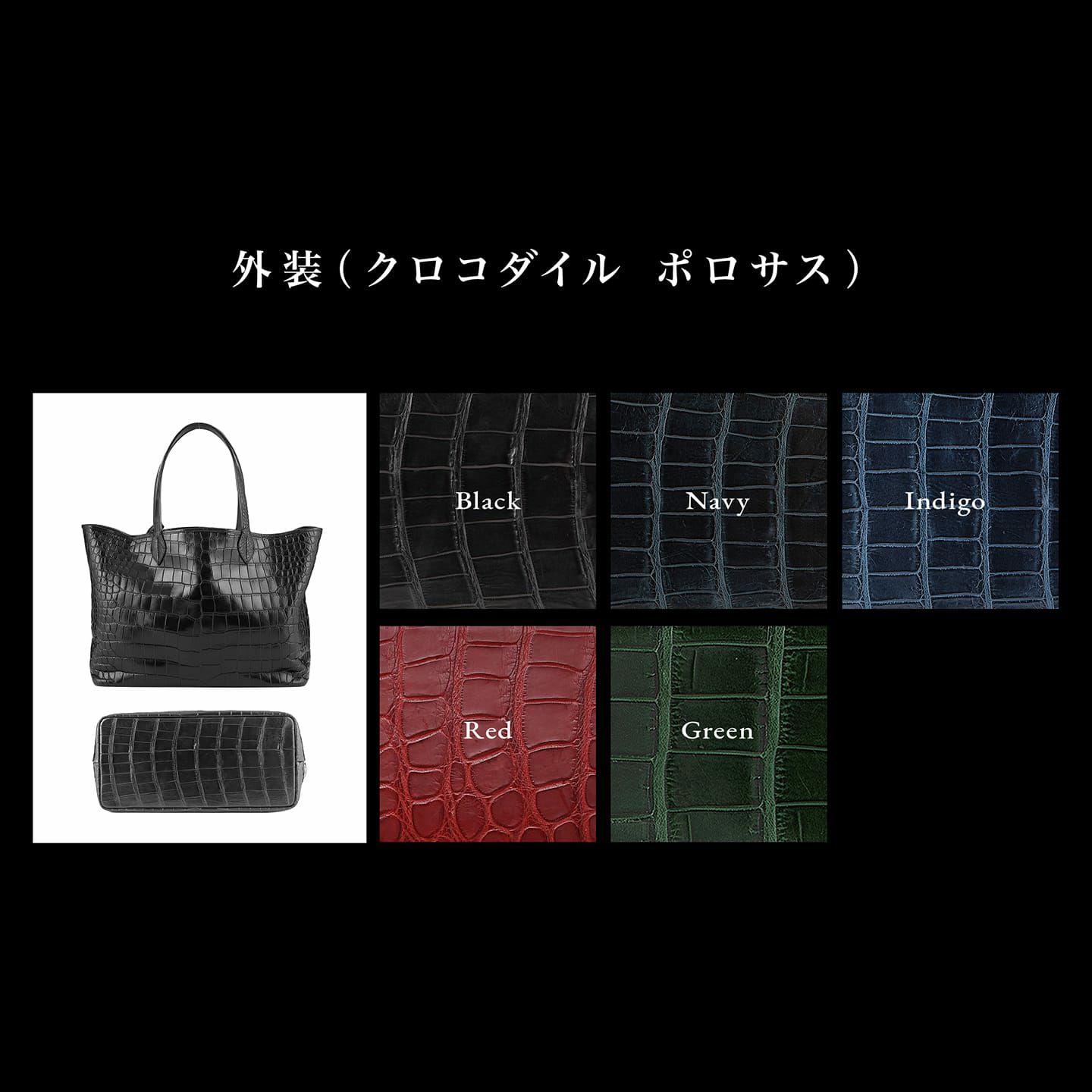 内装には、上質な「ピッグスエード」を採用し、直接「ポロサス」と貼り合わせることで、裏地にも鱗柄が浮き出て見える仕様が魅力。また、卓越した鞣し技術により、ツヤ感がありながらもソフトに仕上げられた外装と内装が、しなやかな一枚の生地のような仕上がりを実現しています。素材も製法も丈夫さを極めるとともに、堅牢性が求められるハンドルの付け根には、ワックスコード蝋引き糸で手縫い処理して、しっかり縫い付けるなど、細部のクオリティも追求。さらに、外装「ポロサス」は5色から、内装「ピッグスエード」はRedもしくは外装と同系色から、サイズは3種類から選んで、受注生産にてオーダーできます。