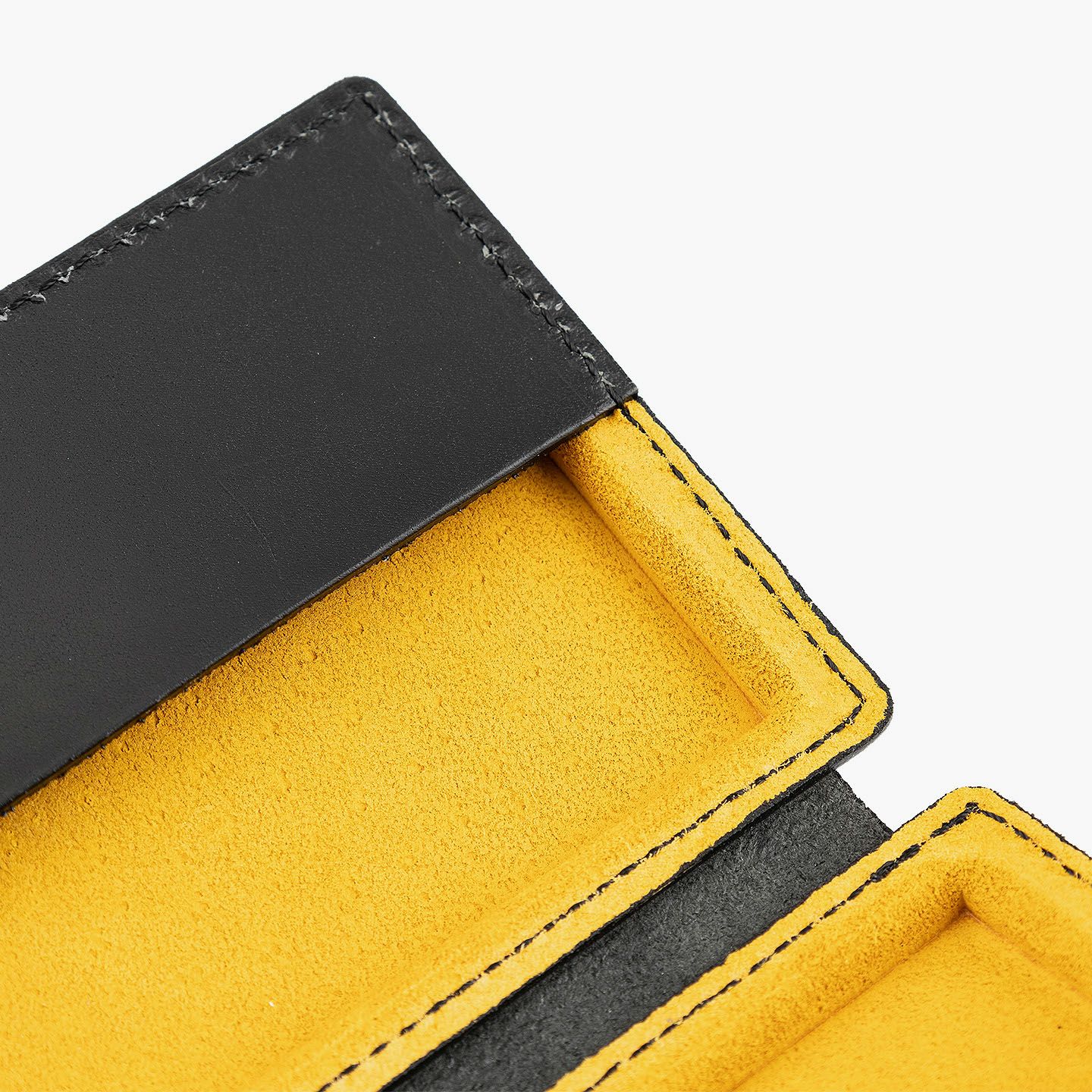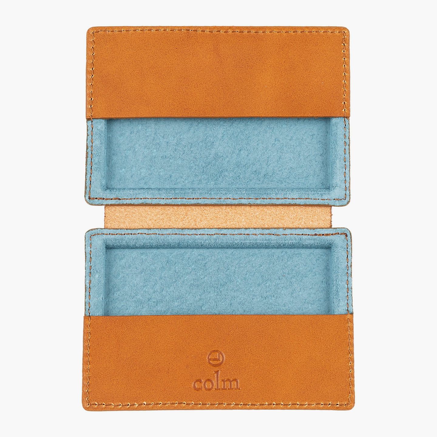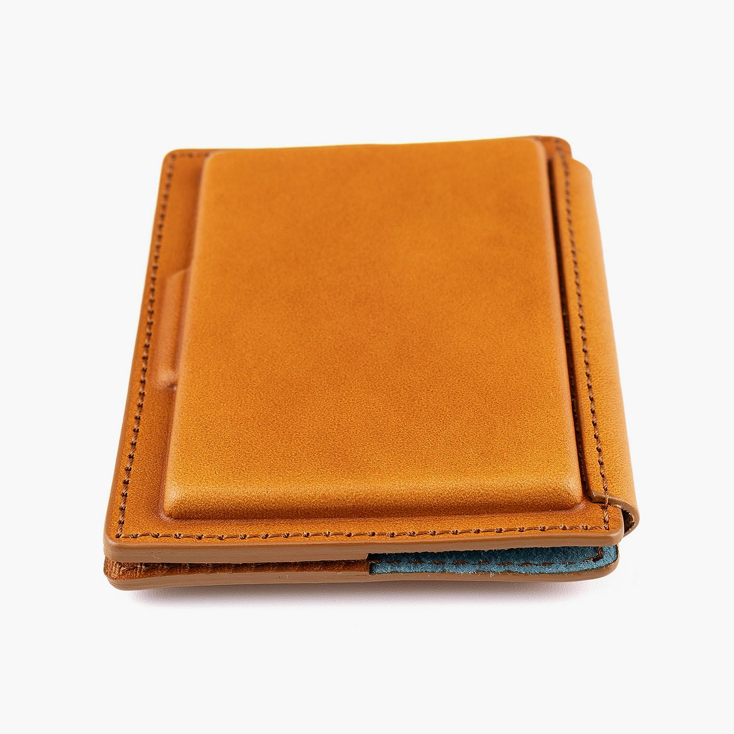 革を立体成型させる伝統技術「革絞り」と、3D切削加工の現代技術により生み出された、独創的なフォルムのカードケース。両サイドの窪んだスペースに、それぞれ15枚ほど(計30枚ほど)の名刺を収納でき、凸部分にはマグネットを内蔵していて開閉もスムーズ。外装には、日本最大級の革の生産地・兵庫県たつの市のタンナー職人の手により、植物タンニンで鞣した「牛ヌメ革」を採用。その表面加工をなるべく抑えることで、革本来の表情や経年変化を楽しめる仕立てに。内装には、カラフルな「ピッグスエード」を採用し、大人の隠れた遊び心も。日本の熟練職人による丁寧な縫製とともに、ビジネスシーンに上質な個性を輝かせてくれる。