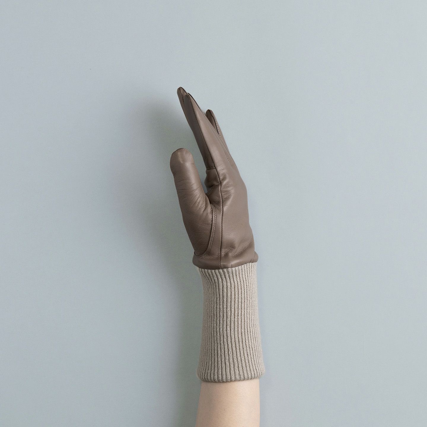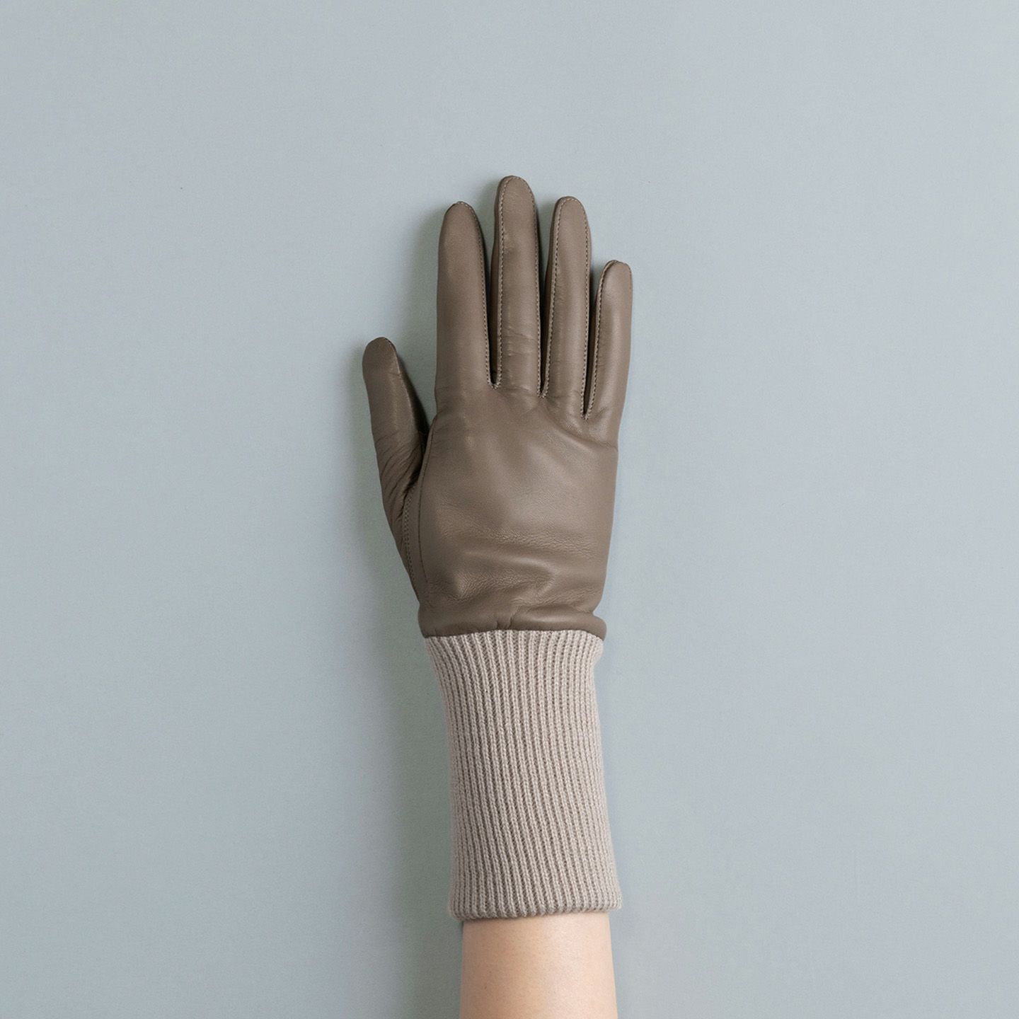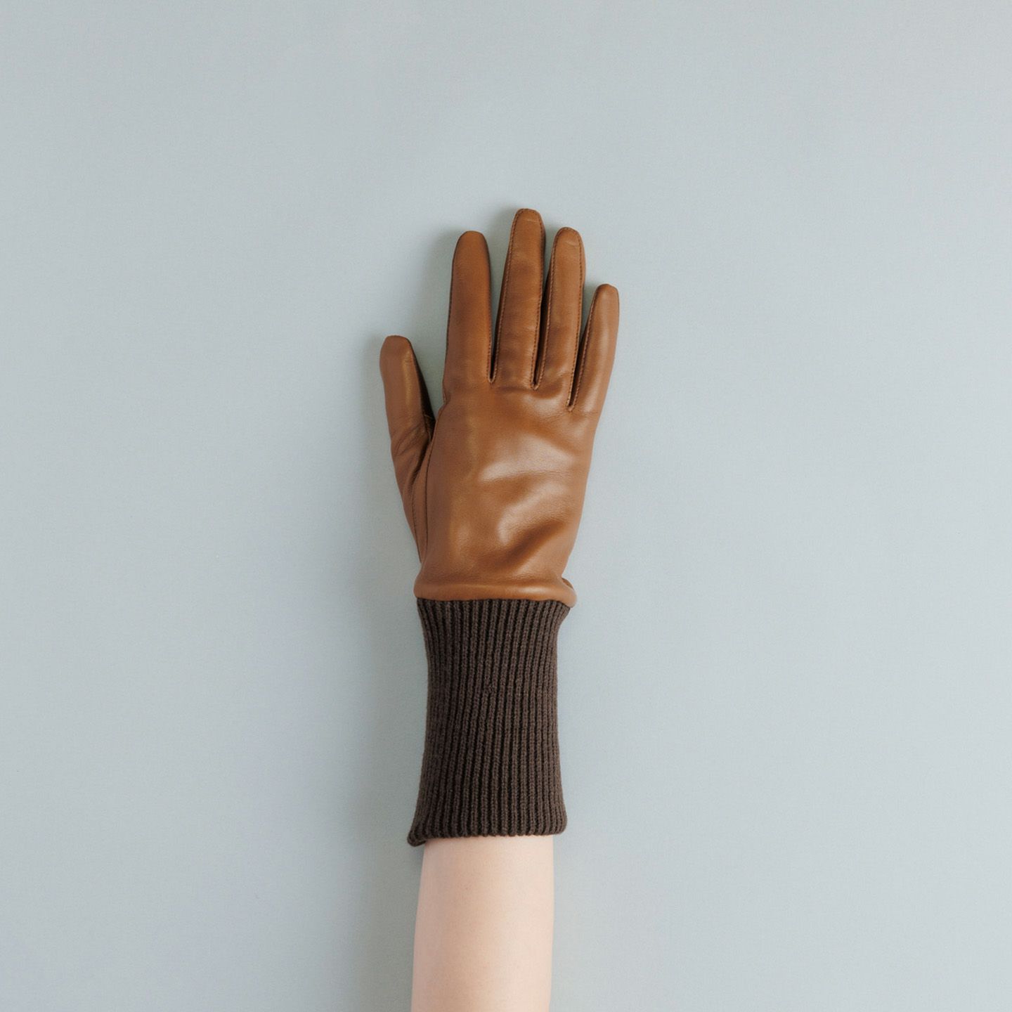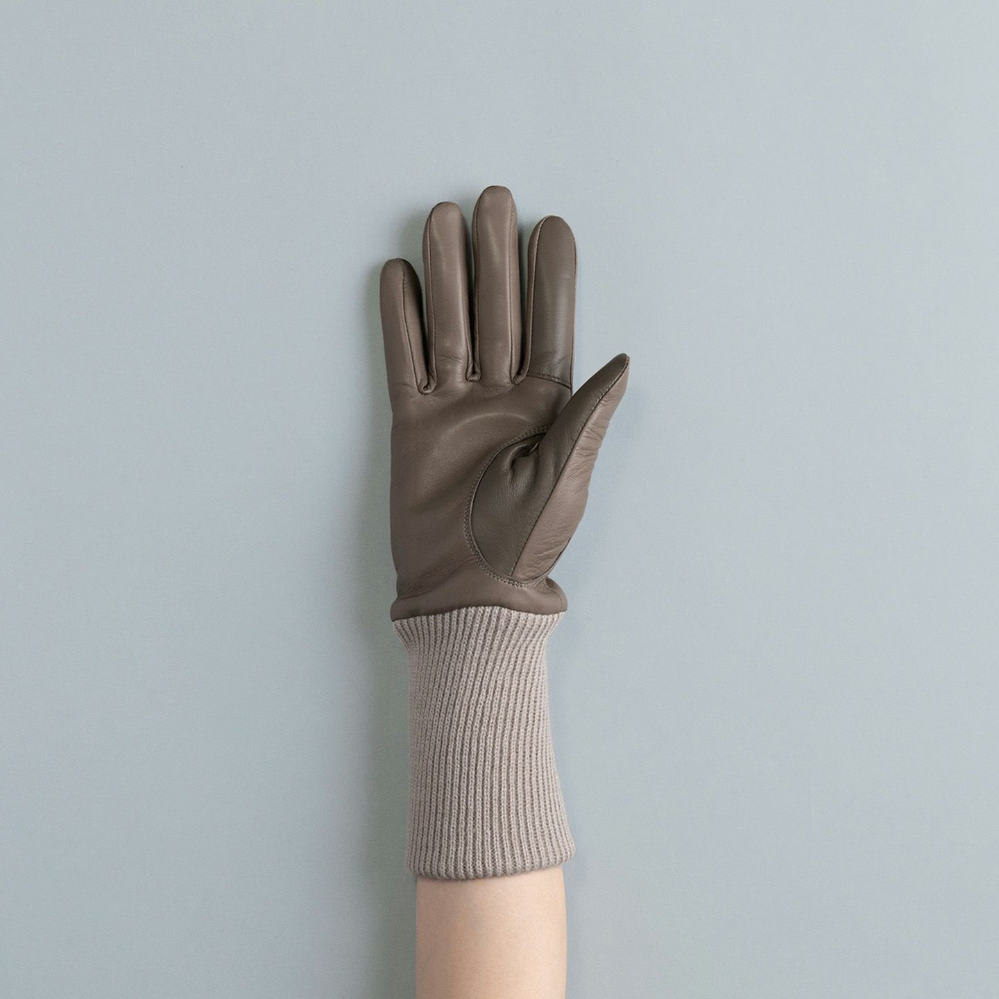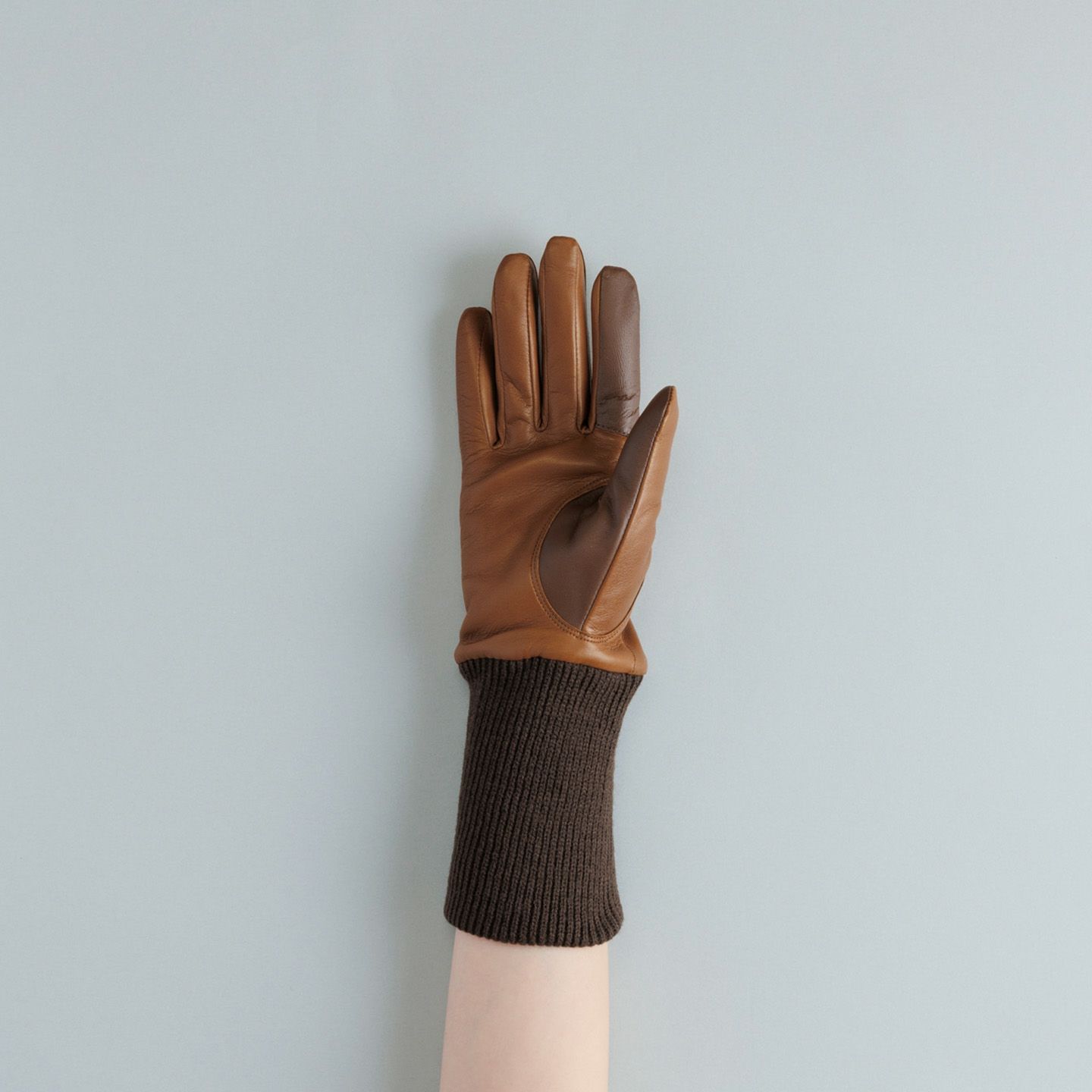イタリア・ポルトラーノ社の「イタリアンラムレザー」に、手首まで隠れて温かい長めのニットカフスを付けた、カジュアルでリッチなイタリアンシープ手袋 “Cuffs-Touch Panel”【WOMEN】。カフスは折り返して短くしても使え、手のひらサイドの親指・人差し指には導電革が施され、装着したままスマートフォンなどのタッチパネル操作をすることも。Black・Luggage・Hematiteの3色から2サイズと併せてセレクトオーダーでき、肌触りがよく温かなカシミア100%のニットを裏地に採用。“ピケ縫い”という指先を長くキレイに見せる、こだわりの縫製を用いて日本で丁寧に一双一双を仕立て、細身でスッキリとした女性らしいルックスへと導いてくれる。