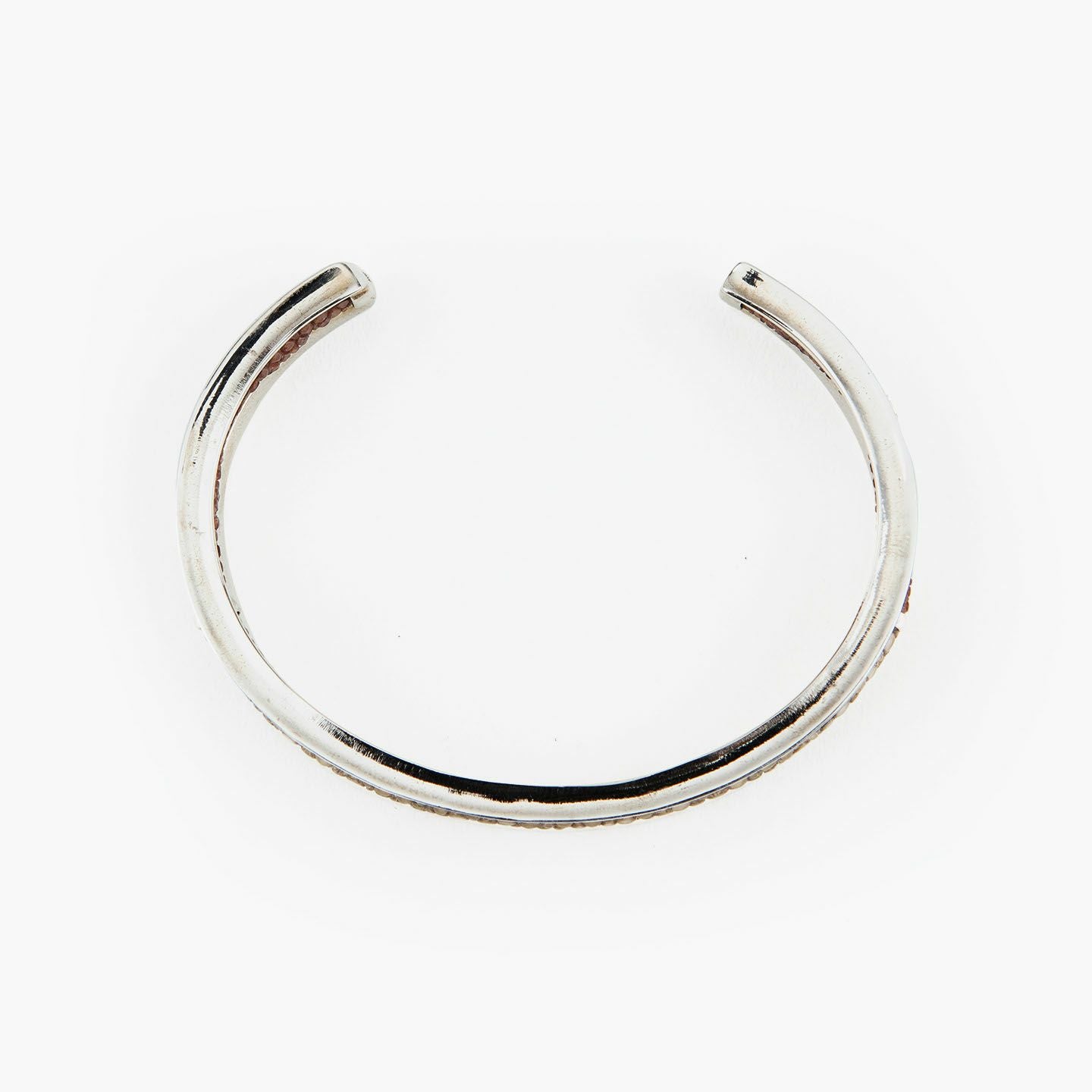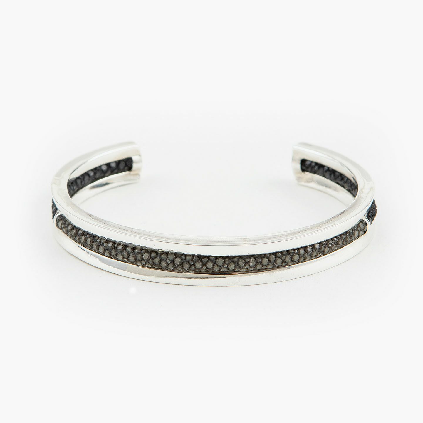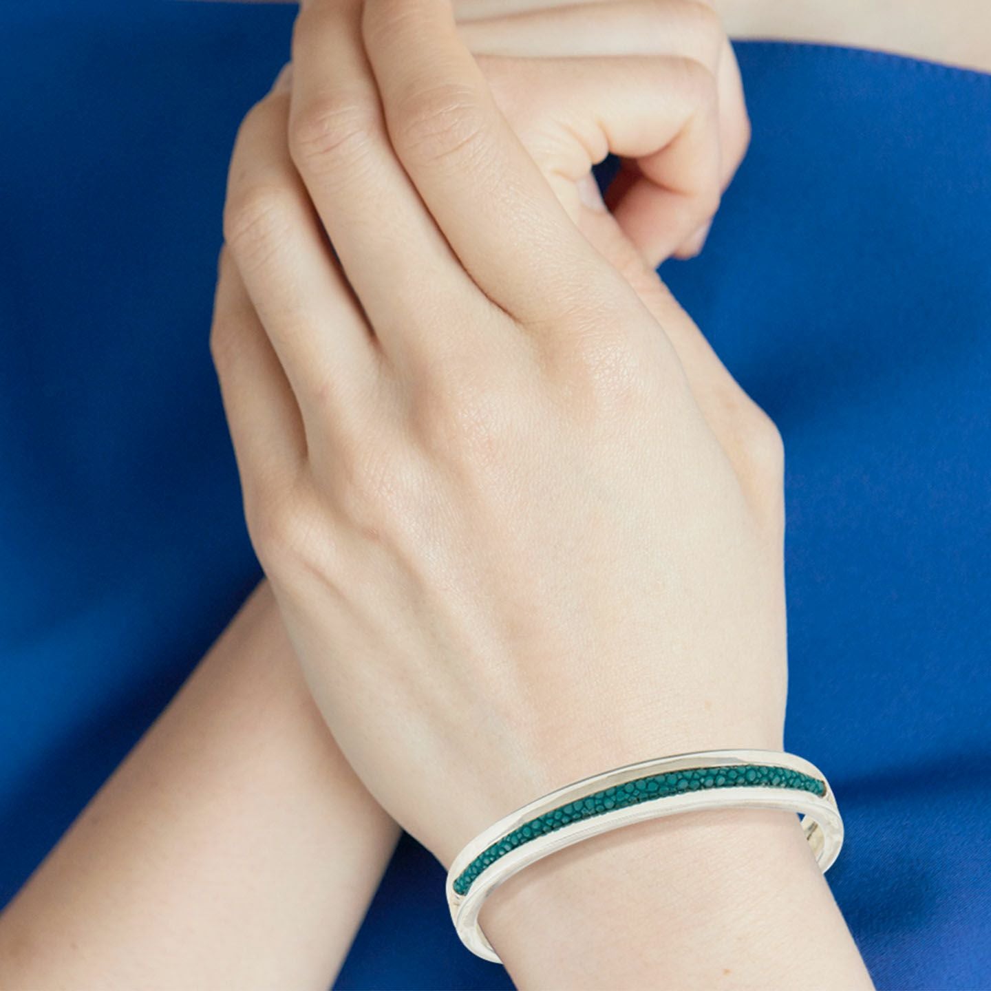 クリエイティビティとクオリティにこだわる革職人たちが、飽くなき探求と努力により最高のパフォーマンスを実現しているブランド『Atelier AKNAS』のバングル“ROHAN”。ガラスビーズを散りばめたようなアカエイの小さな鱗が美しい「ガルーシャ」を、熟練の職人がハンドメイドで丸く曲げた、無垢の「シルバー925」によるフレームの中抜き部分に、曲線に沿わせながら丁寧に組み込み、エレガントな上質感を創出。“海の宝石”と言われる2色のエイ革による重厚感を表現しながら、見た目よりも軽量化させているツヤ肌のメタルフレームが、重さを感じずカジュアルに装着でき、ジュエリーとしての愛着感をさらに高めてくれる。