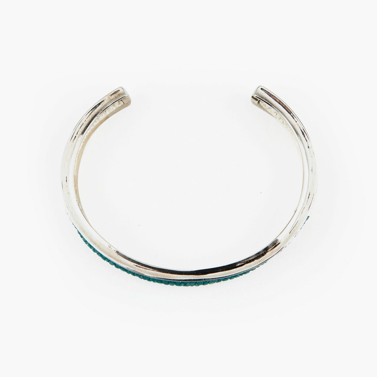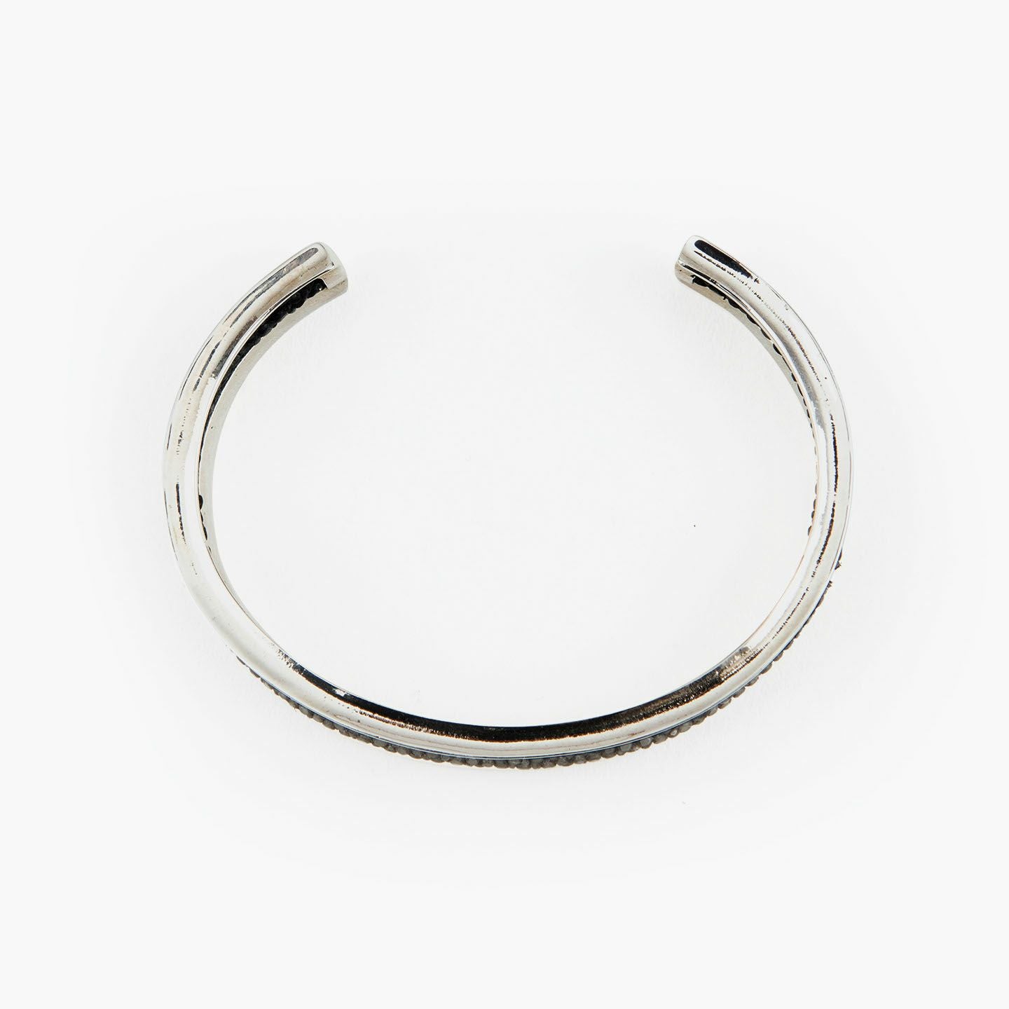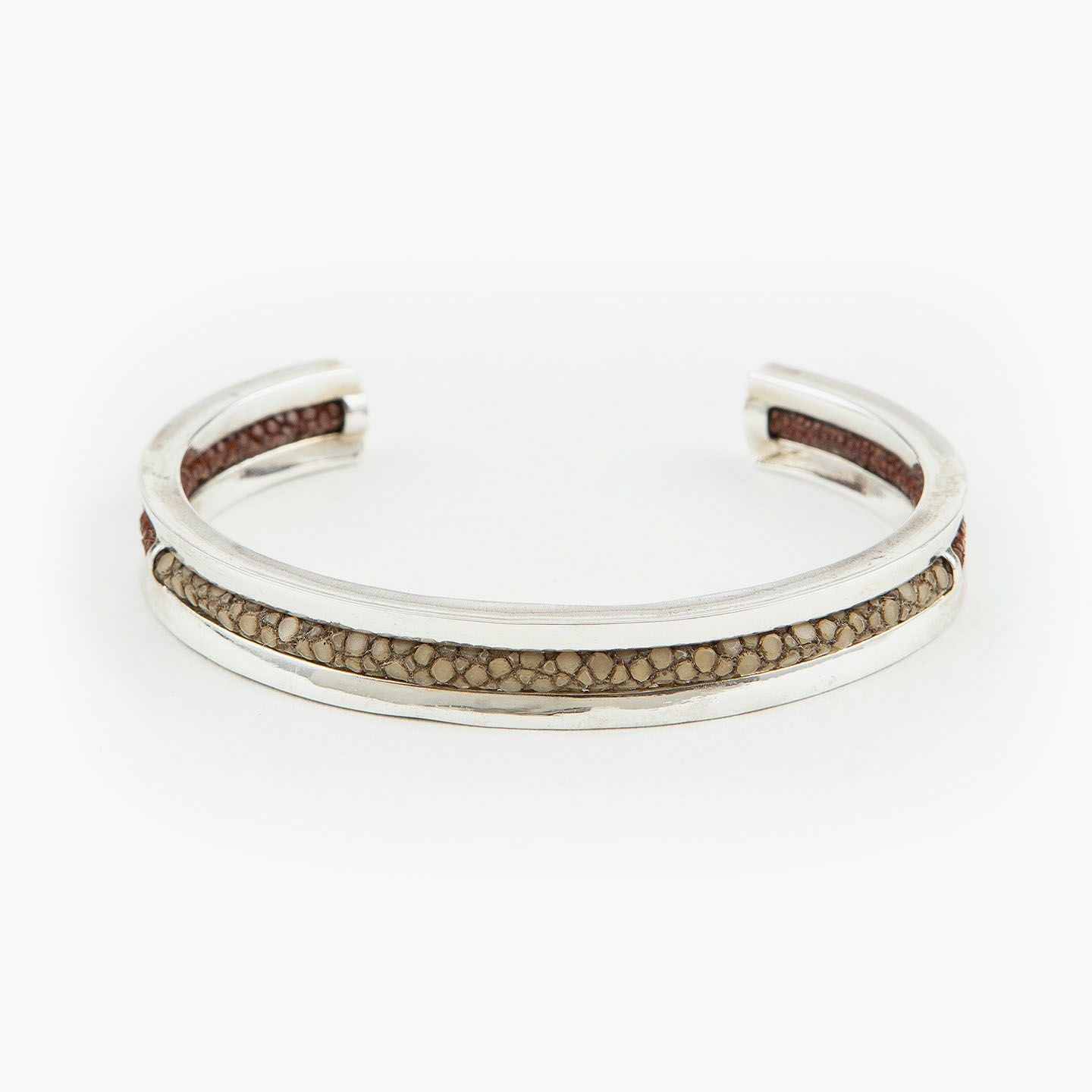 クリエイティビティとクオリティにこだわる革職人たちが、飽くなき探求と努力により最高のパフォーマンスを実現しているブランド『Atelier AKNAS』のバングル“ROHAN”。ガラスビーズを散りばめたようなアカエイの小さな鱗が美しい「ガルーシャ」を、熟練の職人がハンドメイドで丸く曲げた、無垢の「シルバー925」によるフレームの中抜き部分に、曲線に沿わせながら丁寧に組み込み、エレガントな上質感を創出。“海の宝石”と言われる2色のエイ革による重厚感を表現しながら、見た目よりも軽量化させているツヤ肌のメタルフレームが、重さを感じずカジュアルに装着でき、ジュエリーとしての愛着感をさらに高めてくれる。