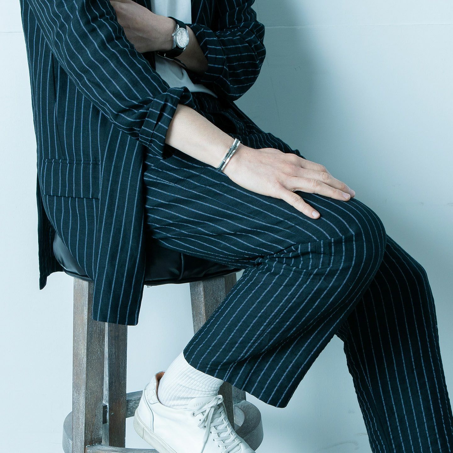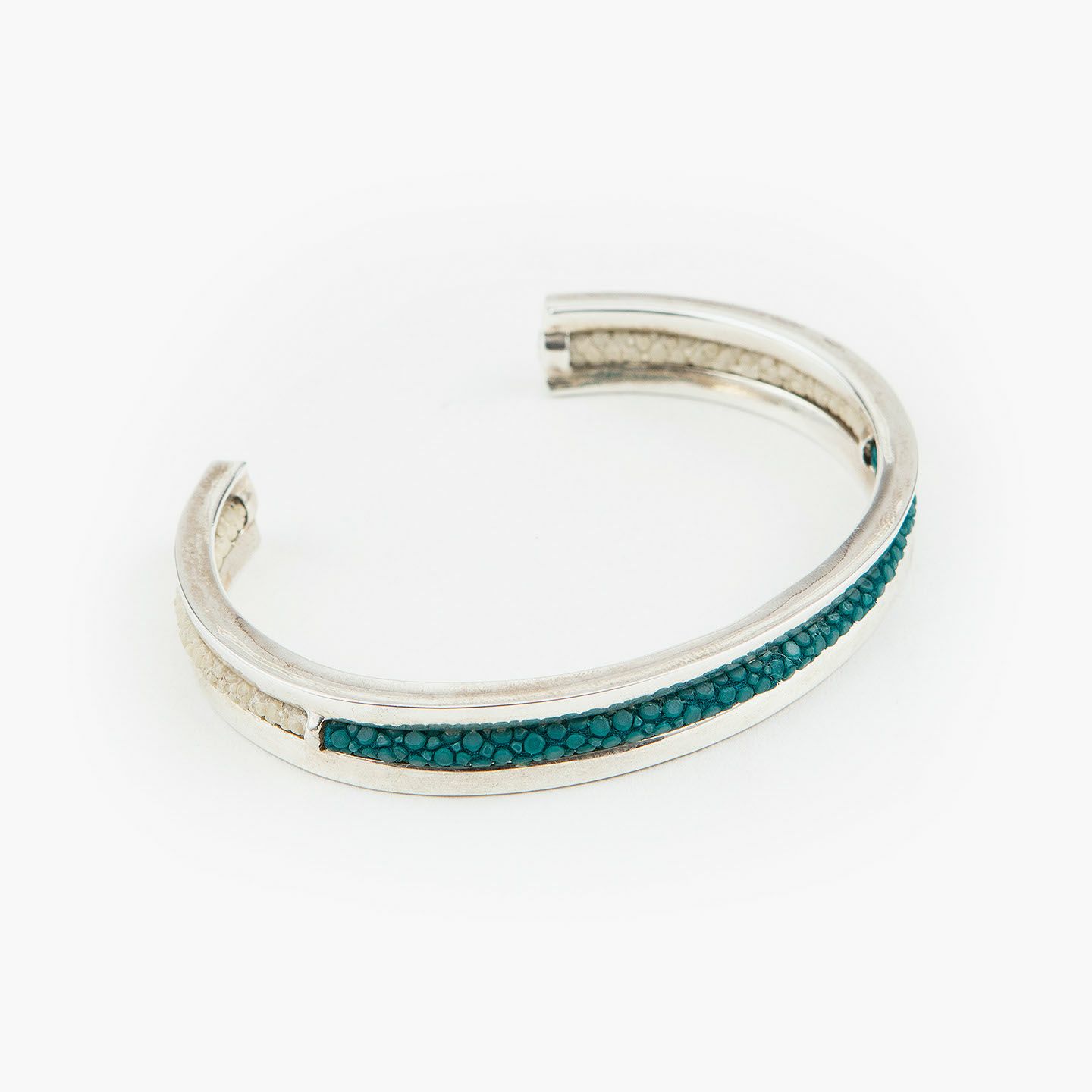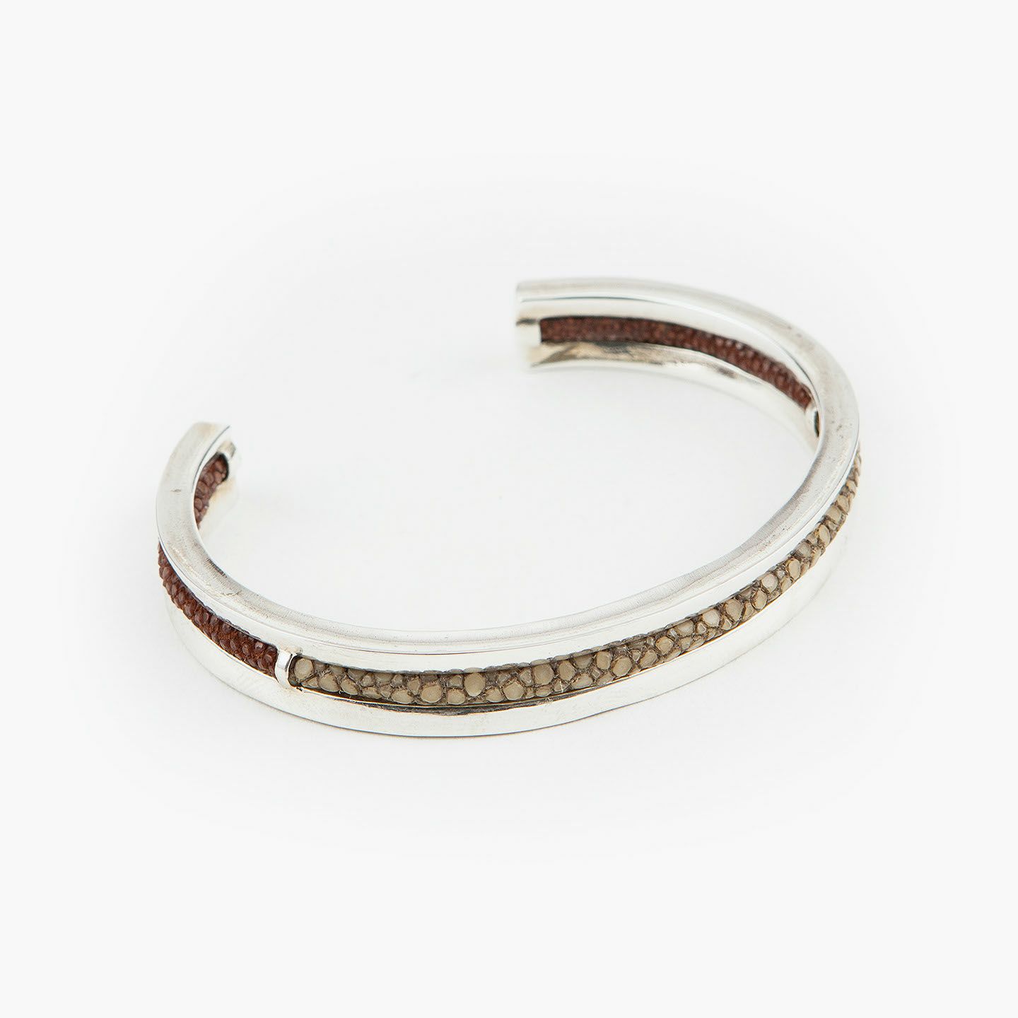 クリエイティビティとクオリティにこだわる革職人たちが、飽くなき探求と努力により最高のパフォーマンスを実現しているブランド『Atelier AKNAS』のバングル“ROHAN”。ガラスビーズを散りばめたようなアカエイの小さな鱗が美しい「ガルーシャ」を、熟練の職人がハンドメイドで丸く曲げた、無垢の「シルバー925」によるフレームの中抜き部分に、曲線に沿わせながら丁寧に組み込み、エレガントな上質感を創出。“海の宝石”と言われる2色のエイ革による重厚感を表現しながら、見た目よりも軽量化させているツヤ肌のメタルフレームが、重さを感じずカジュアルに装着でき、ジュエリーとしての愛着感をさらに高めてくれる。