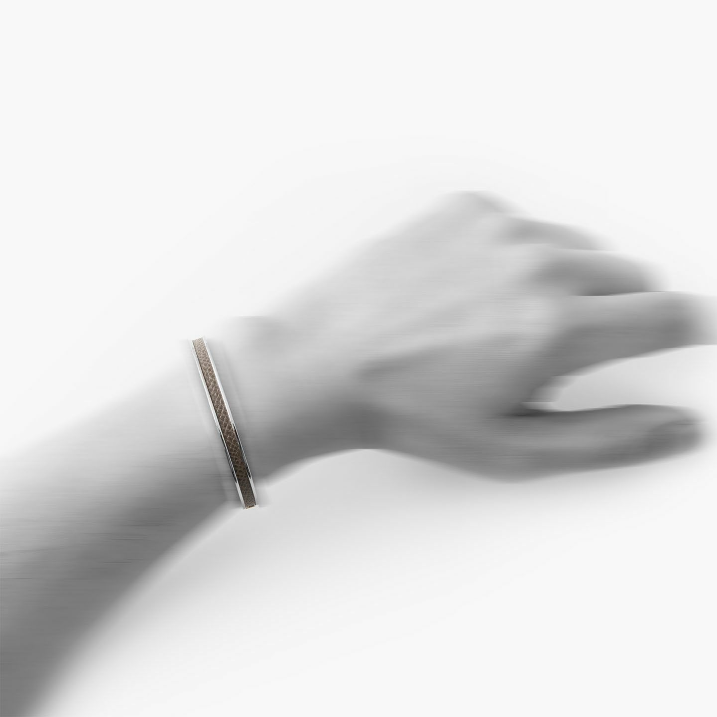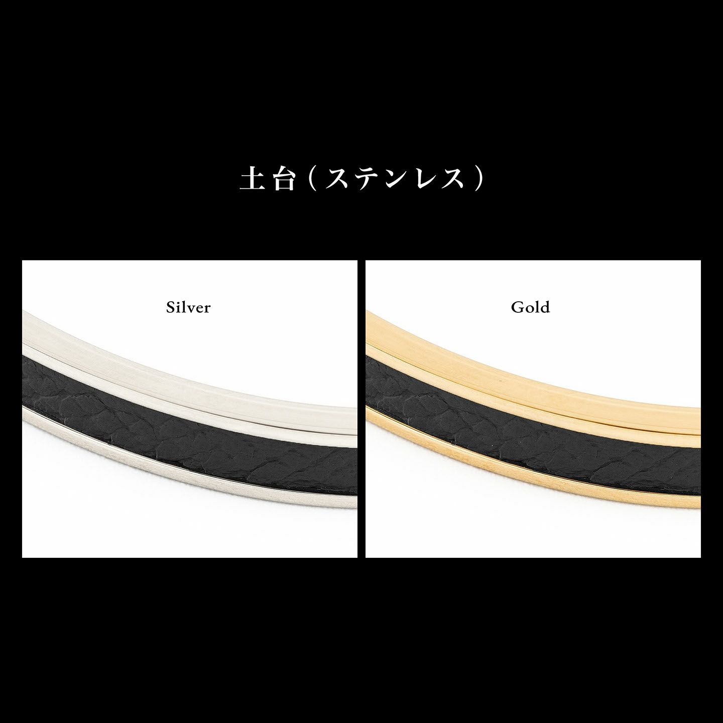手仕事によるワンランク上の革製品を届けるために、若き革職人・古志勝也が、時間と手間を惜しまず丁寧に製作しているブランド『CAUCHY』のバングル[6mm]。細かく型押しされたマットな表情が美しい高級カーフ「ダービー」は豊富なカラーから、医療用の器具にも使われている土台の「サージカルステンレス(316L)」はSilver/Goldのいずれから、好みの組み合わせを選べるカラーオーダーが魅力。温かみのあるレザーによる天然の素材感と、金属アレルギーを起こしにくく、キズ・錆び・変色もしにくい上質なメタル感が、独特の洒落感を醸しながらエレガントに融合。ひとつ上のスタイリッシュさで、腕周りを飾ってくれる。