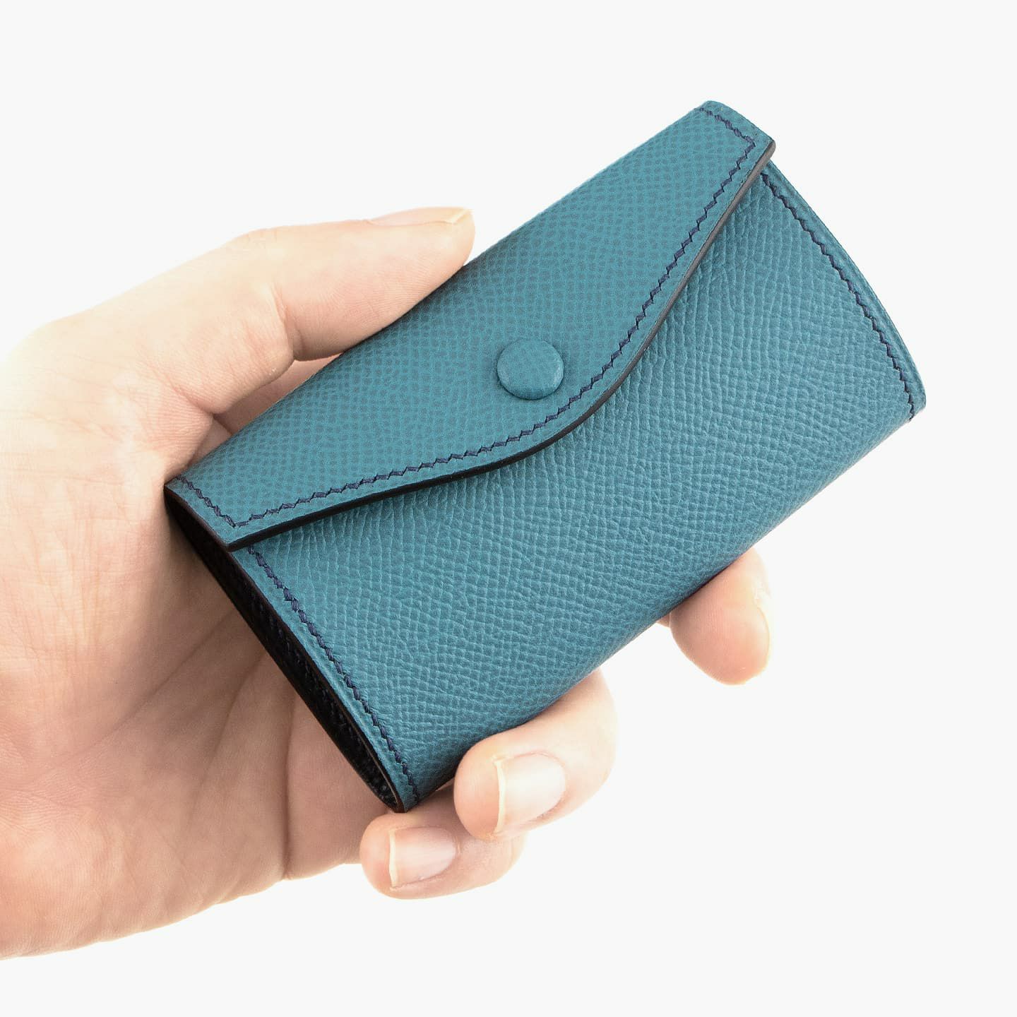 外装・内装ともに、小キズが目立ちにくく水分にも強い、フランス製の型押し牛革「ダービー」を採用。オリジナルの曲線が美しいフラップは、上品なアクセントにもなっている「ダービー」の革ぐるみボタンとともに、洒落た雰囲気を醸し出しながら、片手でも開けやすい実用性も両立。さらに、内部ポケットをあえて省いたミニマムな仕様が、スイス・amiet社製の6連キーケース金具の洗練さと相まって、上質なアイテムへと昇華させています。