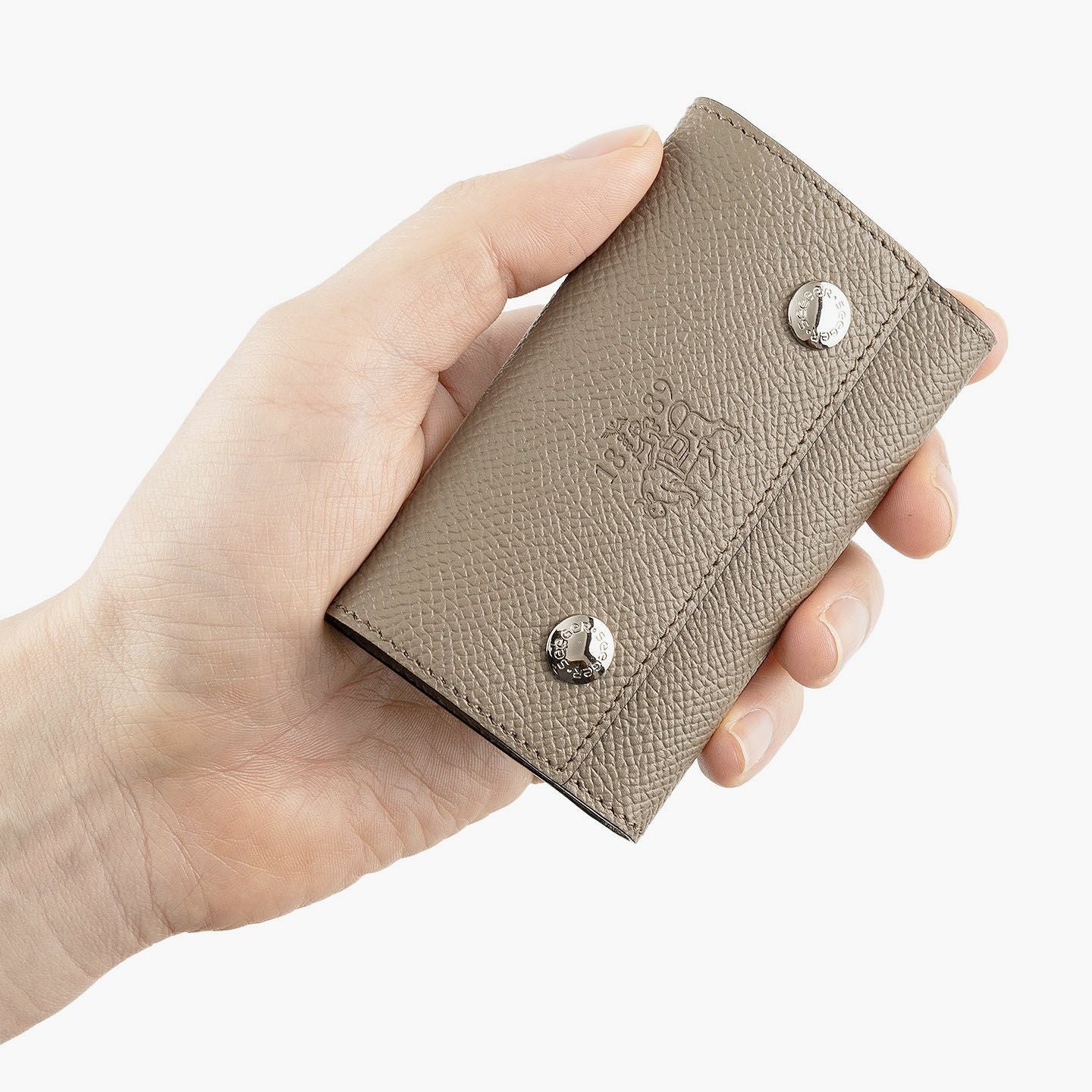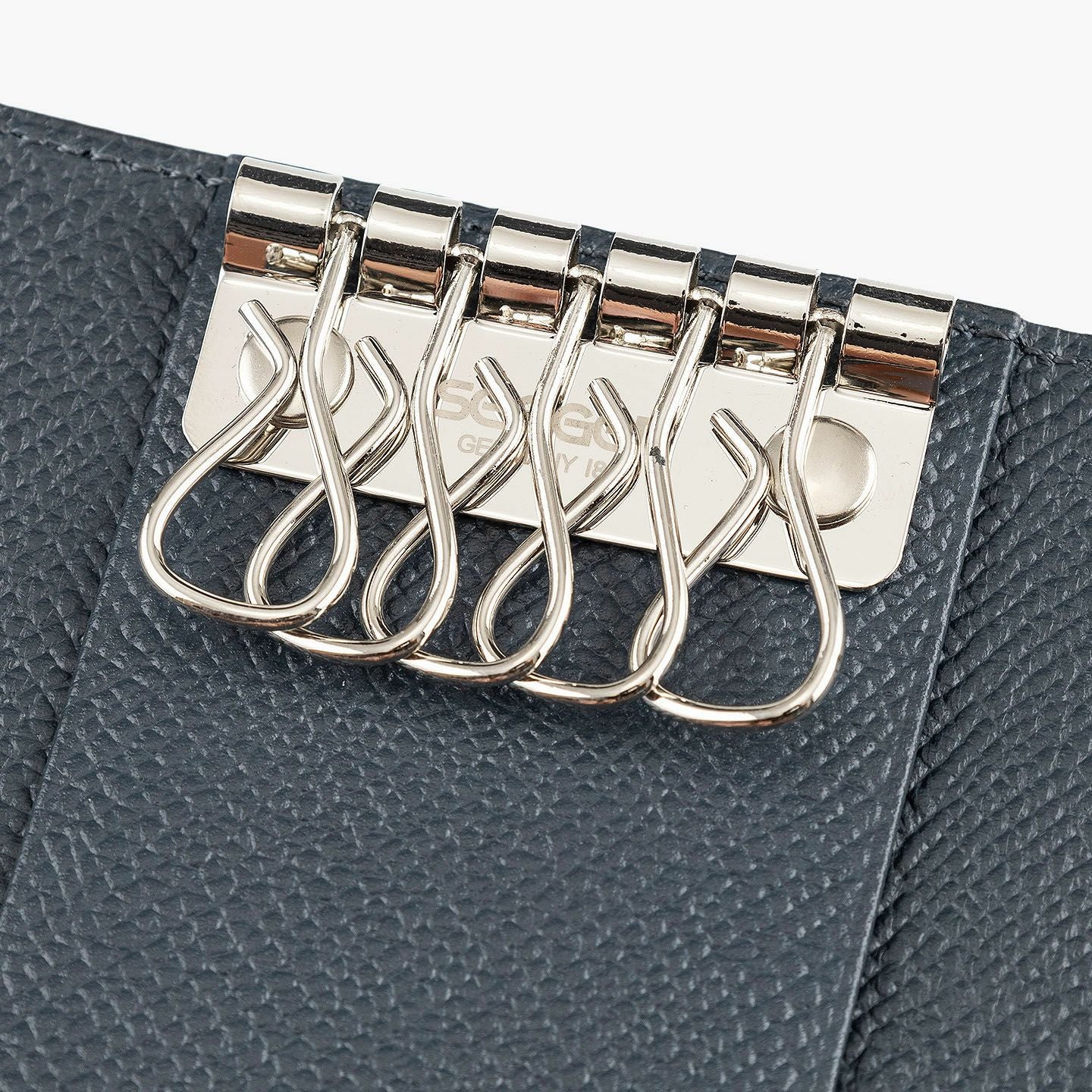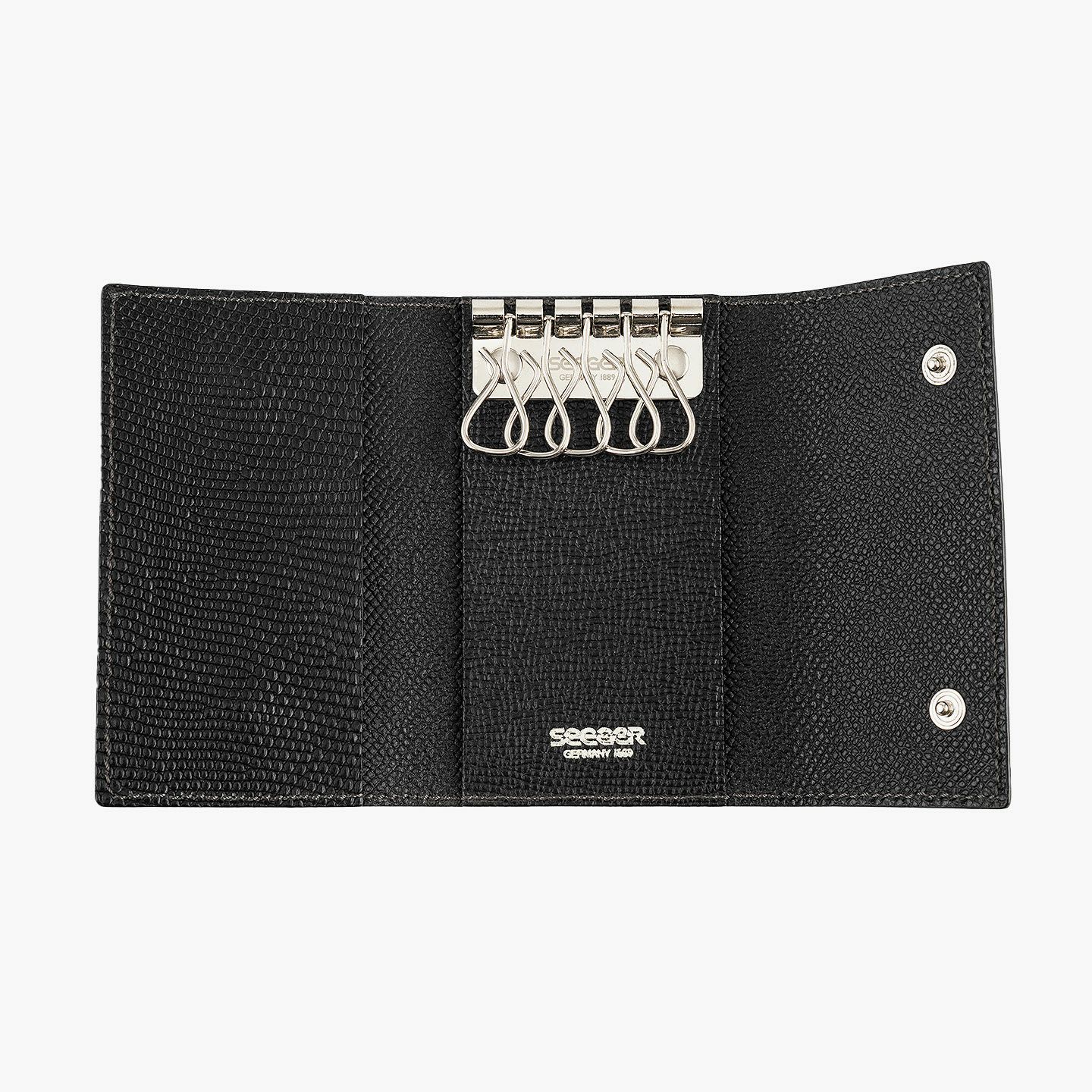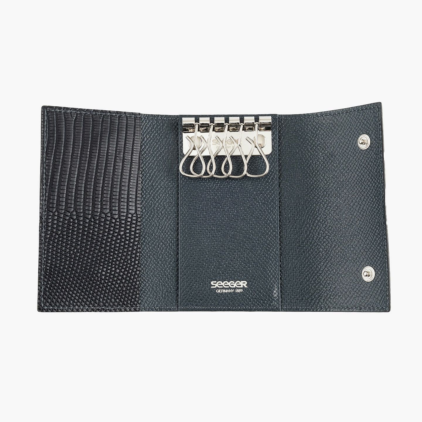 ドイツ・オッフェンバッハで1889年に創業し、「紳士にふさわしい品格と存在感を放つもの」をコンセプトに、日本の職人たちが蘇らせたブランド『SEEGER』のキーケース“Poseidon”。小キズに強くカジュアルに扱える型押し牛革「ボーダーハード」を採用し、高級感のある細かな型が表面の強度を高めていながらも、非常にしなやかな触り心地も魅力。内装装飾としてフリーポケットにあしらわれたトカゲ革「リザード」が、同じカラーでありながらも異なる質感・風合いで、遊び心のある洒落感を演出。5連キーフックは、硬度の高いリン青銅製を用いることで、シンプルな美しさと機能性を併せ持ち、普段使いにスマートさを創出してくれる。
