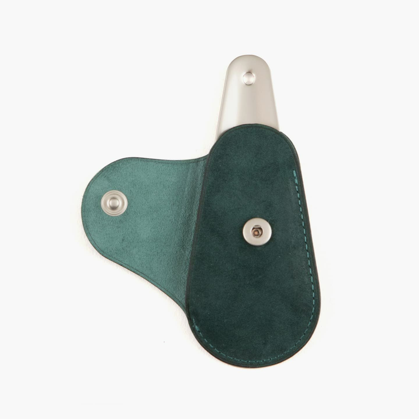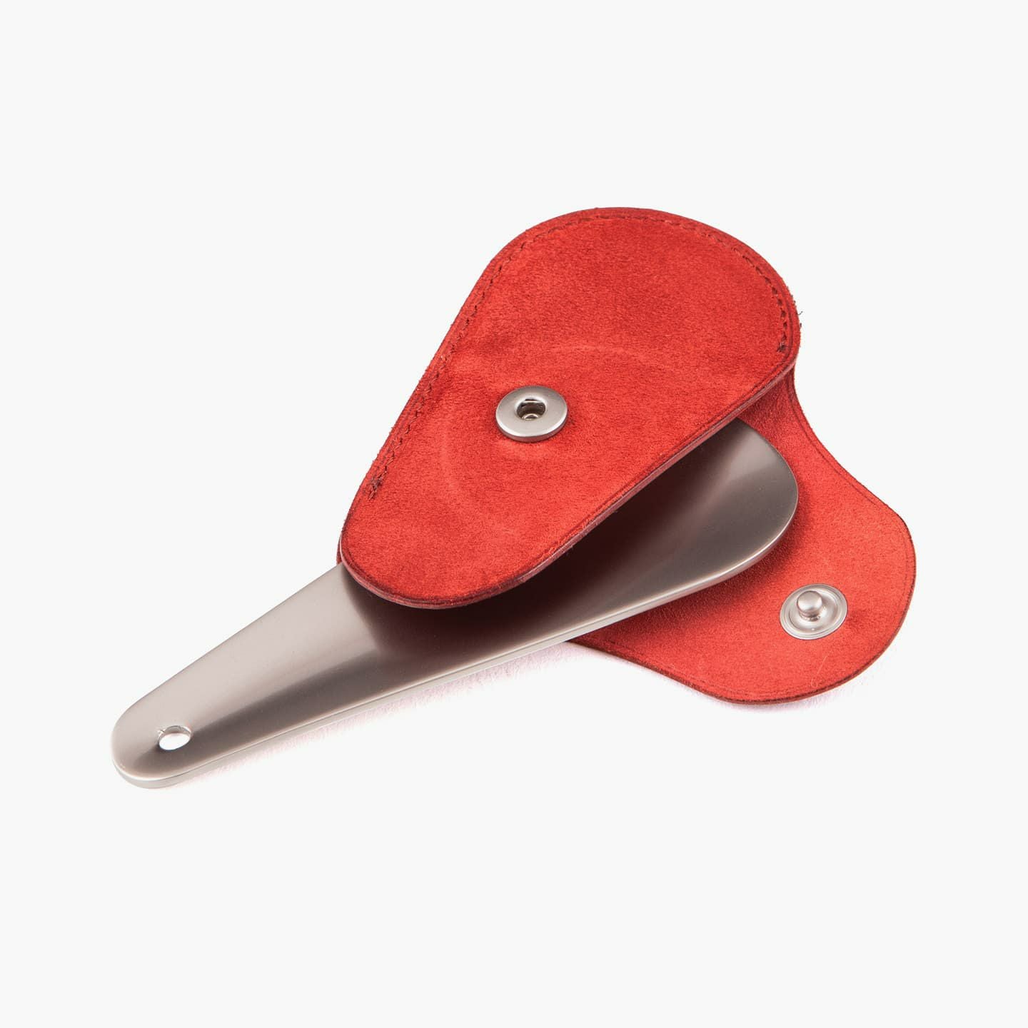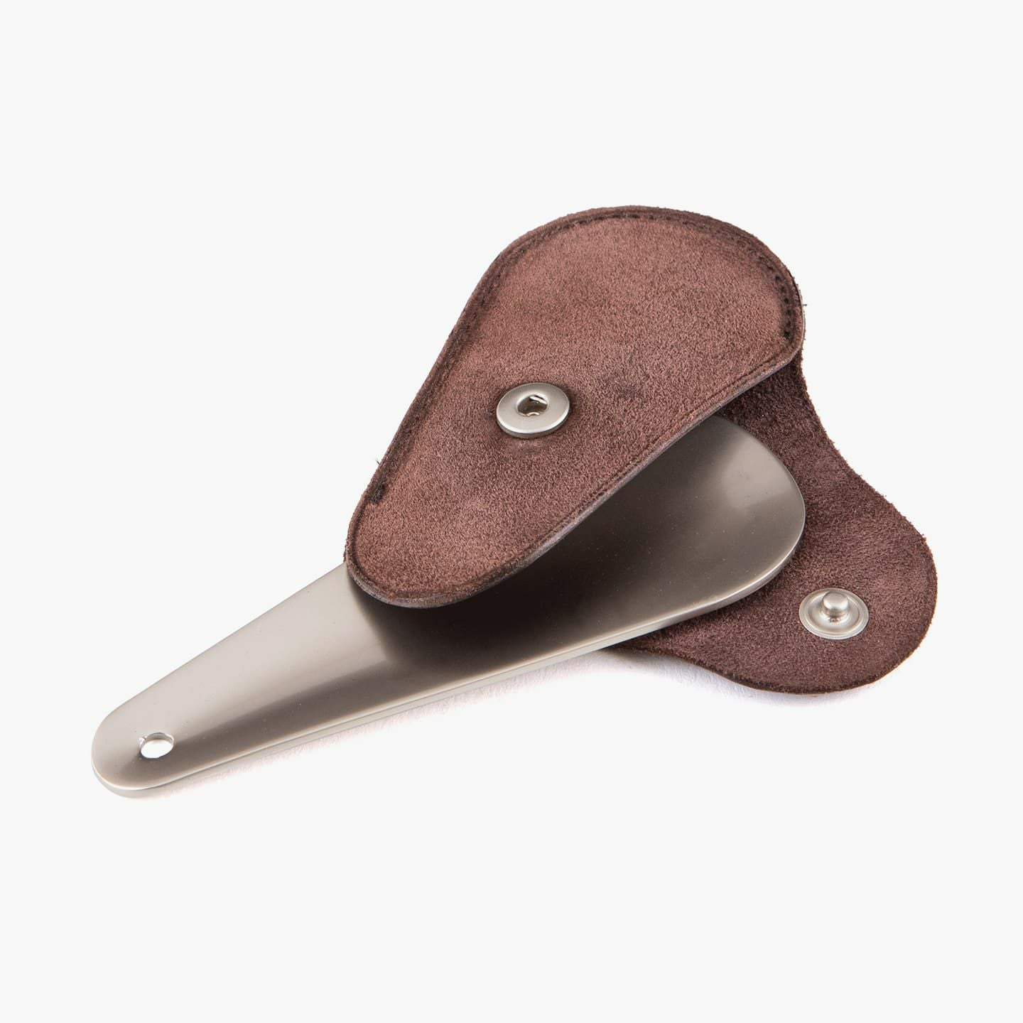 上質なマット感が、洗練さを醸す真鍮製の靴べら。靴のデザインをモチーフにした、芯も裏地も使わない一枚仕立てのホック付きカバーを付属し、拳銃のホルスターのように洒落たアクセサリーとして身につけることも可能。可能な限りパーツを分割せず、革が繋がるように設計し、滑らかな質感・しなりが感じられる丁寧な折りによる造形を実現しています。