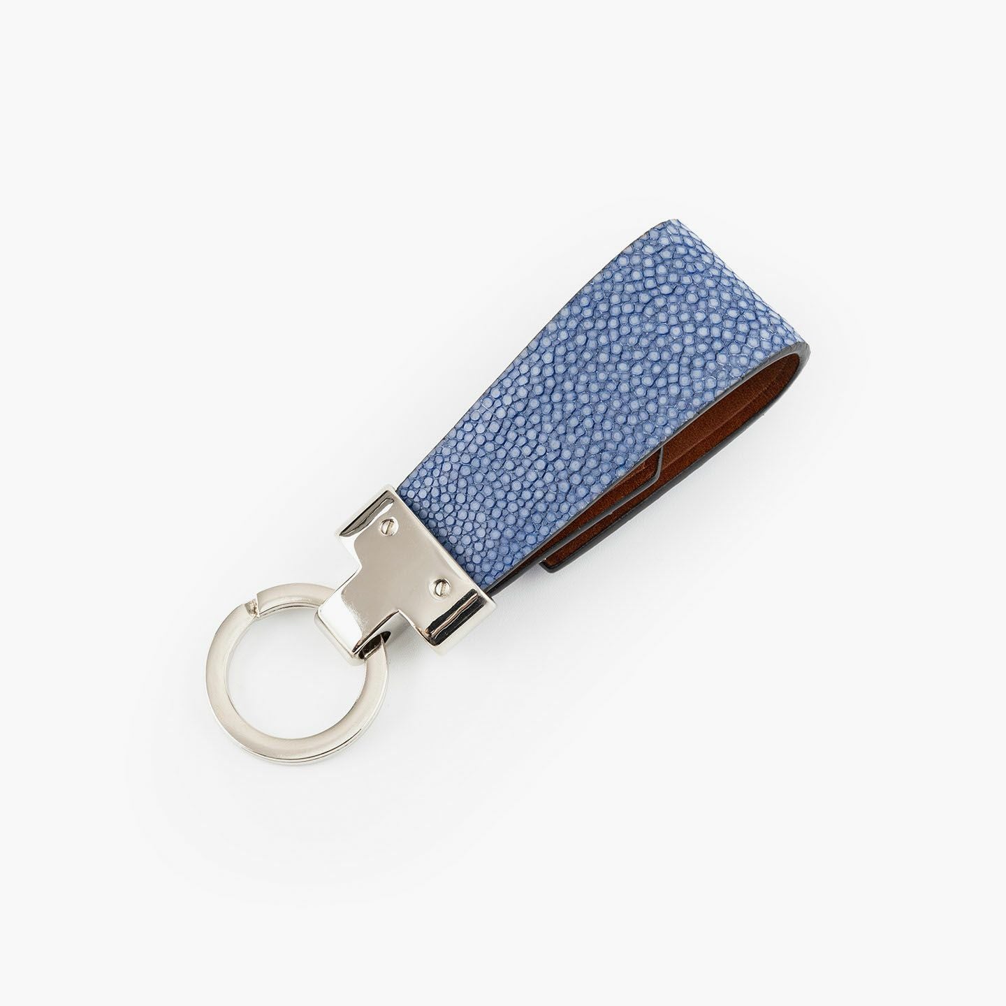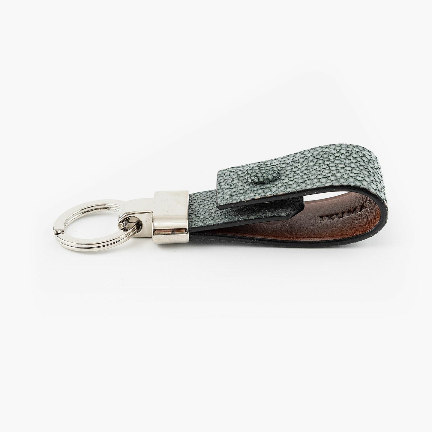 素材感を際立たせるシンプルなデザインと、表地・革芯・裏地の三層構造による膨らみを感じるフォルムで魅せる、高級感あふれるキーホルダー。アカエイの表面を削って面を出した“吟スリ”を採用している表地「ガルーシャ」は、古来より“ラッキーフィッシュ”とも呼ばれ、縁起が良い幸運なマテリアルとして重宝され、宝石を散りばめたようなキラキラと輝く独特の表情が魅惑的。その表地とまったく異なる質感の裏地「ブッテーロ」は、革らしい自然な風合いと美しい透明感がエレガントで、表裏でそれぞれ引き立て合う2つの高級皮革が、普段使いのアイテムに贅沢感を。人の目を惹くほどの佇まいが、極上な大人感を演出してくれる。