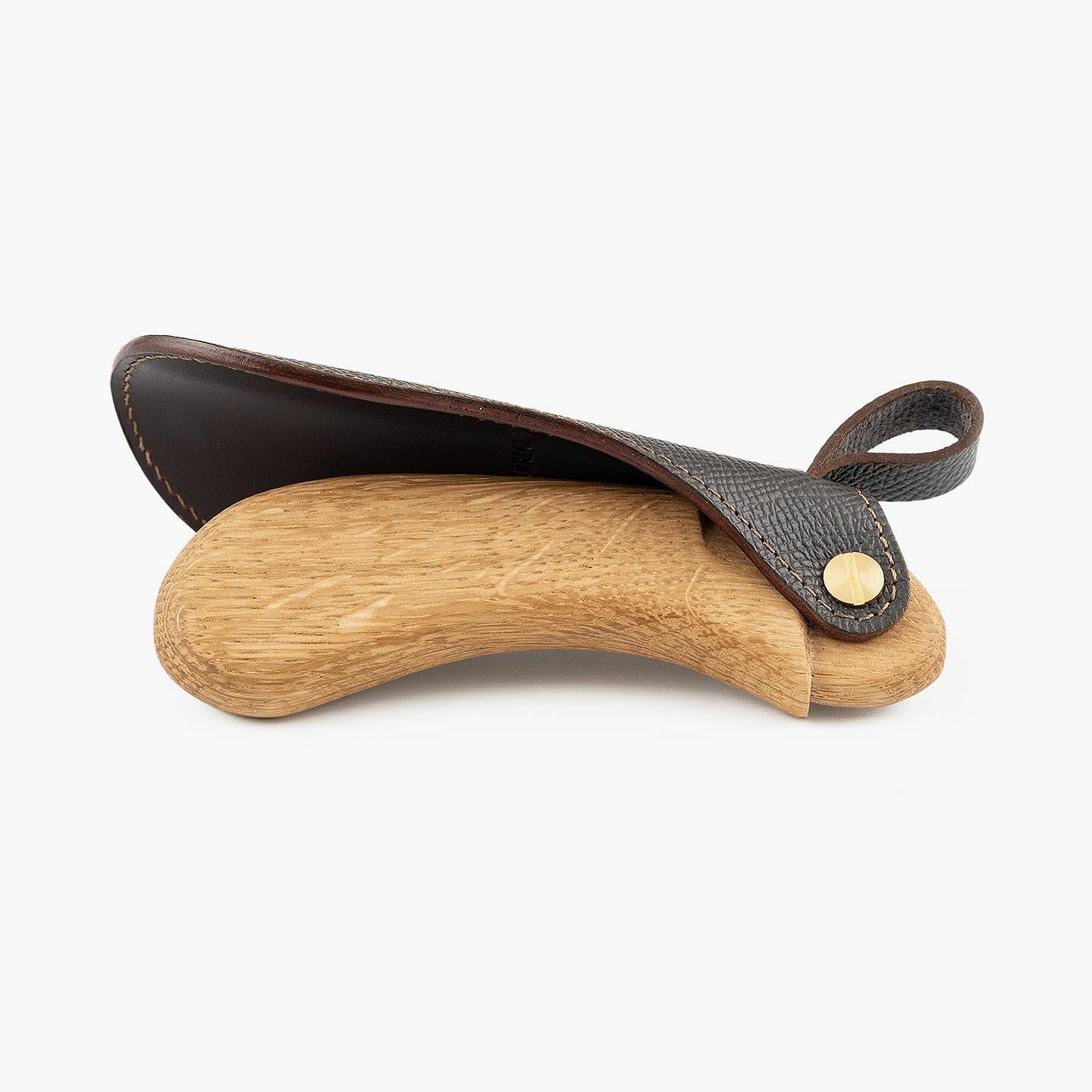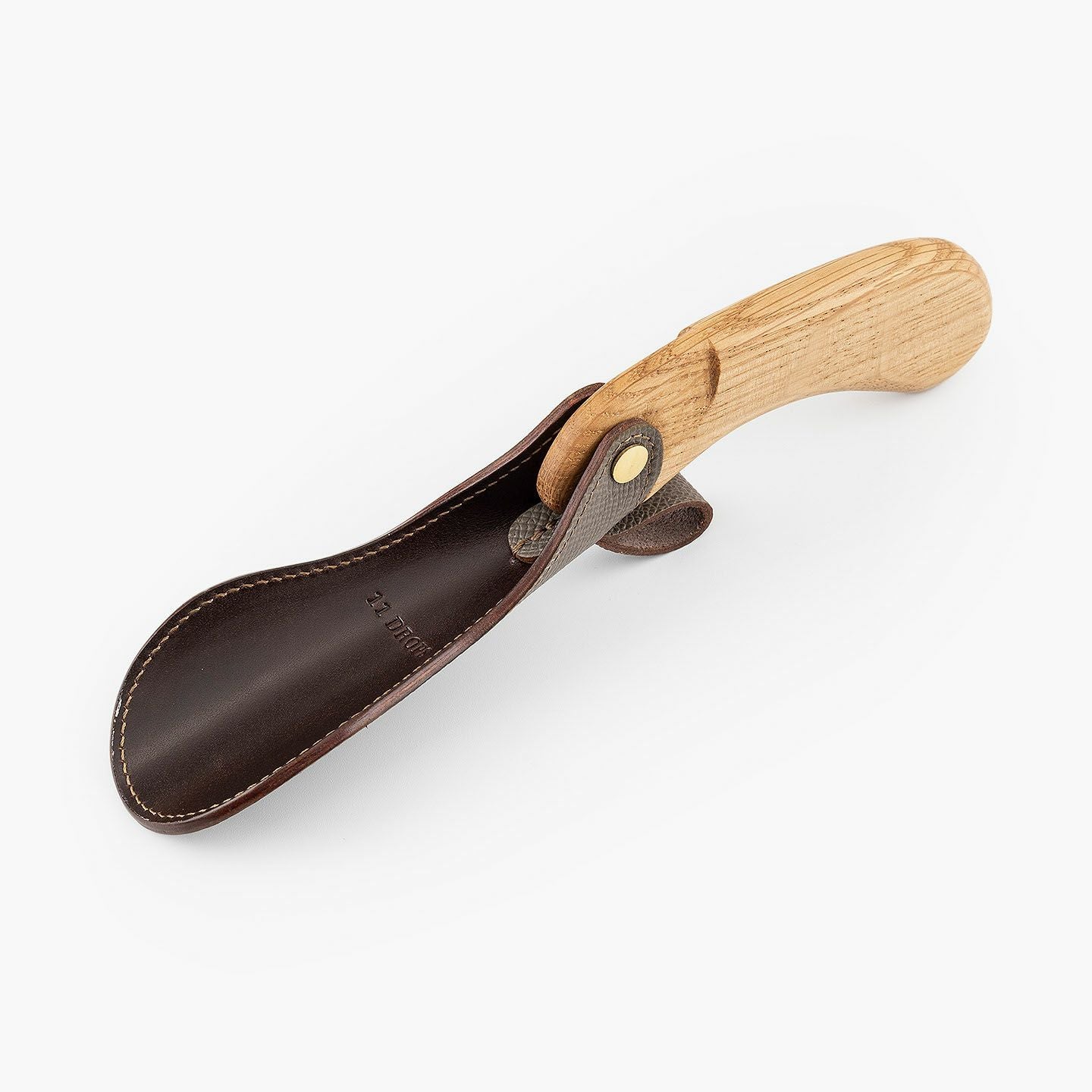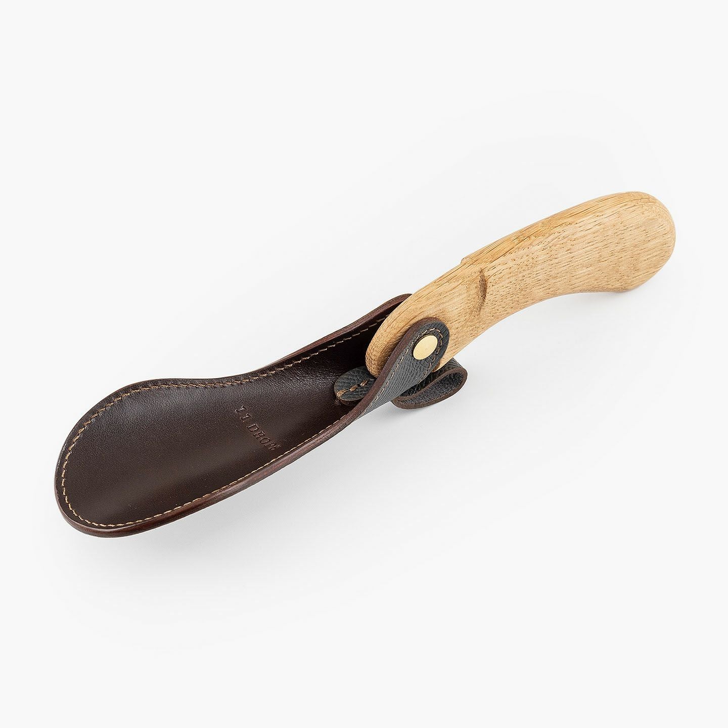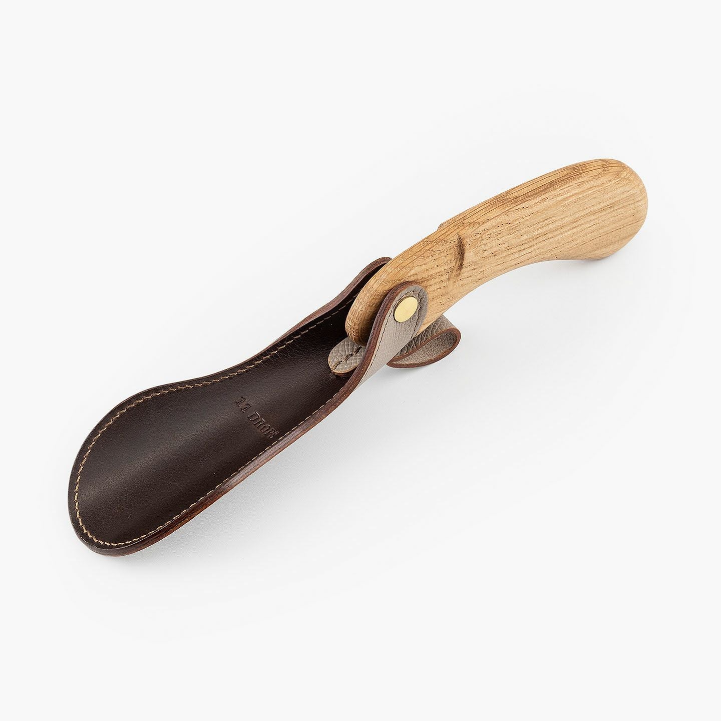 “最後の一滴”まで使い切るモノ作りをしたい願いと、皮革・木材の廃材など11の素材を扱う想いが、ブランド名に込められている、『11DROPS』のシューホーン(S)“Scooper”。折り畳んだときに見た目の印象を表現する外革には、細かなシボ感が魅力的な「ダービー」を贅沢にあしらい、靴ベラとして使うときに自分の踵にあたる内革「サドルプルアップ」とともに、ハリと柔軟性を併せ持たせることで、やさしく足と靴にフィットして快適な使い心地を実現。天然木材から削り出して、反り返るような角度に仕上げたグリップとともに、腰を屈めずスムーズに履ける長さの独創的な全体フォルムが、普段使いに楽しさを与えてくれる。