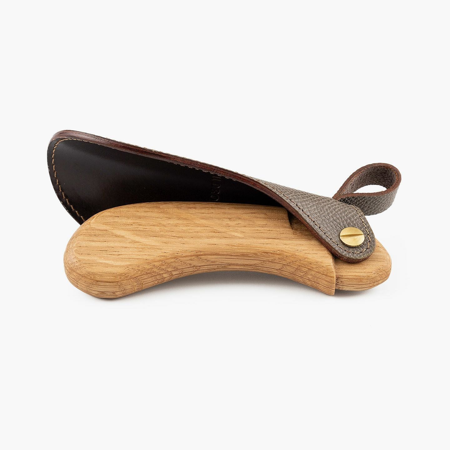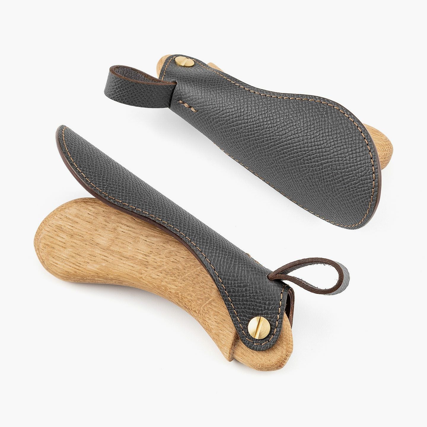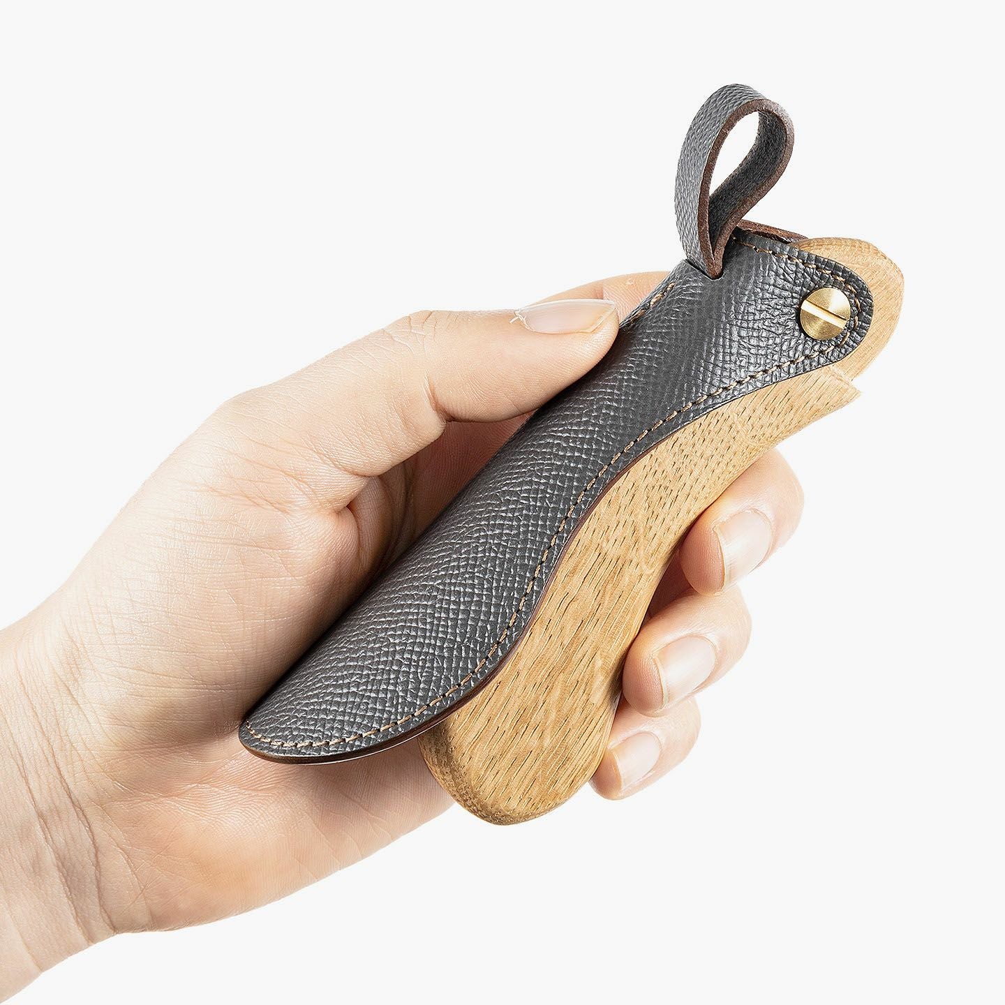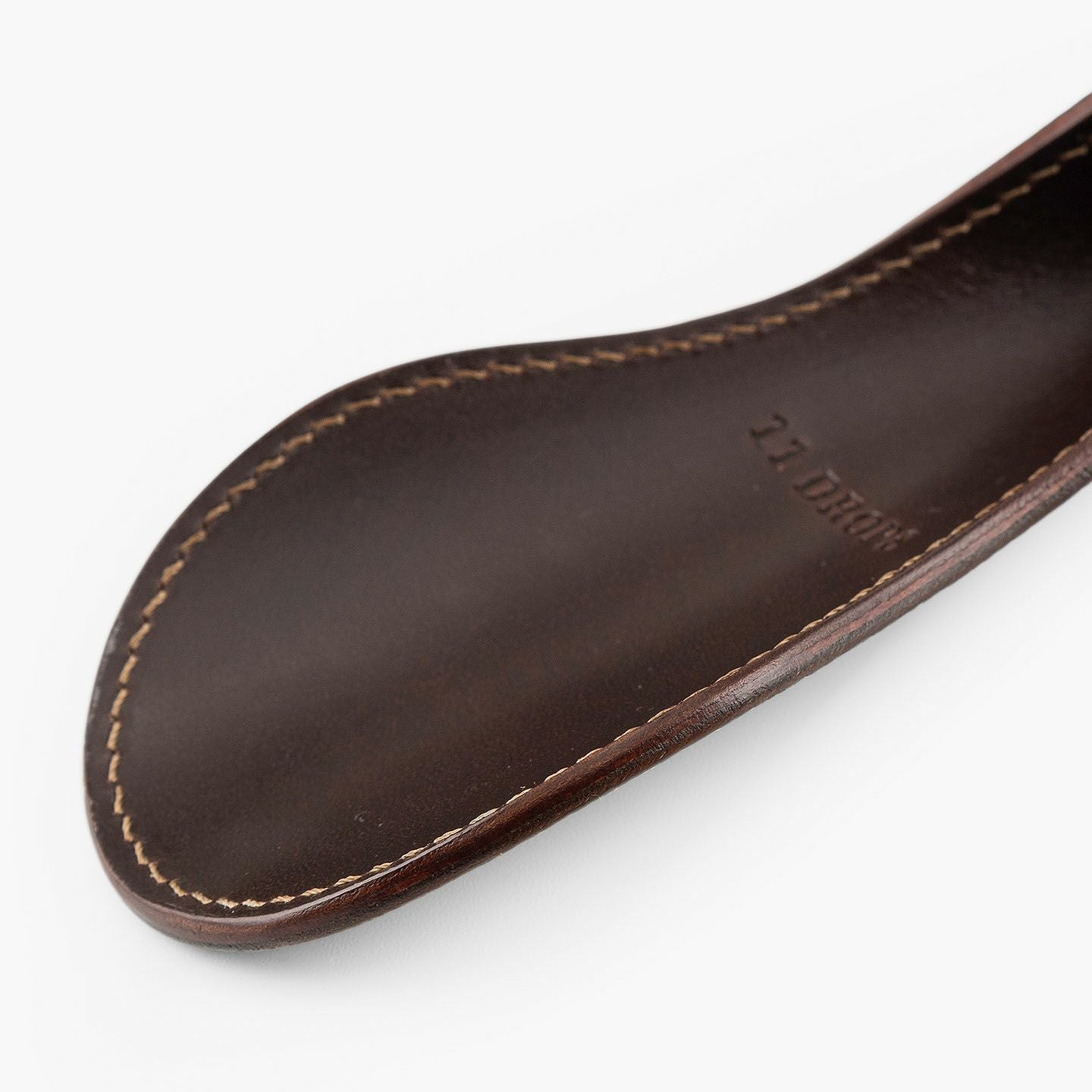 “最後の一滴”まで使い切るモノ作りをしたい願いと、皮革・木材の廃材など11の素材を扱う想いが、ブランド名に込められている、『11DROPS』のシューホーン(S)“Scooper”。折り畳んだときに見た目の印象を表現する外革には、細かなシボ感が魅力的な「ダービー」を贅沢にあしらい、靴ベラとして使うときに自分の踵にあたる内革「サドルプルアップ」とともに、ハリと柔軟性を併せ持たせることで、やさしく足と靴にフィットして快適な使い心地を実現。天然木材から削り出して、反り返るような角度に仕上げたグリップとともに、腰を屈めずスムーズに履ける長さの独創的な全体フォルムが、普段使いに楽しさを与えてくれる。