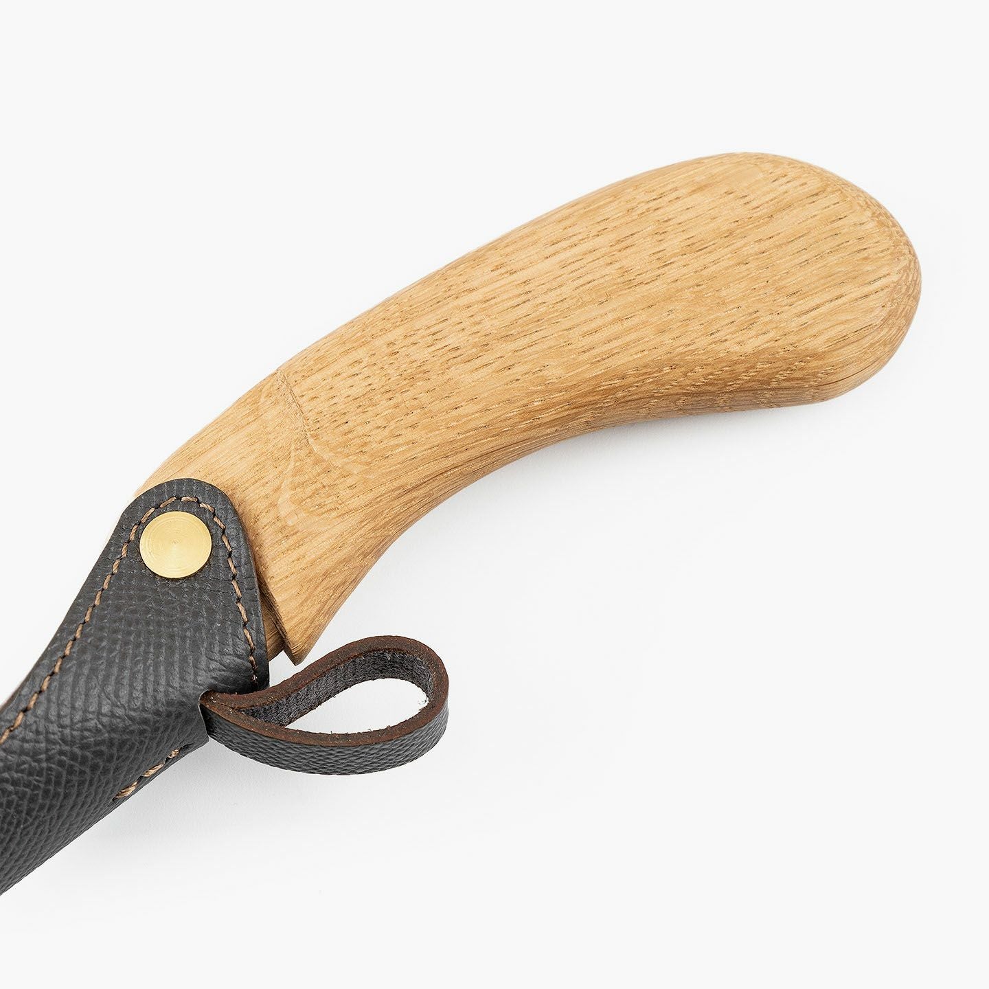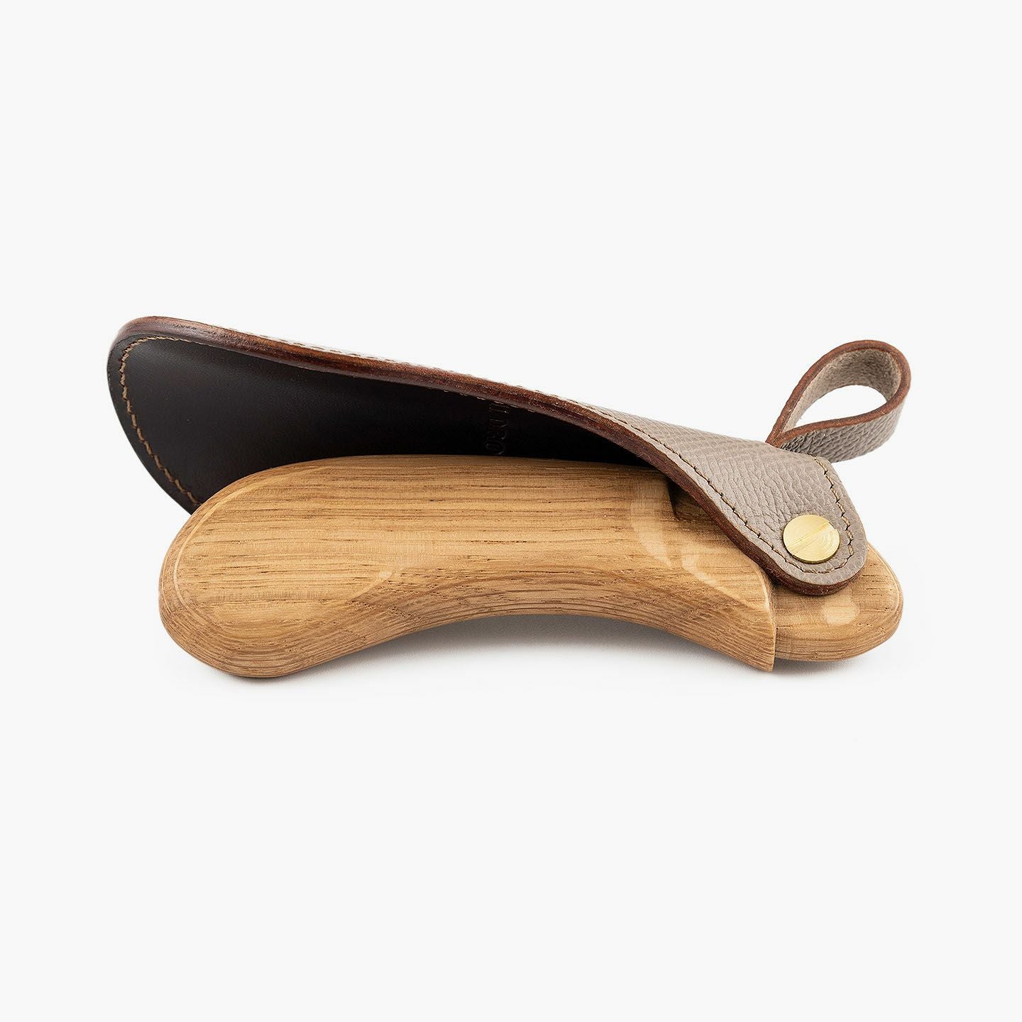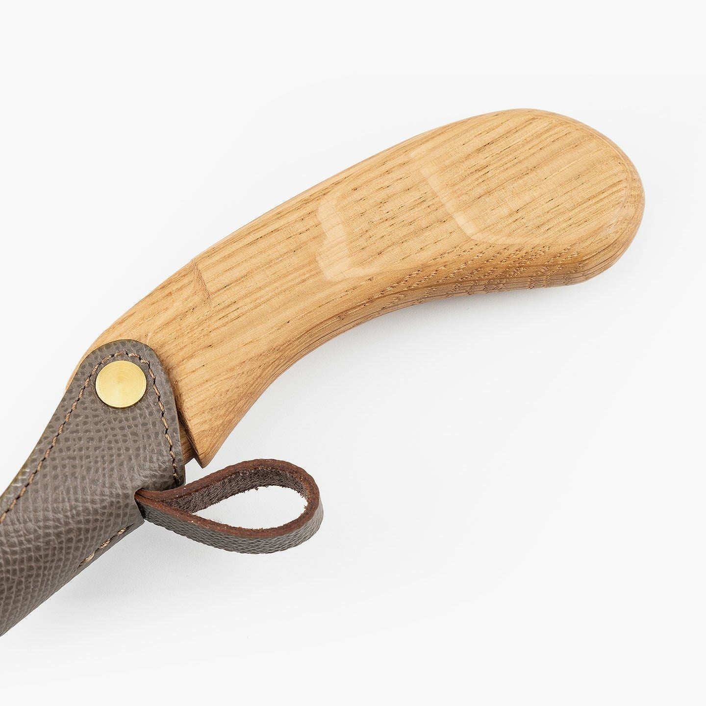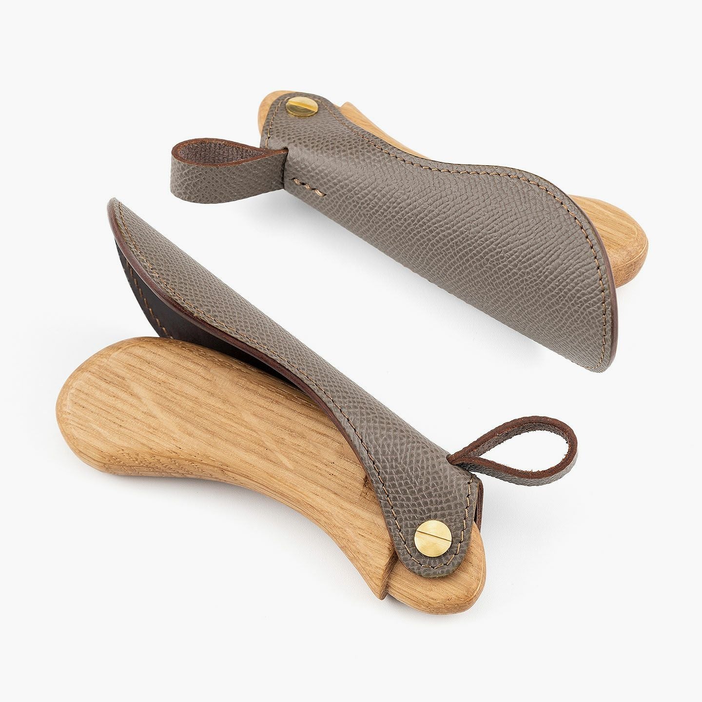“最後の一滴”まで使い切るモノ作りをしたい願いと、皮革・木材の廃材など11の素材を扱う想いが、ブランド名に込められている、『11DROPS』のシューホーン(S)“Scooper”。折り畳んだときに見た目の印象を表現する外革には、細かなシボ感が魅力的な「ダービー」を贅沢にあしらい、靴ベラとして使うときに自分の踵にあたる内革「サドルプルアップ」とともに、ハリと柔軟性を併せ持たせることで、やさしく足と靴にフィットして快適な使い心地を実現。天然木材から削り出して、反り返るような角度に仕上げたグリップとともに、腰を屈めずスムーズに履ける長さの独創的な全体フォルムが、普段使いに楽しさを与えてくれる。