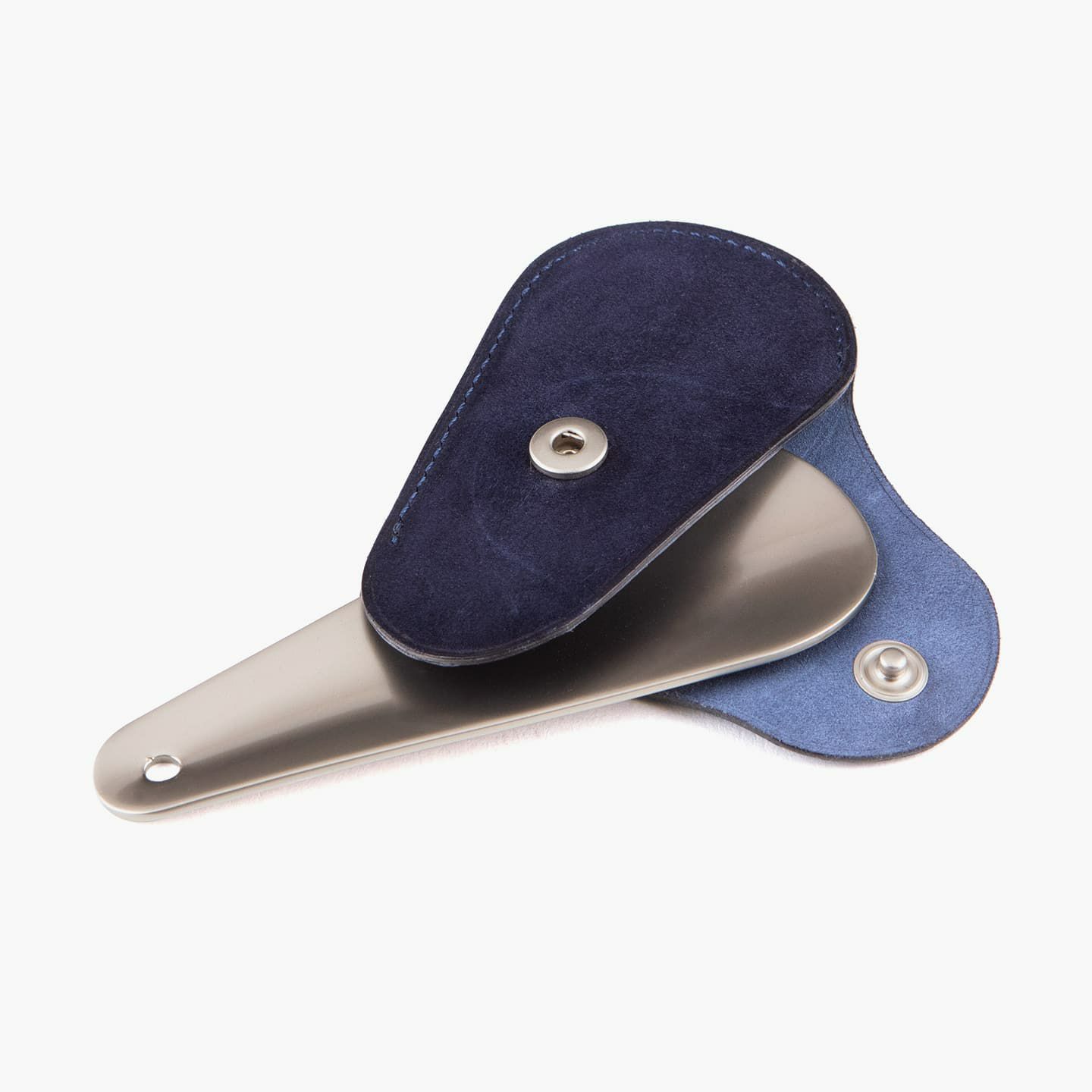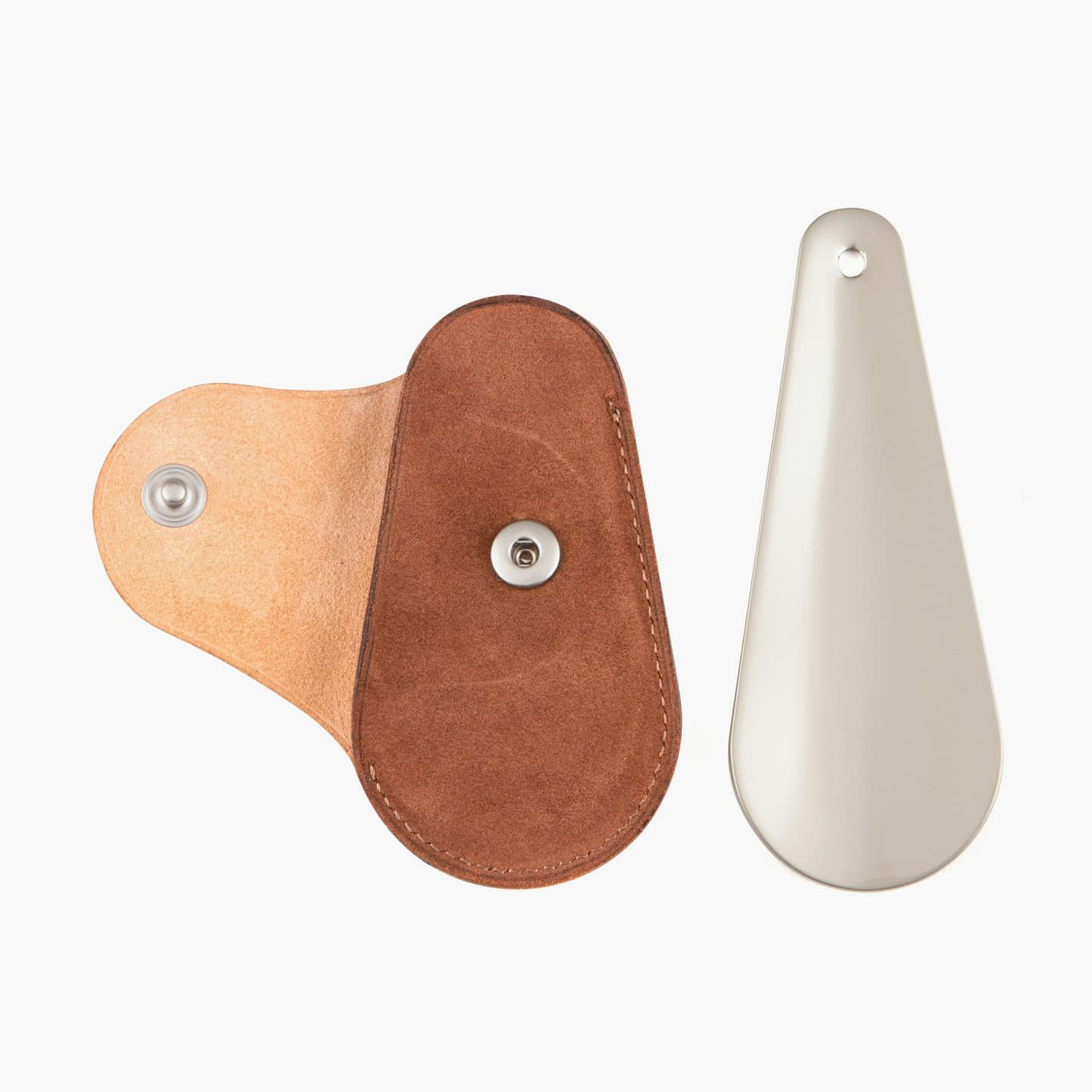 上質なマット感が、洗練さを醸す真鍮製の靴べら。靴のデザインをモチーフにした、芯も裏地も使わない一枚仕立てのホック付きカバーを付属し、拳銃のホルスターのように洒落たアクセサリーとして身につけることも可能。可能な限りパーツを分割せず、革が繋がるように設計し、滑らかな質感・しなりが感じられる丁寧な折りによる造形を実現しています。