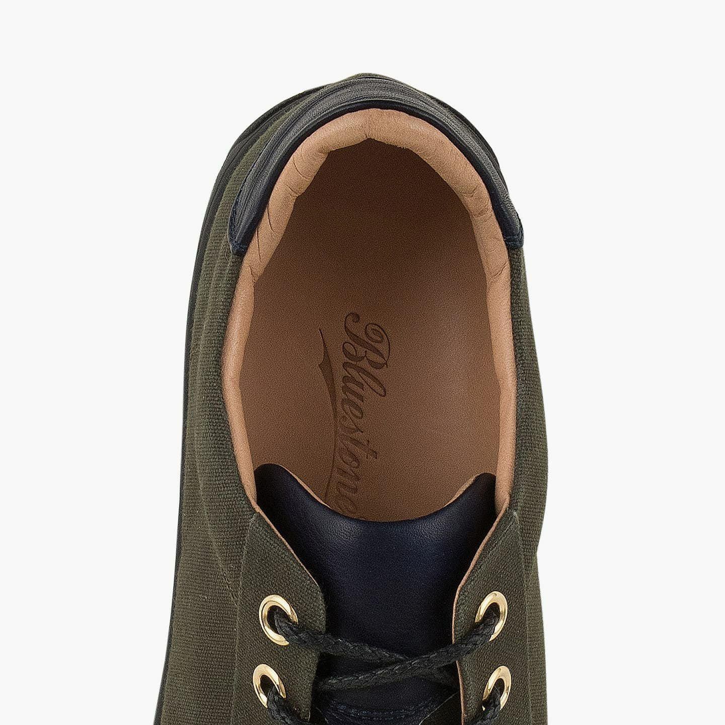 耐久性に優れた素材として知られ、トラックの帆や屋外テントなどに多く使われている綿帆布の中で、『Bluestone®』では岡山・倉敷産「9号帆布」に二度のパラフィン加工を施した「Wax Canvas」を採用。撥水効果を高めるためにロウ引きを施すパラフィン加工は、一般的には一回ですが、あえて二回施すことで生地の織目がより詰まり、耐久性と撥水性を向上させています。また、織目の詰まった生地では、太糸・太針による粗目の縫製が一般的ですが、『Bluestone®』では、ミシンの絶妙な速度調整などの高度な技術を要する細糸・細針による縫製を行っています。これにより、ハリ感を持たせつつ繊細な仕上がりを実現するとともに、使い込むことで織目が白くなる独特な「チョークマーク」が表面に生まれ、ビンテージ感のある風合いを作り出していきます。