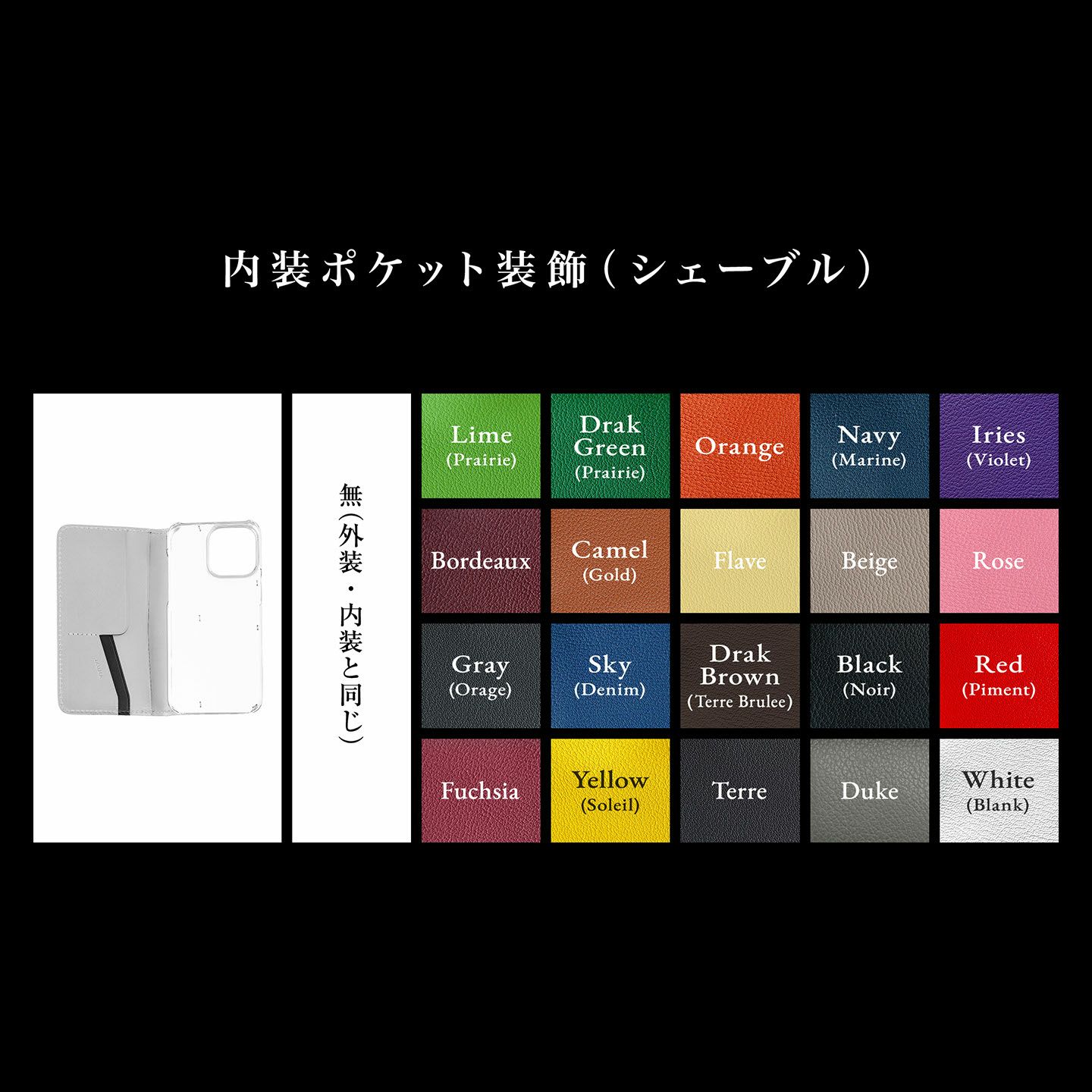 本体から「ポリカーボネート」の剥がれを起こさないためステッチを縫い込み、デザインのアクセントのように仕立てるなど、細部にまで革職人としての独創性が凝縮。カードポケット2つ・フリーポケット(小)1つ・フリーポケット(大)1つを装備している、内装の設計も横型のポケットにすることで、iPhoneの画面へのキズを防ぎながらカード・名刺・紙幣などを収納・携帯できるように配慮しています。また、外装・内装に採用している「ブッテーロ」は5カラーからチョイスでき、内装ポケット装飾を「シェーブル」に変更することも可能で、豊富な20色からアクセントとしてセレクトすることも可能。さらに、オプションでフラップ(マグネット式)を追加することもでき、裏返して留めてスタンドにしたり、話中に邪魔にならないように背面側に貼り付けられたり、職人の感性と技術も感じられます。