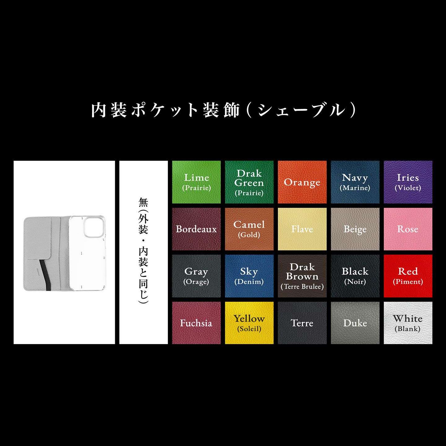 内装に、カードポケット2つ・フリーポケット(小)1つ・フリーポケット(大)1つを備え、横型のポケットにすることでiPhoneの画面へのキズを防ぎながら、カード・名刺・紙幣などの収納・携帯が可能。外装・内装の「シュランケンカーフ」は3色からセレクトできるとともに、内装ポケット装飾として「シェーブル」に変更すれば、そのアクセントを豊富な20色から選ぶことができます。さらに、マグネット式のフラップをオプションで追加することも可能で、裏返して留めるとスタンドになったり、背面側に貼り付けて通話中でも邪魔にならなかったり、さらなる使いやすさも実現。また、本体から「ポリカーボネート」の剥がれが起きにくいように縫い込んでいるステッチを、デザインのアクセントのように見せるなど、革職人としての独創性も注ぎ込まれています。