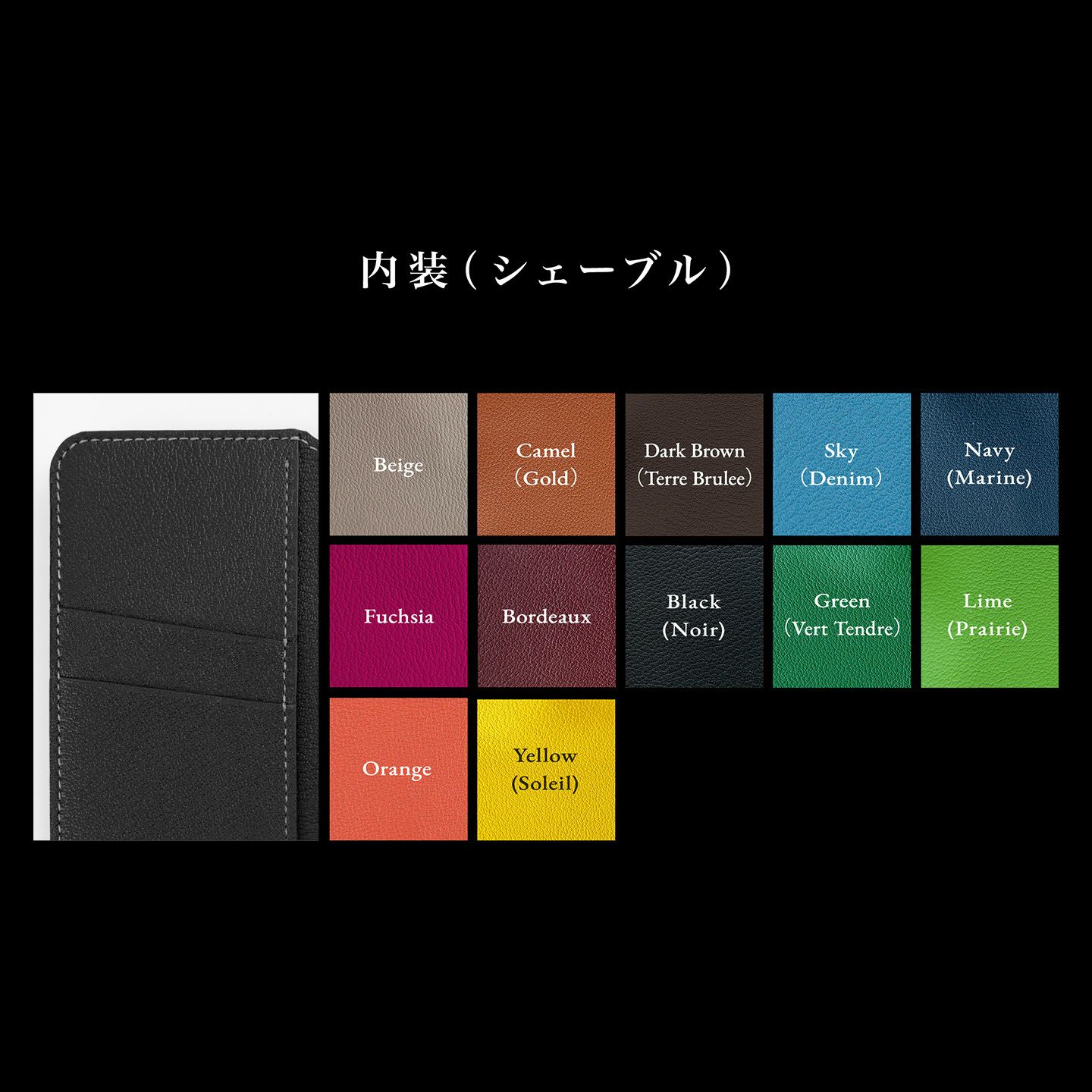 美しく鮮やかな発色と、繊維密度が高い丈夫さが魅力な、凹凸がはっきりと深いシボの高級皮革「Chervre(シェーブル)」。