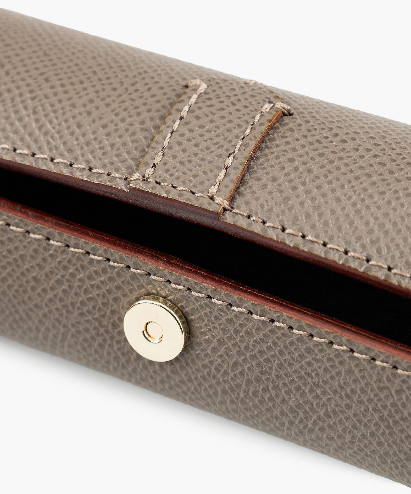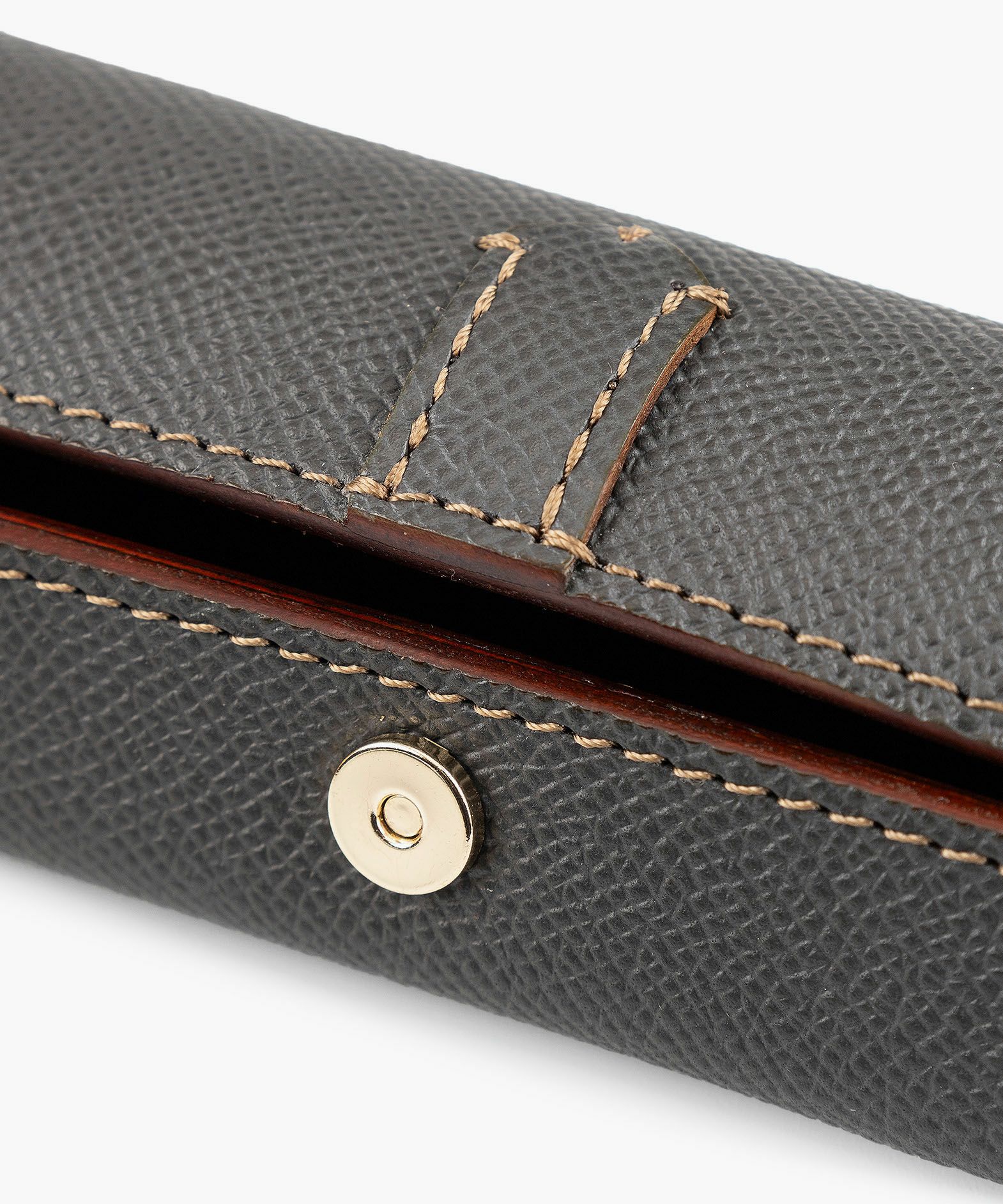 ドーム状のフォルムが外部からの衝撃を抑えるとともに、開いたまま置いておくとペントレーとしても使える形状になる、ペンケース“HANGAR-S”。その印象的なデザインの外装には、マットな型押しの表情が美しく、有名な老舗メゾンでも愛用されている、フランス・アース社製「ダービー」を採用。小キズ・汚れ・水分にも強いので、キレイな状態のまま長く使い続けられる特長も。内装の「ピッグスエード」は、高いクッション性で収納している筆記具をやさしく保護するとともに、手触りの良さも快適感を創出。マグネットホック式でワンタッチ開閉ができるとともに、大きく開くので視認性も高く、出し入れもしやすい構造。高級感あふれる上品なステーショナリーが、大人の洒落感をさらに引き上げてくれる。