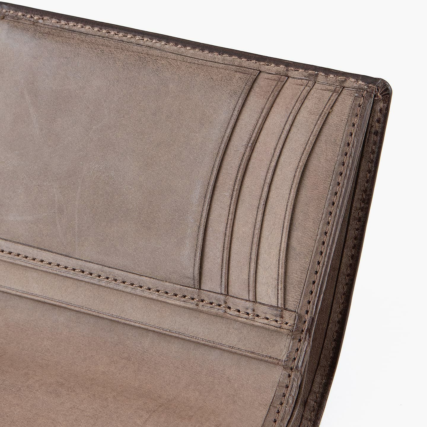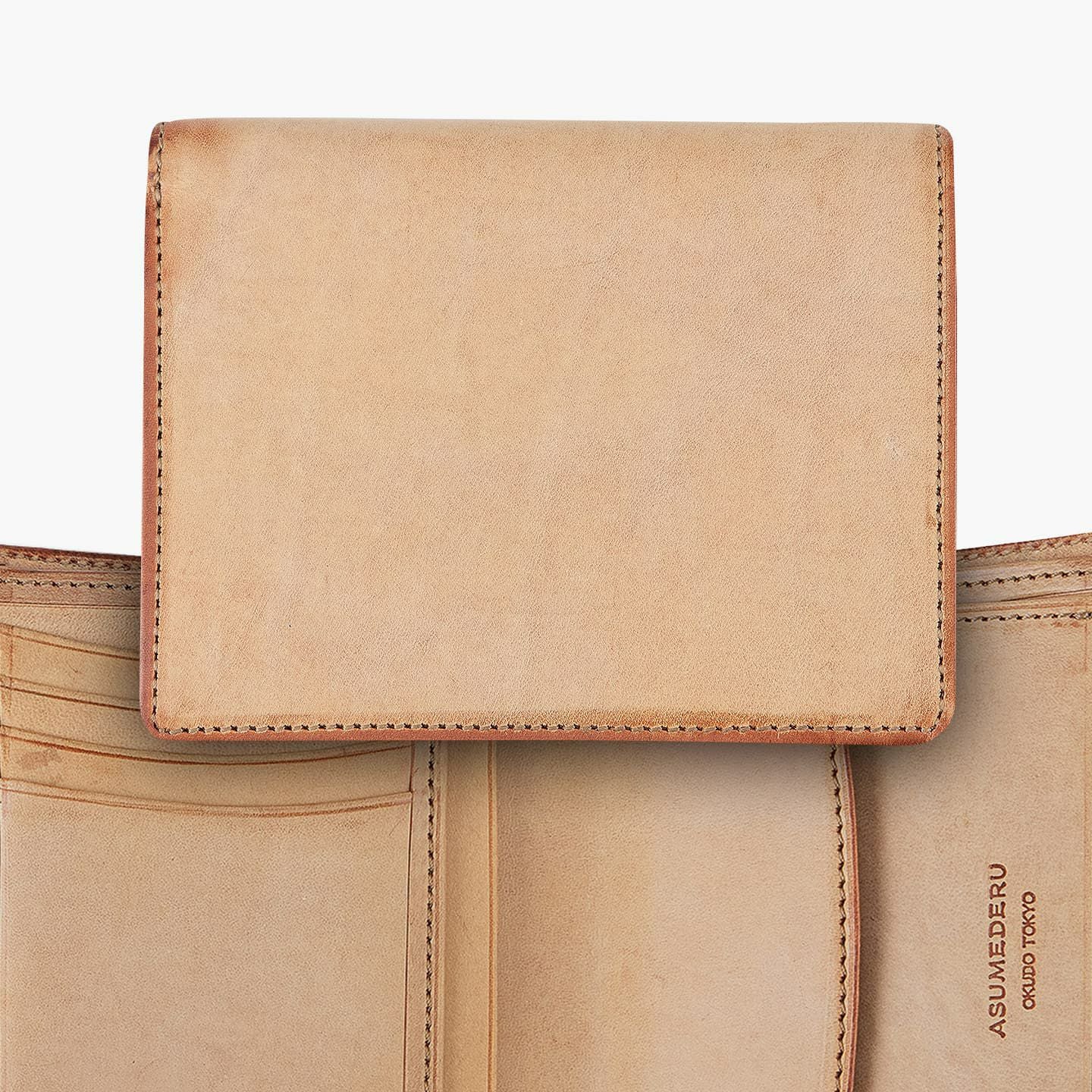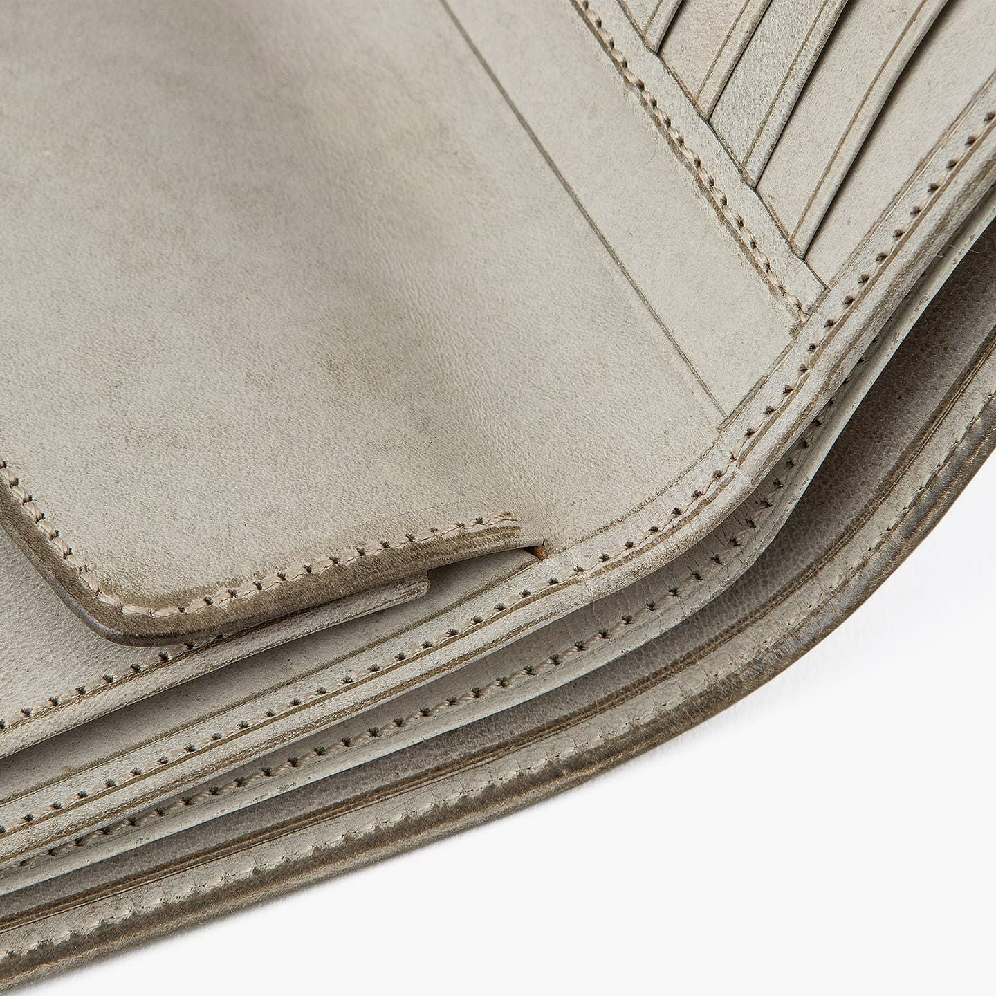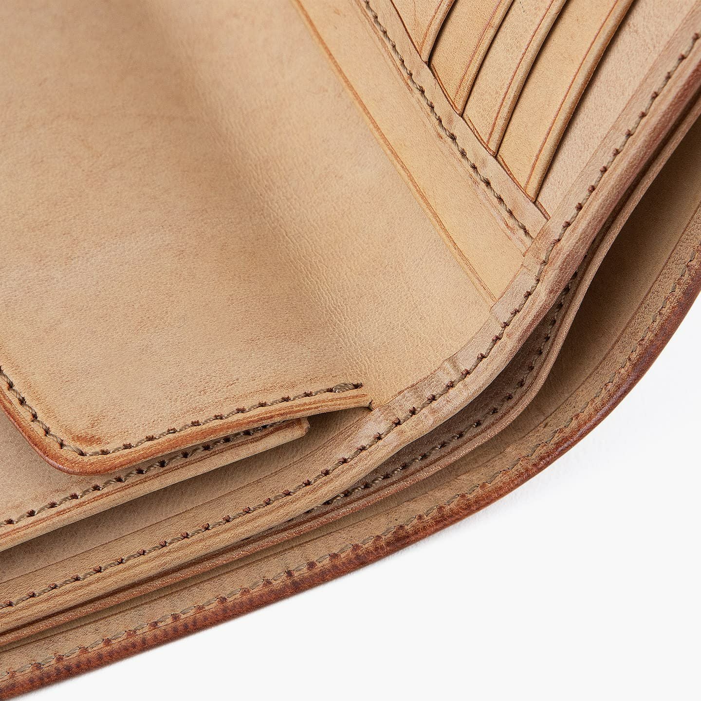 イタリア・トスカーナ地方サンタクローチェ地区のタンナー、イタルペル社製の「トゥクソン・ワックス」。繊維密度が高く丈夫なダブルショルダー(成牛の肩部)を用い、伝統的なバケッタ製法で作られたフルベジタブルタンニン鞣し牛革の表皮に、時間をかけてパラフィンワックスを垂らしながら仕上げています。バームクーヘンの作り方のように、ロールにして回しながら上からワックスを滴下していく技法で、回転させる加減により常温時に白くなるワックスが白い濃淡が生まれて、個性的な表情を創出。使用前の淡白い風合いと、使い込んで革色の浮き出てきた風合いが、劇的に変化する個性的な素材で、ワックスが革の内部に溶け込んで、革だけでは表現できない独特なツヤが魅力です。また、ダブルショルダーは首に近い部位でもあるので、“トラ目”と呼ばれる原皮のシワも味として残ることがあり、アイテムとして新たな楽しみ方も見つけられます。