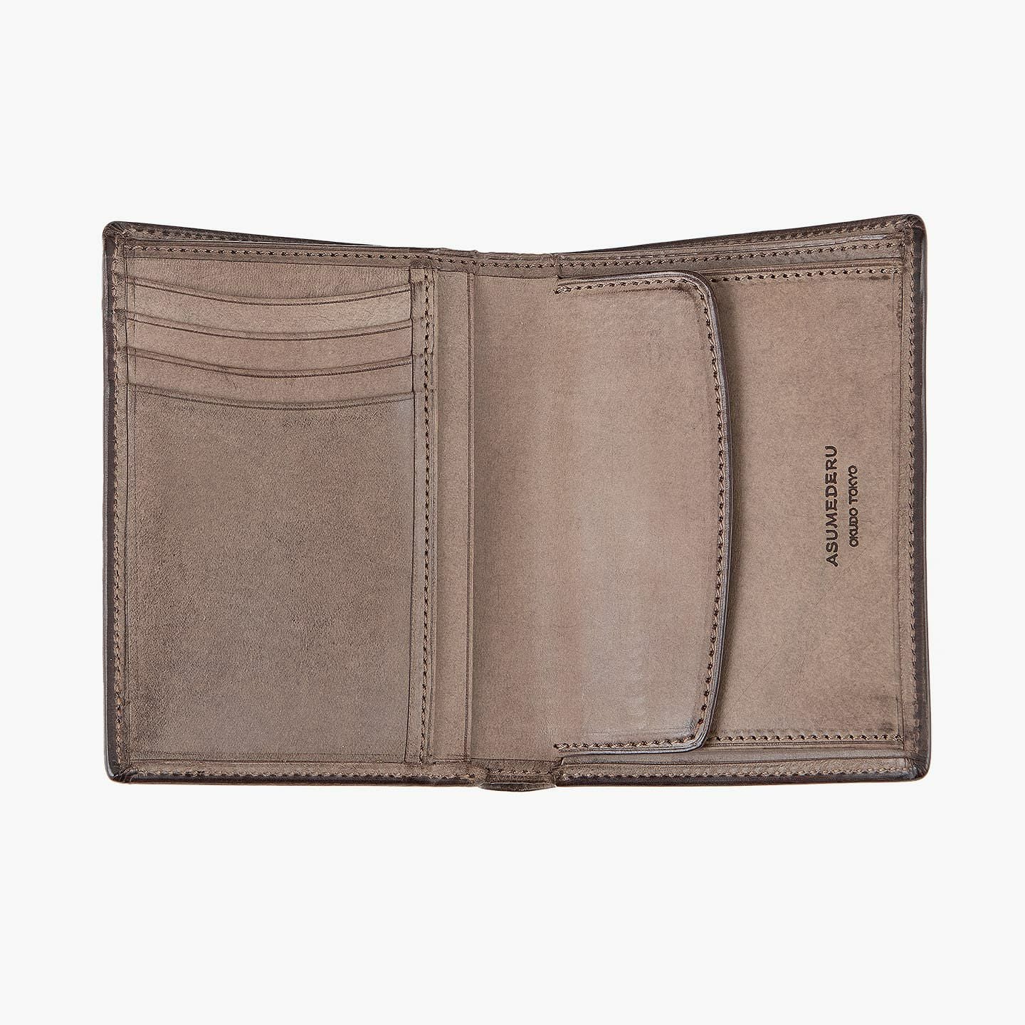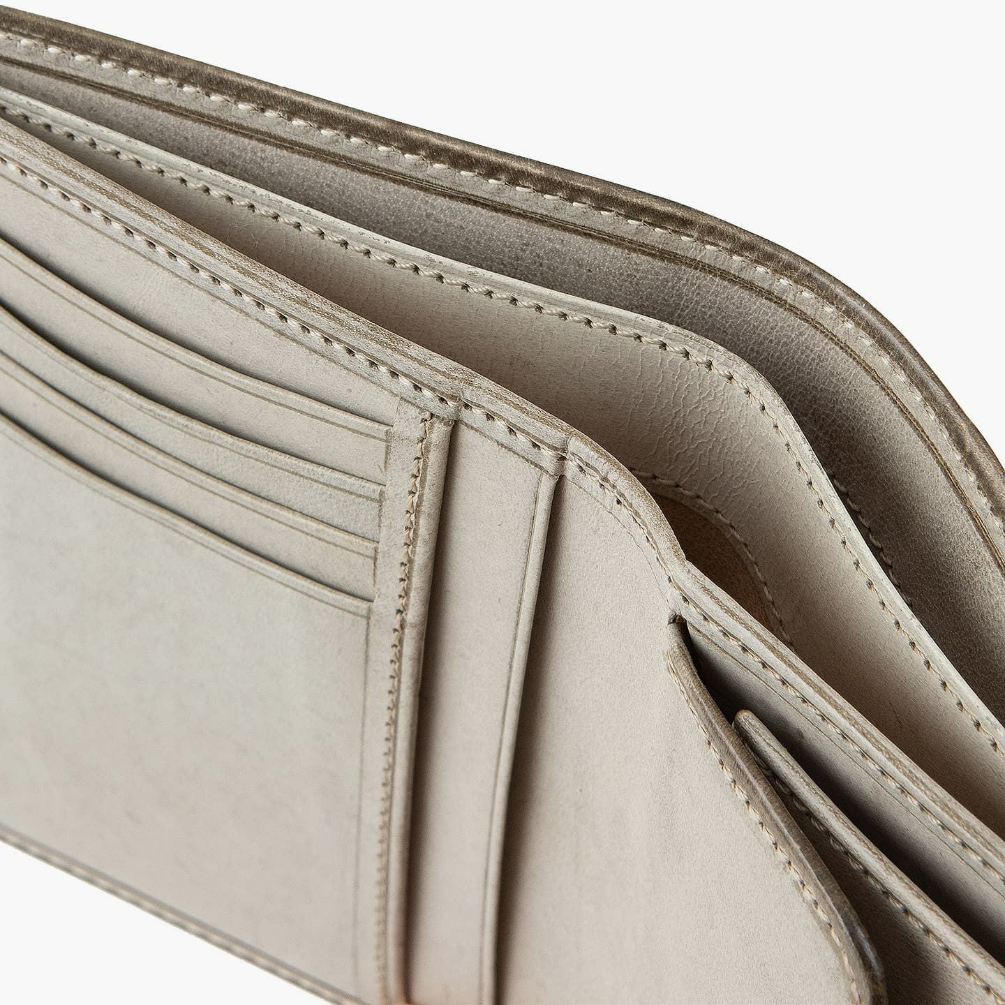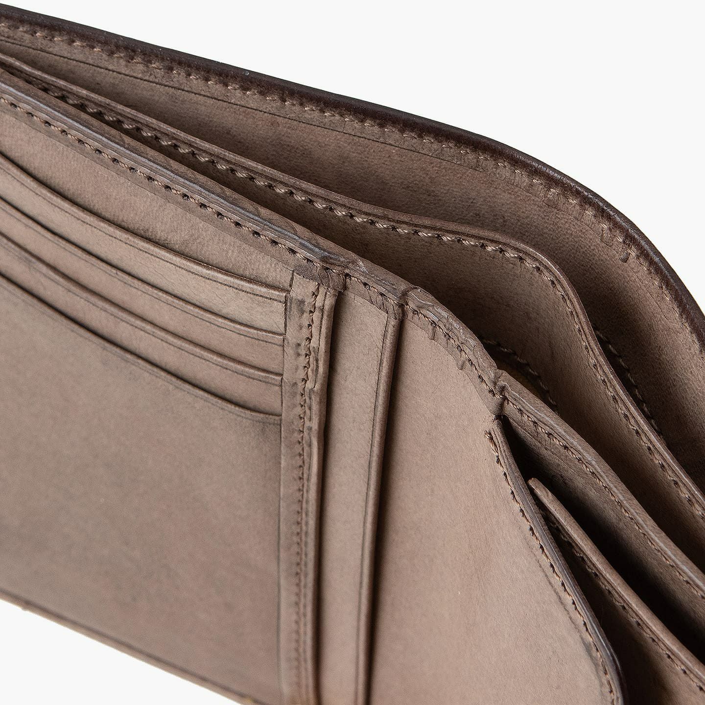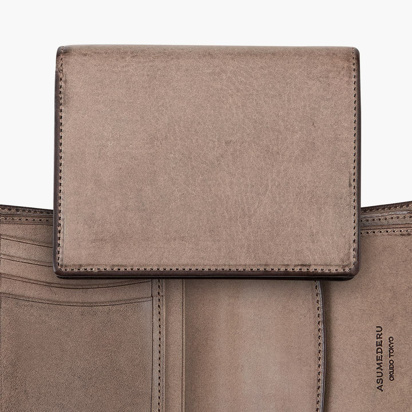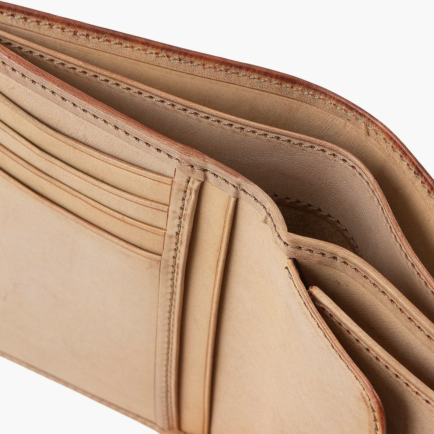 イタリア・トスカーナ地方サンタクローチェ地区のタンナー、イタルペル社製の「トゥクソン・ワックス」。繊維密度が高く丈夫なダブルショルダー(成牛の肩部)を用い、伝統的なバケッタ製法で作られたフルベジタブルタンニン鞣し牛革の表皮に、時間をかけてパラフィンワックスを垂らしながら仕上げています。バームクーヘンの作り方のように、ロールにして回しながら上からワックスを滴下していく技法で、回転させる加減により常温時に白くなるワックスが白い濃淡が生まれて、個性的な表情を創出。使用前の淡白い風合いと、使い込んで革色の浮き出てきた風合いが、劇的に変化する個性的な素材で、ワックスが革の内部に溶け込んで、革だけでは表現できない独特なツヤが魅力です。また、ダブルショルダーは首に近い部位でもあるので、“トラ目”と呼ばれる原皮のシワも味として残ることがあり、アイテムとして新たな楽しみ方も見つけられます。