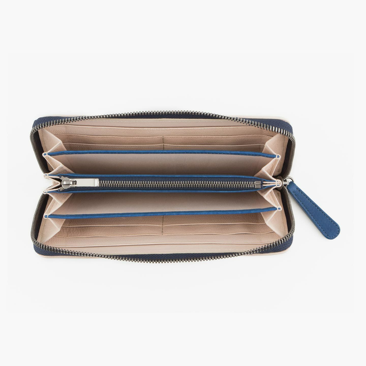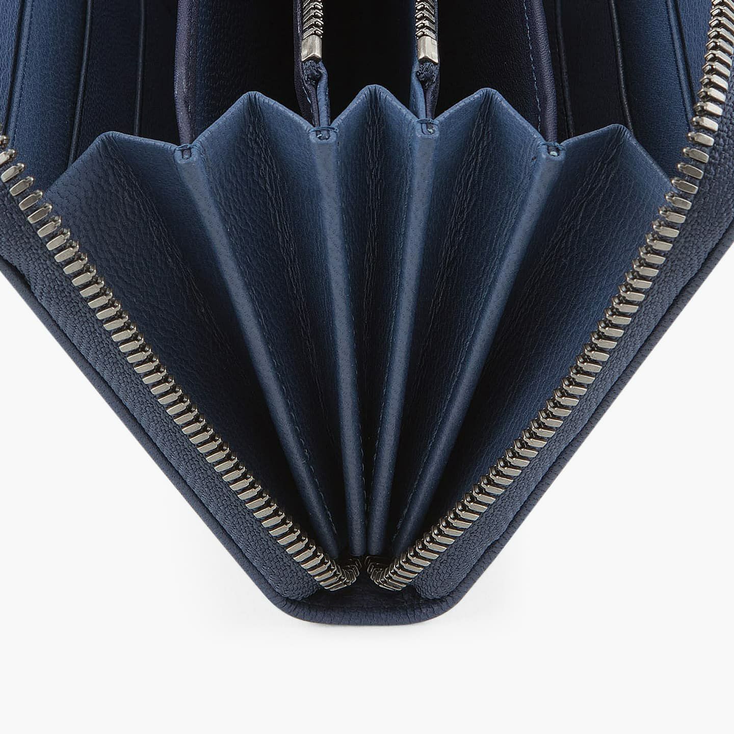財布の内外ともに素材感があり、デザインの統一性も重視するため、あえてヌバックゴート革の銀面ではない裏面を使用。エイジングにより、手の脂などが染み込み、使うごとに自然なツヤが楽しめます。山羊革自体は、個性的な凹凸をしたシボと、独特な毛穴の形状が特長。薄くても丈夫で、型崩れしにくい特性があるため、高級レザー手袋やブランドのレザーシューズに使われることが多い素材です。また、しなやかで耐久性にも優れているので、身に付けるものやジャケットなどにも多く利用。アメリカ空軍がA-10フライトフローブ、アメリカ海軍がフライトジャケット(M-422)に使っていたことでも知られています。