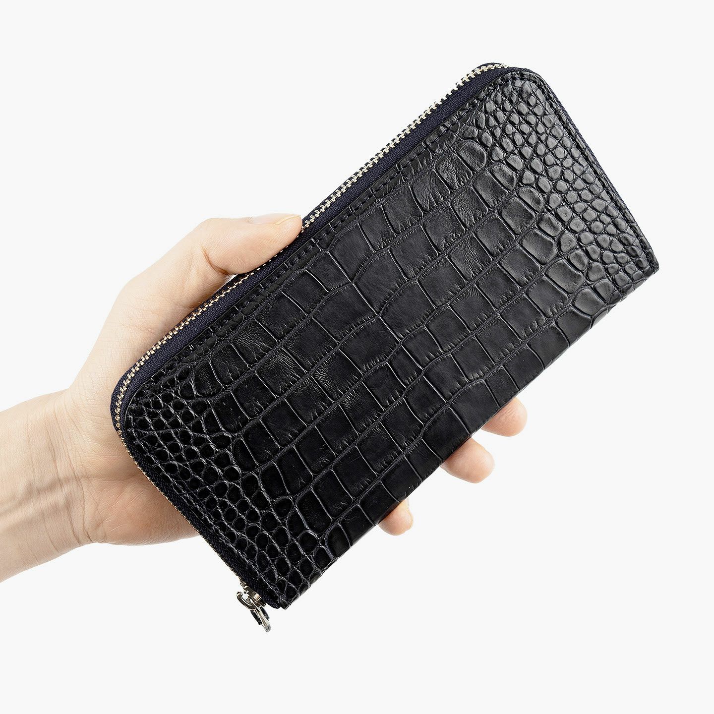 真の絶対価値を追求するために、すべてのパーツ・工程に独自の価値基準を設け、唯一無二のモノづくりにこだわっている、エキゾチックレザー専業ブランド『LE’SAC』のラウンドジップ長財布。上質な斑のバランスが美しいワニ革「アリゲーター」の人気色Navyを、外装として纏わせた比類なき高級感が、それを引き立てるファスナーのシルバーとともに、独特の贅沢感と満足感を醸成。ファスナー式小銭入れをセンターにしたシンメトリーデザインの内装は、札入れ2・カードポケット12・フリーポケット2の優れた収納力を装備するとともに、ダークブラウンの上質な牛革が、落ち着きのあるマットな風合いで、大人の上品さを奏でてくれます。