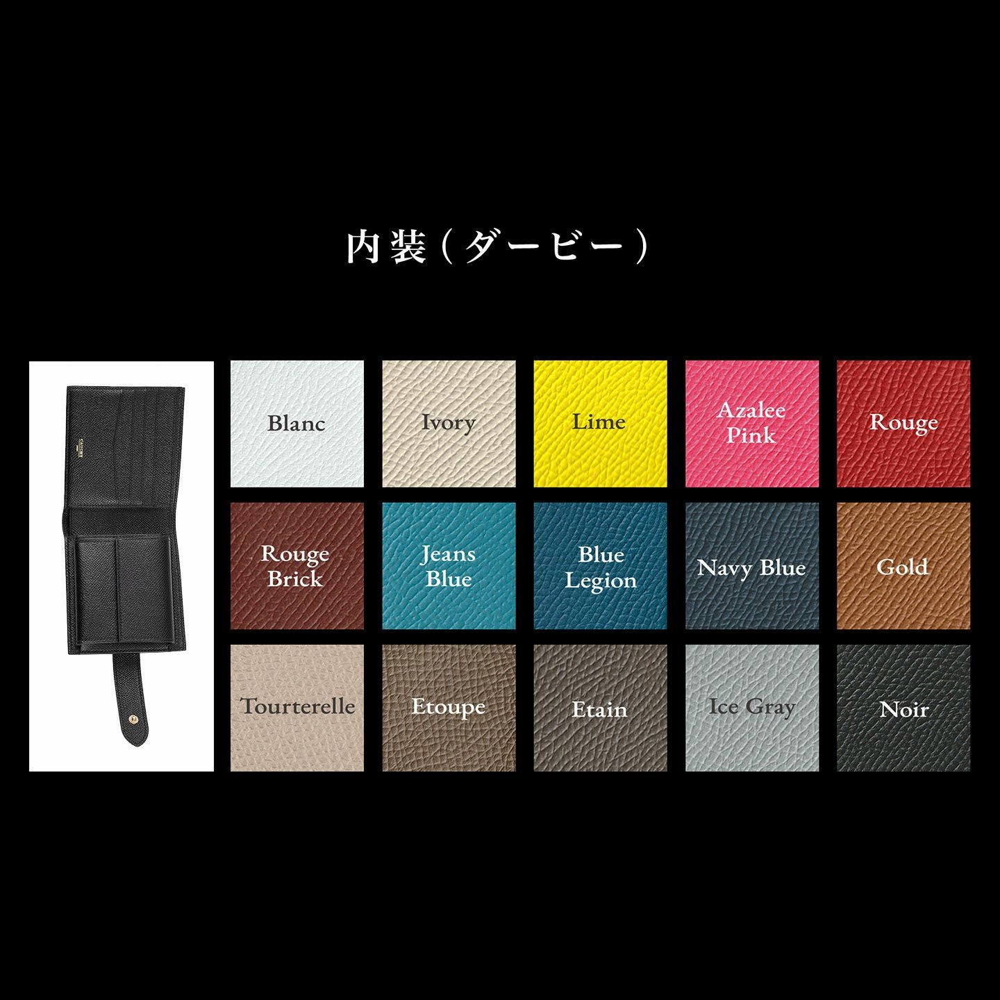 外装・内装ともに、細かく型押しされた質感が美しく、軽量で小キズ・水分にも強い「ダービー」を採用。ラインナップしているブランドチョイスの6色から、外装・内装それぞれのカラーをセレクトできるので、単色にすることもバイカラーにすることも可能で、好きなカラーリングを楽しむことができます。また、ホックは、Silver/Goldのいずれかから選ぶことができて、内装に刻印されるロゴも同じ銀箔/金箔を採用。さらに、7カラーからセレクトできる糸色は、外装・内装の「ダービー」と同系色でまとめることも、アクセントとして差し色的にも仕立てられ、自分のオリジナルのような配色でセレクトオーダーできるのも魅力です。