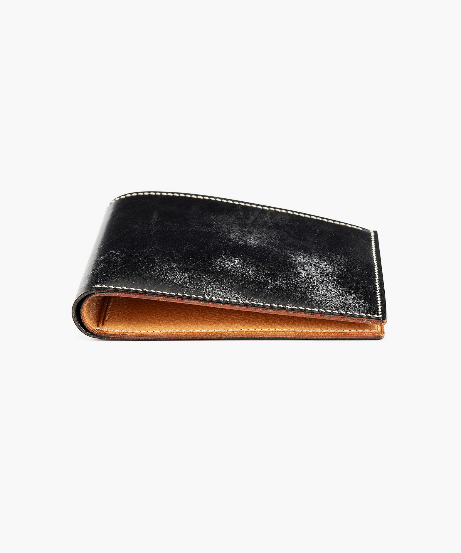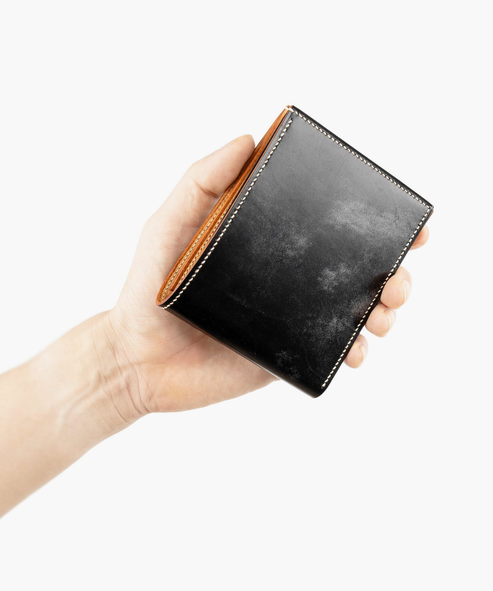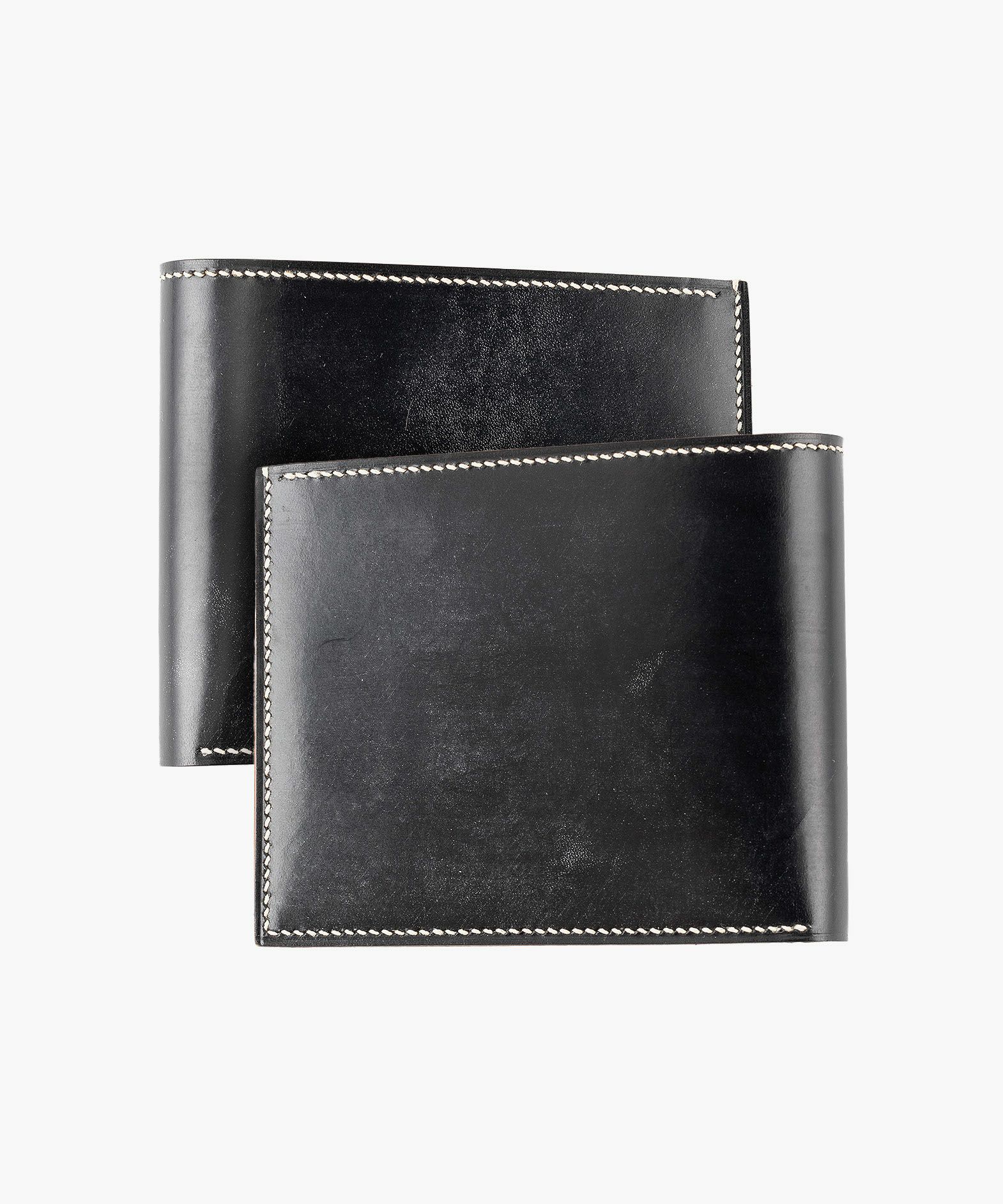 コンパクトでスリムな設計ながら、センターの高さを外装と内装で少し変えるなど、使いやすさにもこだわった、二つ折り財布“モンテローザ 1.1”。ブルームと呼ばれる白い粉が印象的な、イギリス・セドウィック社製「ブライドル」のBlackを外装に纏わせ、使い込むほどに美しいツヤ肌へと経年変化していくのも魅力。内装には、マットで自然なシボが美しい、イタリア・バダラッシカルロ社製「ミネルバボックス」のNaturalを採用し、質感・カラーともに外装との相性が抜群で、互いに引き立て合う佇まいへ。そして、それらの絶妙な組み合わせを、総手縫いによるWhiteステッチが縁取ることで、さらなる高品位なアイテムへと昇華。さりげない洒落感と使い心地が、手にするたびに満足感と愛着感を抱かせてくれる。
