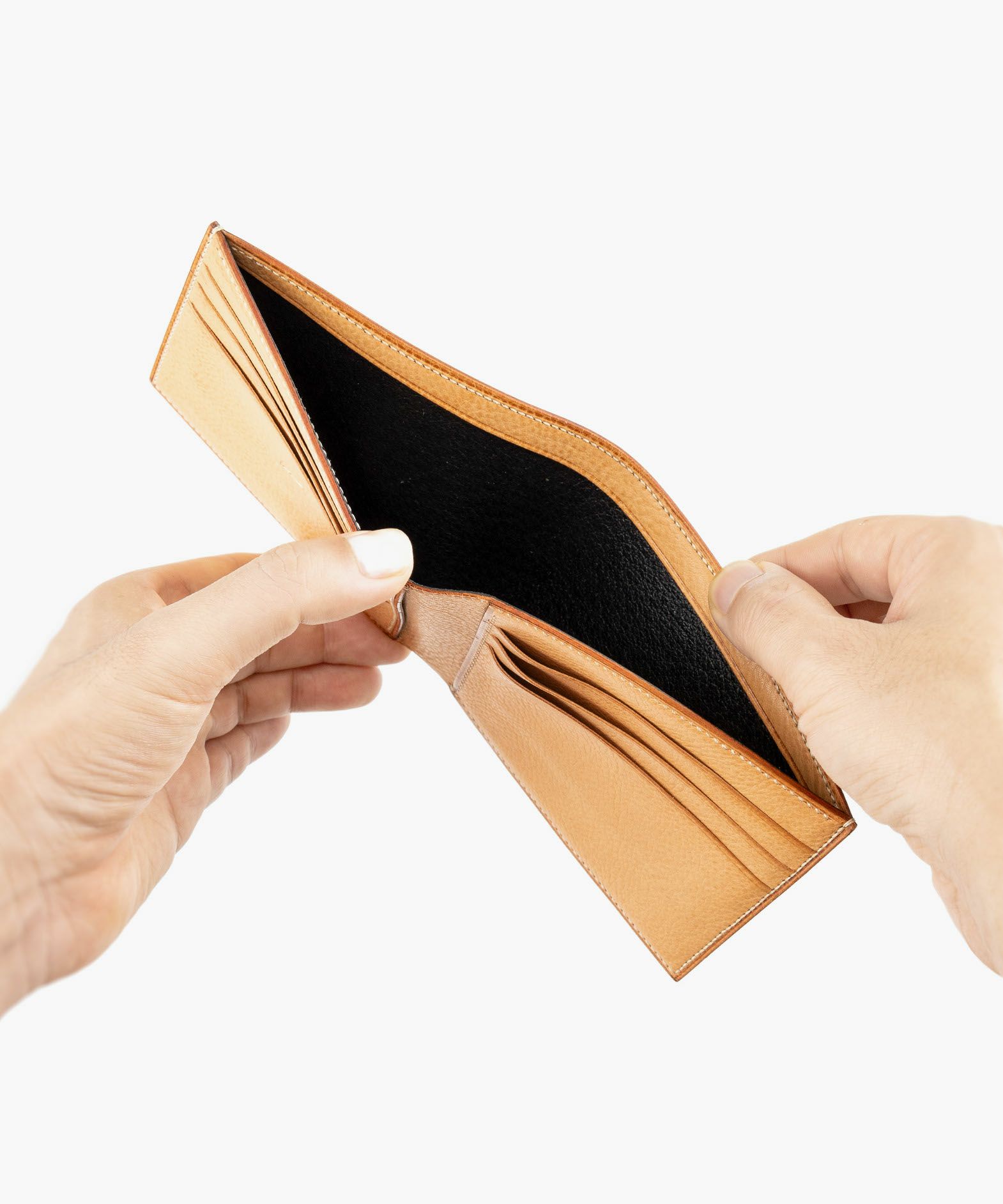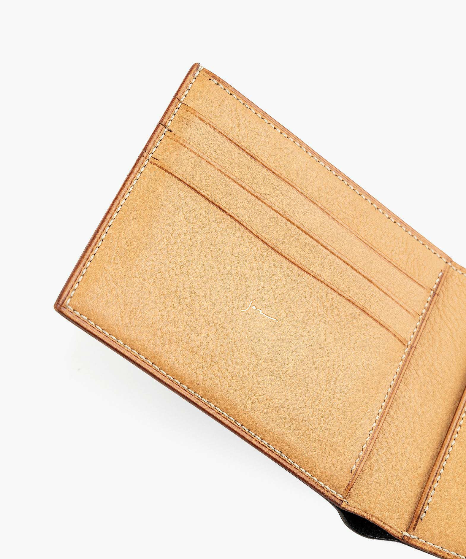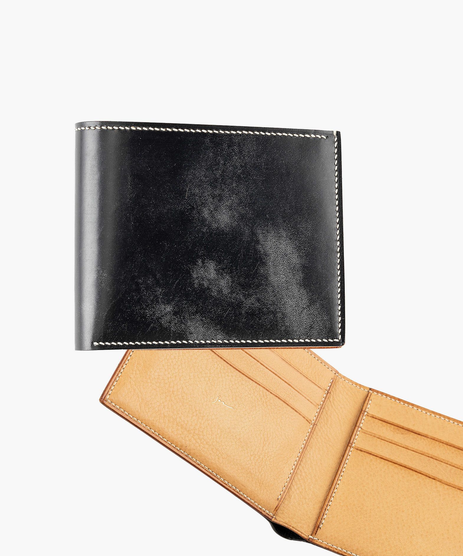 コンパクトでスリムな設計ながら、センターの高さを外装と内装で少し変えるなど、使いやすさにもこだわった、二つ折り財布“モンテローザ 1.1”。ブルームと呼ばれる白い粉が印象的な、イギリス・セドウィック社製「ブライドル」のBlackを外装に纏わせ、使い込むほどに美しいツヤ肌へと経年変化していくのも魅力。内装には、マットで自然なシボが美しい、イタリア・バダラッシカルロ社製「ミネルバボックス」のNaturalを採用し、質感・カラーともに外装との相性が抜群で、互いに引き立て合う佇まいへ。そして、それらの絶妙な組み合わせを、総手縫いによるWhiteステッチが縁取ることで、さらなる高品位なアイテムへと昇華。さりげない洒落感と使い心地が、手にするたびに満足感と愛着感を抱かせてくれる。