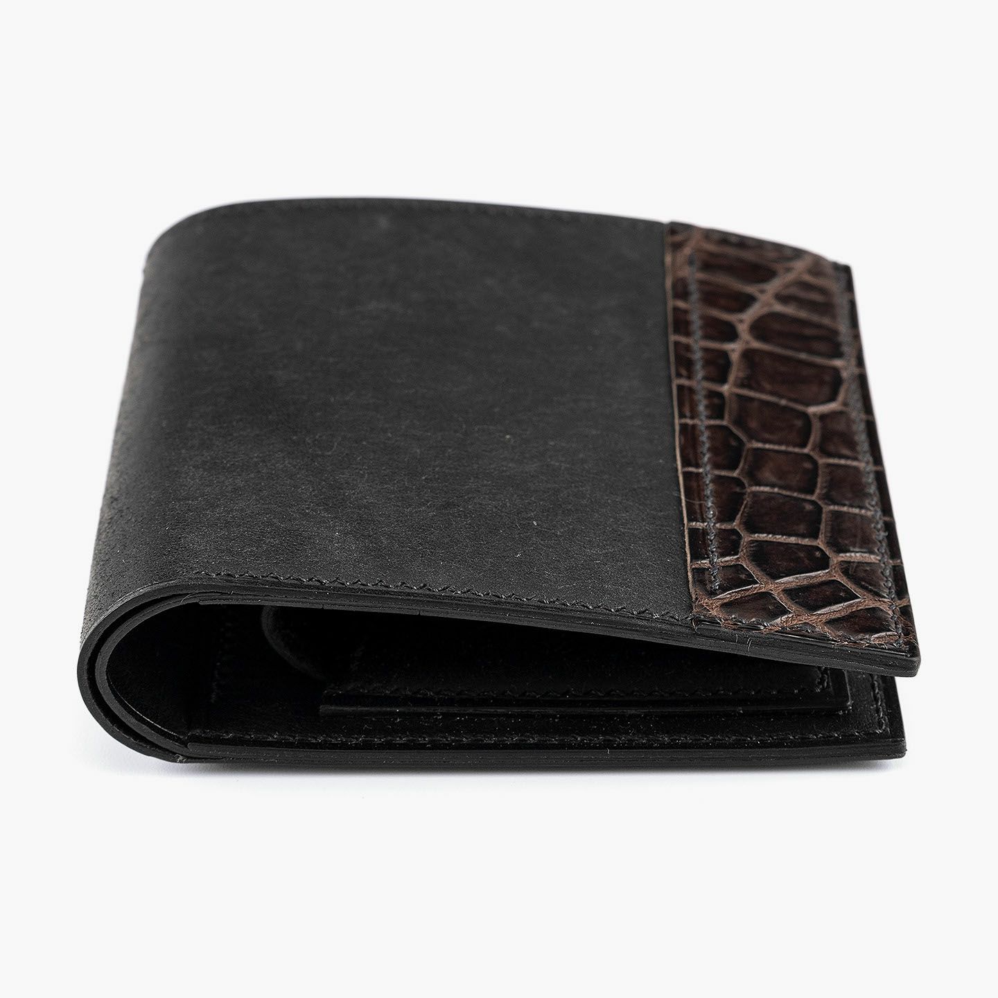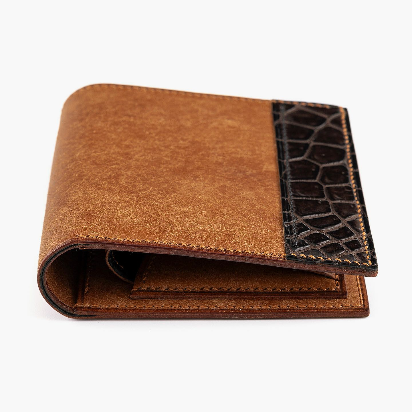 外装のアクセントとして高級エキゾチックレザー「クロコダイル」を纏わせ、コンパクトなサイズ感ながら存在感を漂わせている、二つ折り財布(小銭入れ付き)“ワイスホルン 1.1”。その腑模様とは相反する外装・内装の「プエブロ」は、和紙のように表面を起毛させた独特の風合いを醸しながら、ビンテージ感あふれる美しいツヤ肌へと経年変化していく楽しみも。曲線を施したカードポケットのカットラインが、見た目のデザイン性と出し入れしやすい機能性を両立。そのカードユニットの最下段には、内装のアクセントとしてホワイトワックス仕上げを施した「ブーロ」を採用。使い込むほどに内装と同系色の色味が露出していき、「プエブロ」とは異なるエイジングへ。外装・内装それぞれ異なるアクセントが、独創的な感性を演出してくれる。