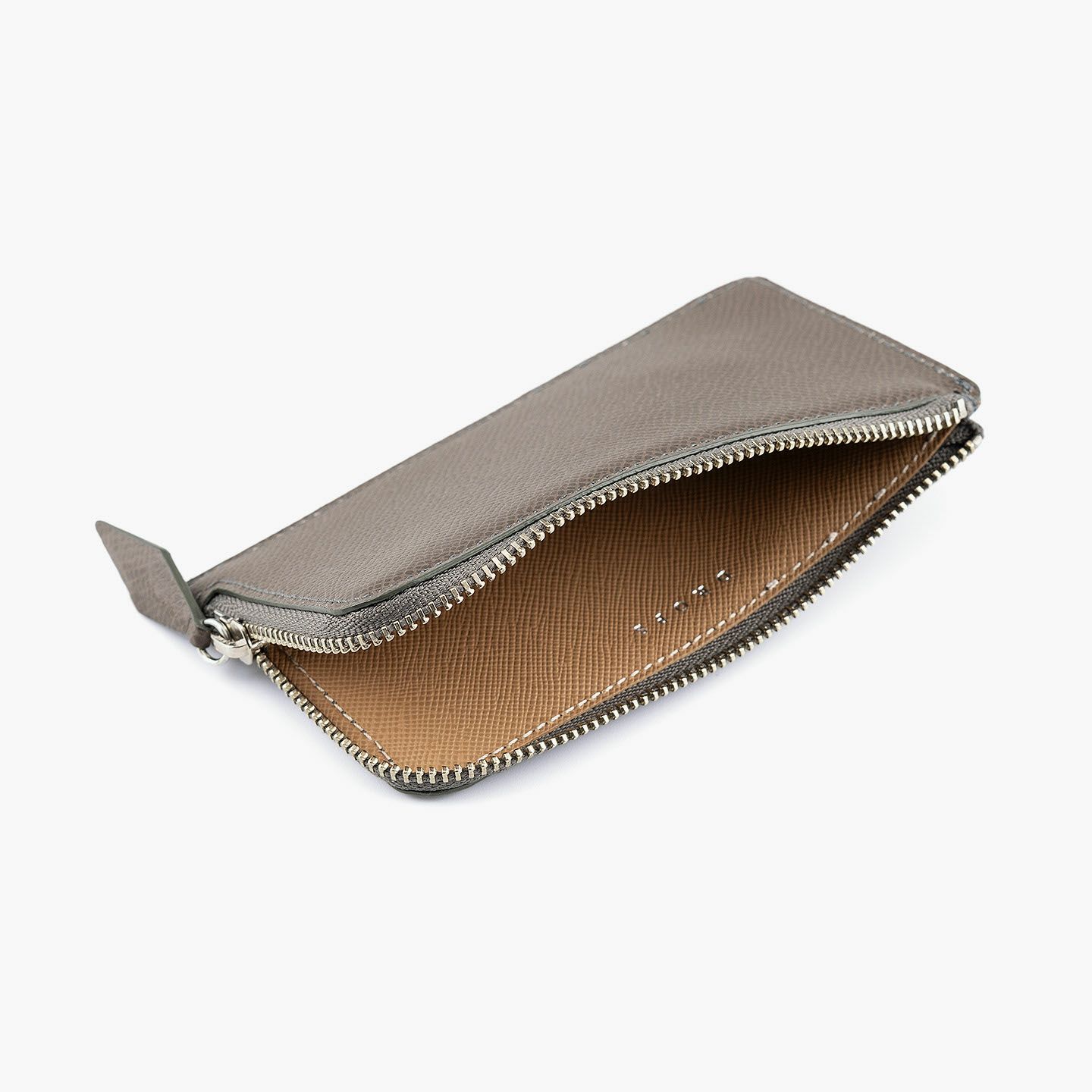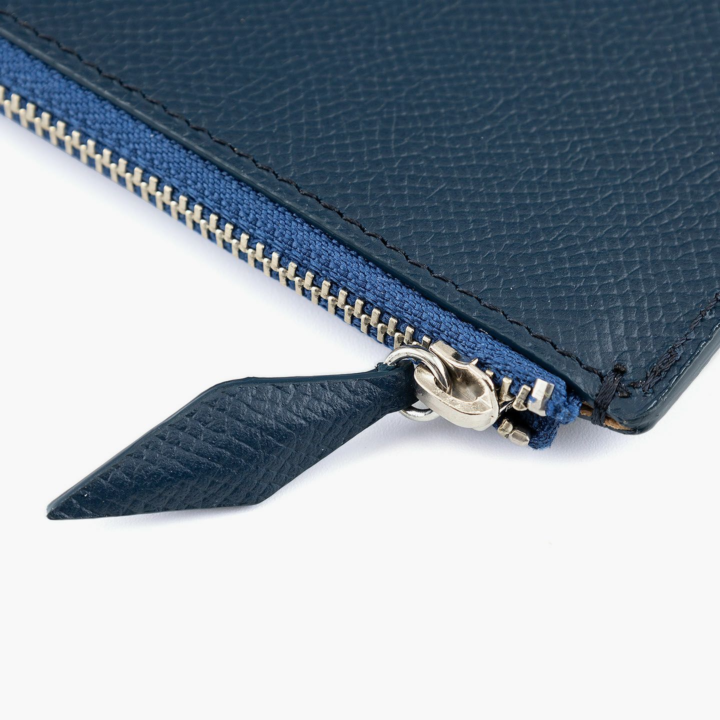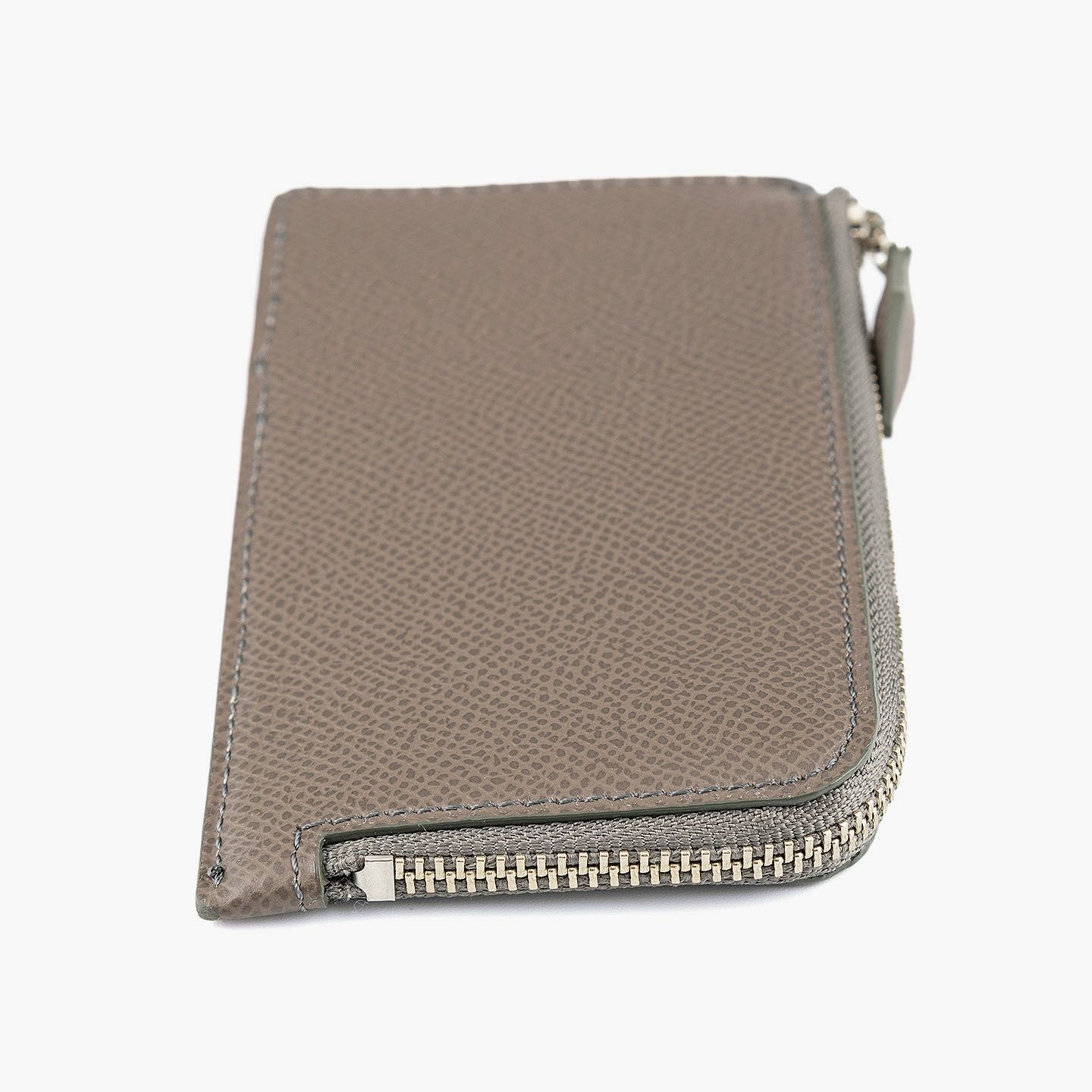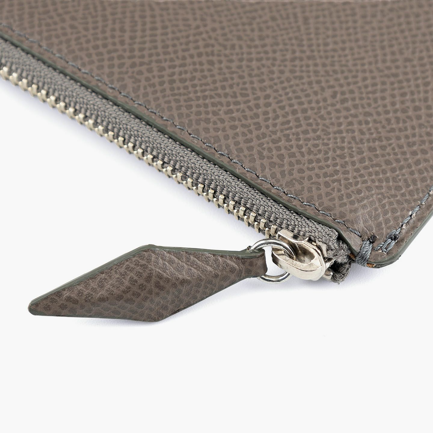 ヨーロッパの有名老舗メゾンにも人気がある、フランス・アース社製の「ダービー」を、外装として纏ったフラグメントケース。宝石のロゼンジカットを模した引き手にも、同じマテリアルを象徴的にあしらい小粋なアクセントに。細かな型押しのマットな表情が、小石模様の陰影を想わせる美しさとともに、小キズ・水分への強さと堅牢さで、ラフに扱える気楽さも魅力。スーツのポケットやバッグのなかに入れてもかさばらないスリムなフォルムと、カード・小銭・紙幣(三つ折り)を収納できる使いやすいサイズ感が、普段使いを楽しくしてくれるアイテムへ。気持ちを上げてくれるスタイリッシュな佇まいが、心に彩りをもたしてくれる。