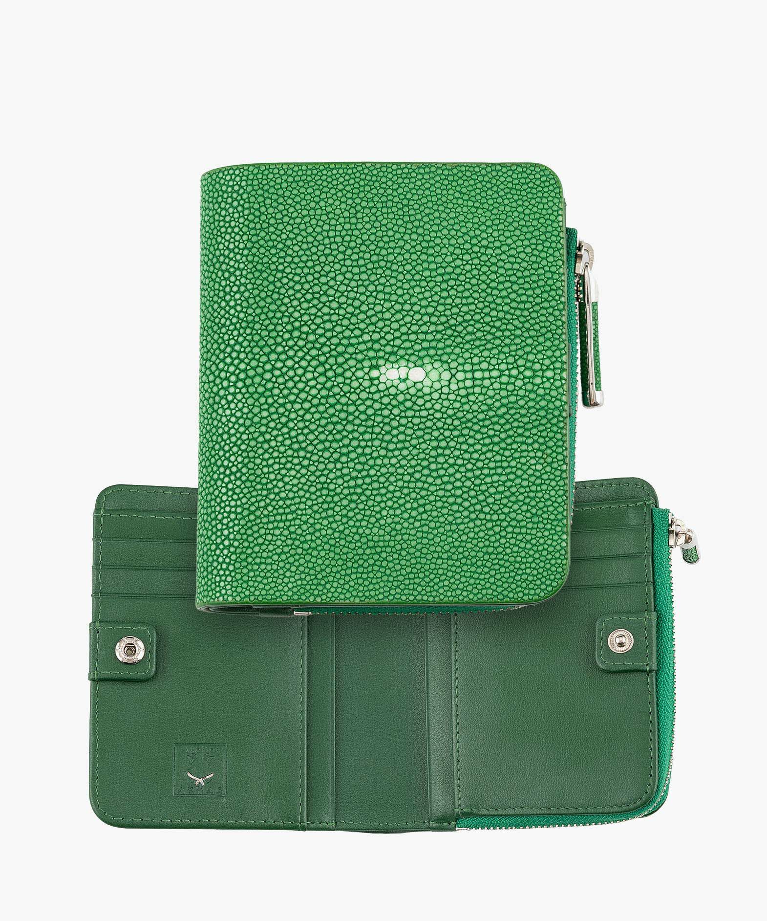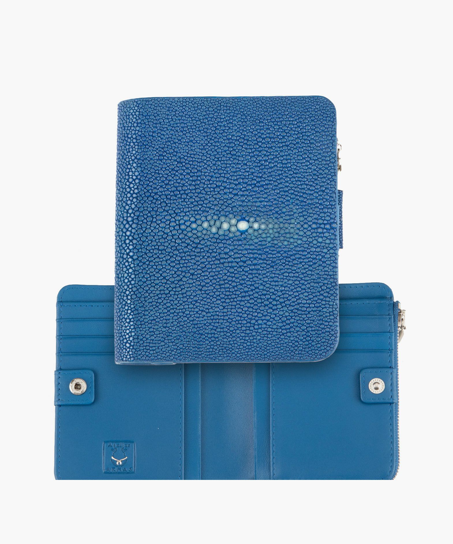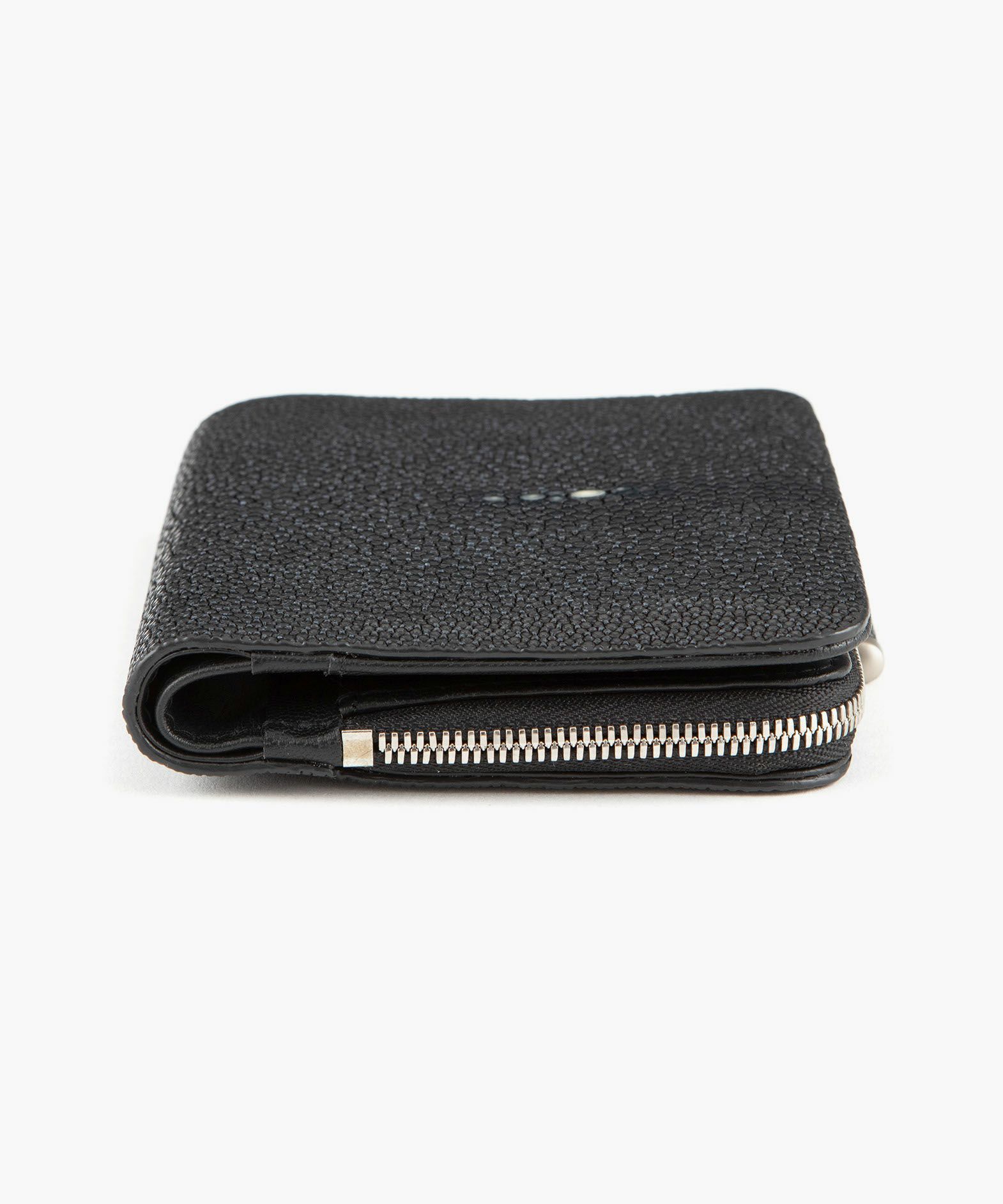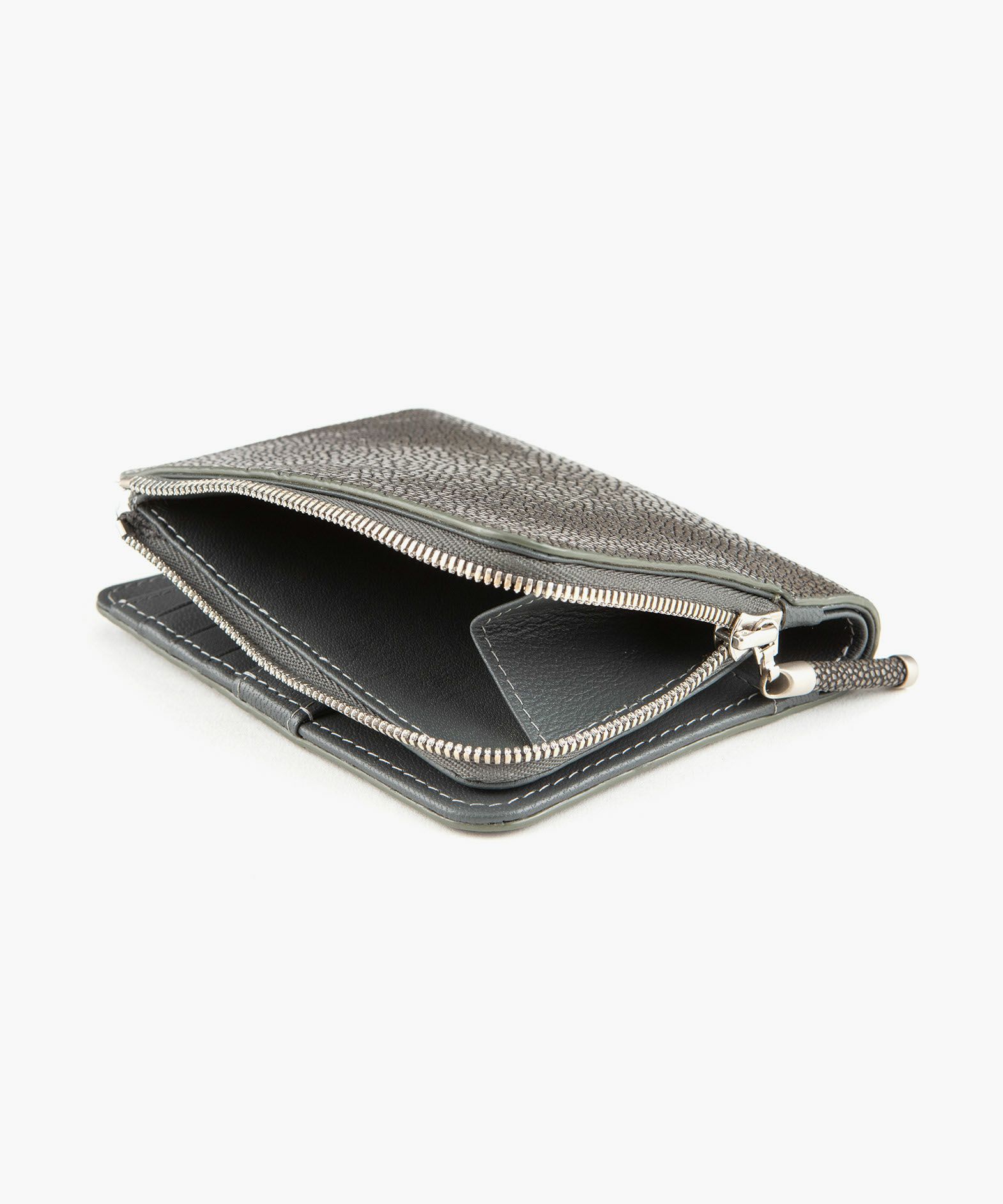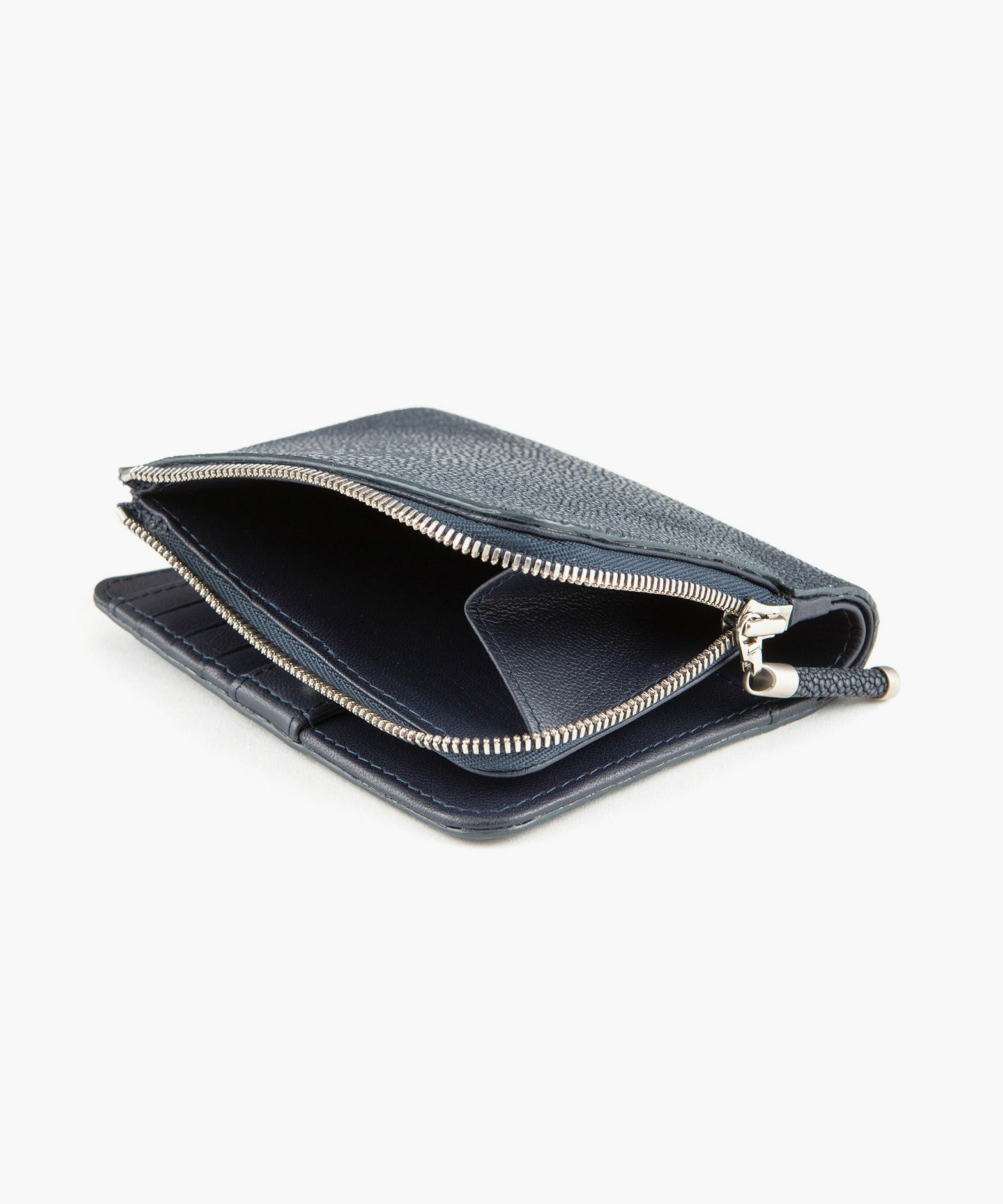 クールで洒落た人生の旅へと誘っていく、“Cuirs D'ailleurs 〜旅するレザー〜”をコンセプトにしている、ブランド『Atelier AKNAS』のミドルウォレット。ジェンダーレスで好まれるラウンドフォルムに、ガラスビーズを散りばめたようなアカエイの小さな鱗が美しい、海の宝石「ガルーシャ」を外装として贅沢に纏わせ、地中海の潮風を指先で感じるような冷んやりとした感触も魅力的。オリジナルの引き手とともにデザインのアクセントにもなっているL字ファスナー式小銭入れのほか、札入れ1つ・フリーポケット4つ・カードポケット6つも備えている充実した収納力で、普段使いにおける機能美へのこだわりも感じさせてくれる。