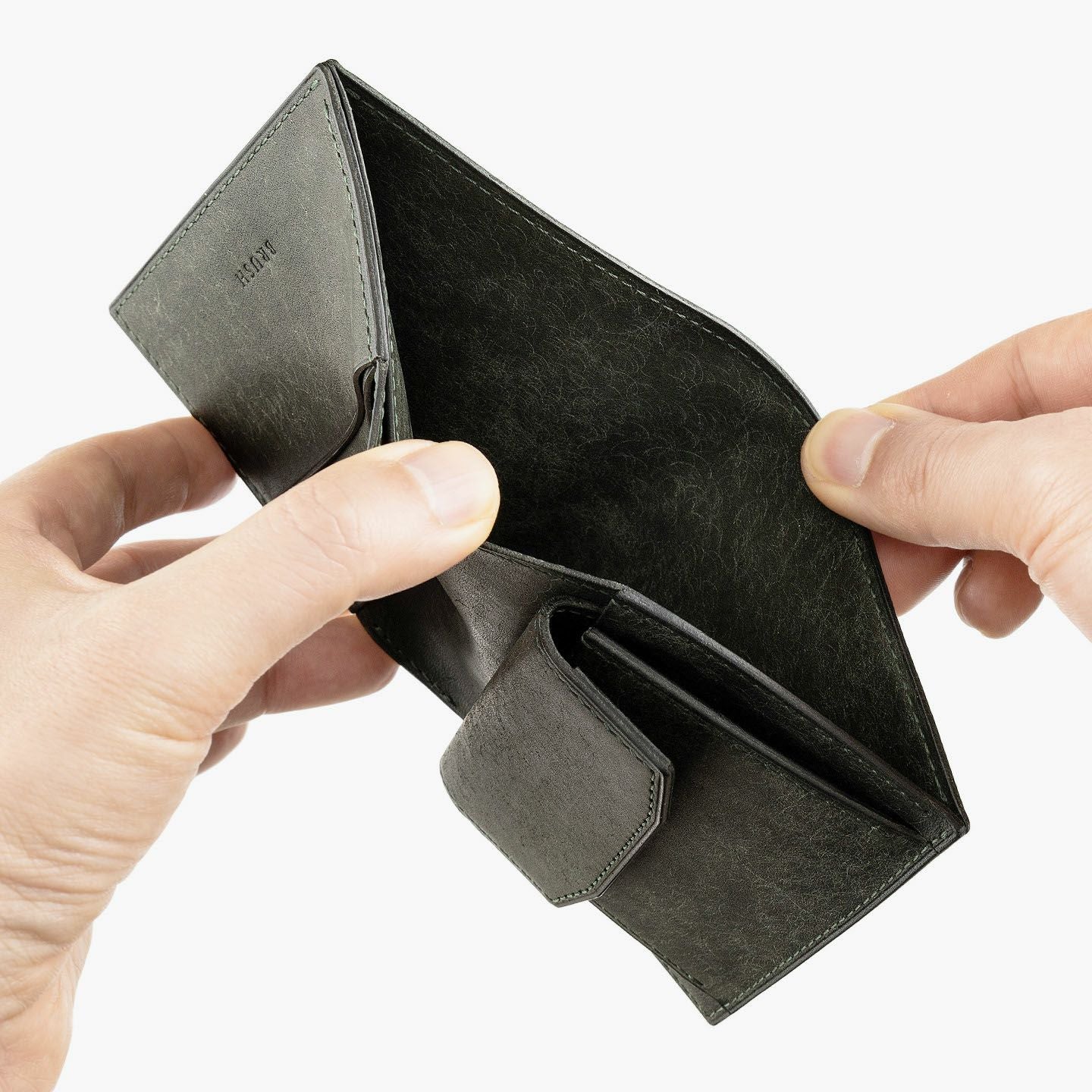 革製品の修理に携わっていた革職人・長谷川青矢が、自分でも使いたくなるような上質な革製品が欲しいという想いから立ち上げた、ブランド『BRUSH』のミニウォレット。紙幣を折らずに収納できる、ムダのないミニマム設計を追求した、一般的な二つ折り財布よりもコンパクトなサイズ感が魅力。外装は、強度・耐久性・撥水性を兼ね備えた堅牢な「ブライドル」を採用し、内装は、和紙のような風合いが味わい深い「マルゴー」、もしくは外装と同じ「ブライドル」からセレクト可能。さらに、裏地までレザーのみで仕立てた贅沢なフルレザー仕様で、丈夫で長く使える愛着感も。経年変化の楽しさとともに、相棒感も深めてくれる。