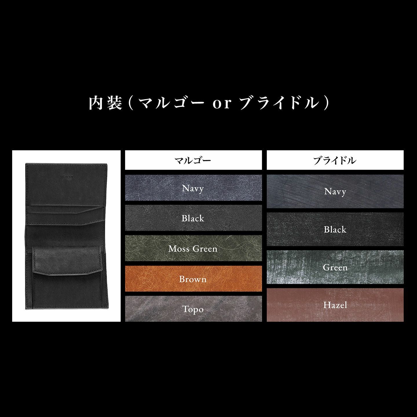 ミニマムサイズを追求したオールインワンでありながら、カード段にカードポケット2つ、その裏に挟んで収納するアオリポケット1つ、小銭入れ裏にフリーポケット1つを装備。見える部分を手縫い、見えない部分をミシン縫いにする、適材適所で使い分けている丁寧な縫製や、特に手間暇を掛けて注力し、滑らかな手触りを実現しているコバなど、細部の美しさ・強さも実現しています。さらに、「ブライドル」は4色から、「マルゴー」は5色から、小銭入れホックはSilver/Goldのいずれかから、それぞれのセレクトでき、糸色は内装と同じカラーで統一。オリジナルアイテムのような受注生産で、自分らしさを表現できます。