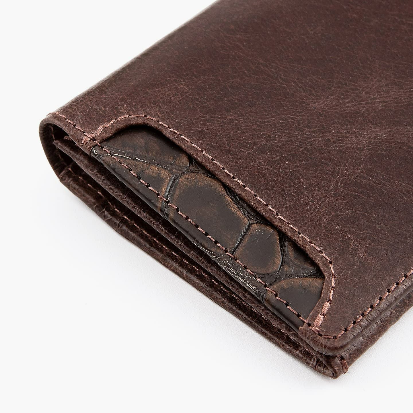 使い込むほどに深みが増す、質感と愛着感ある長財布。クロコダイルの挿しレザーによる、洒落た風合いを。